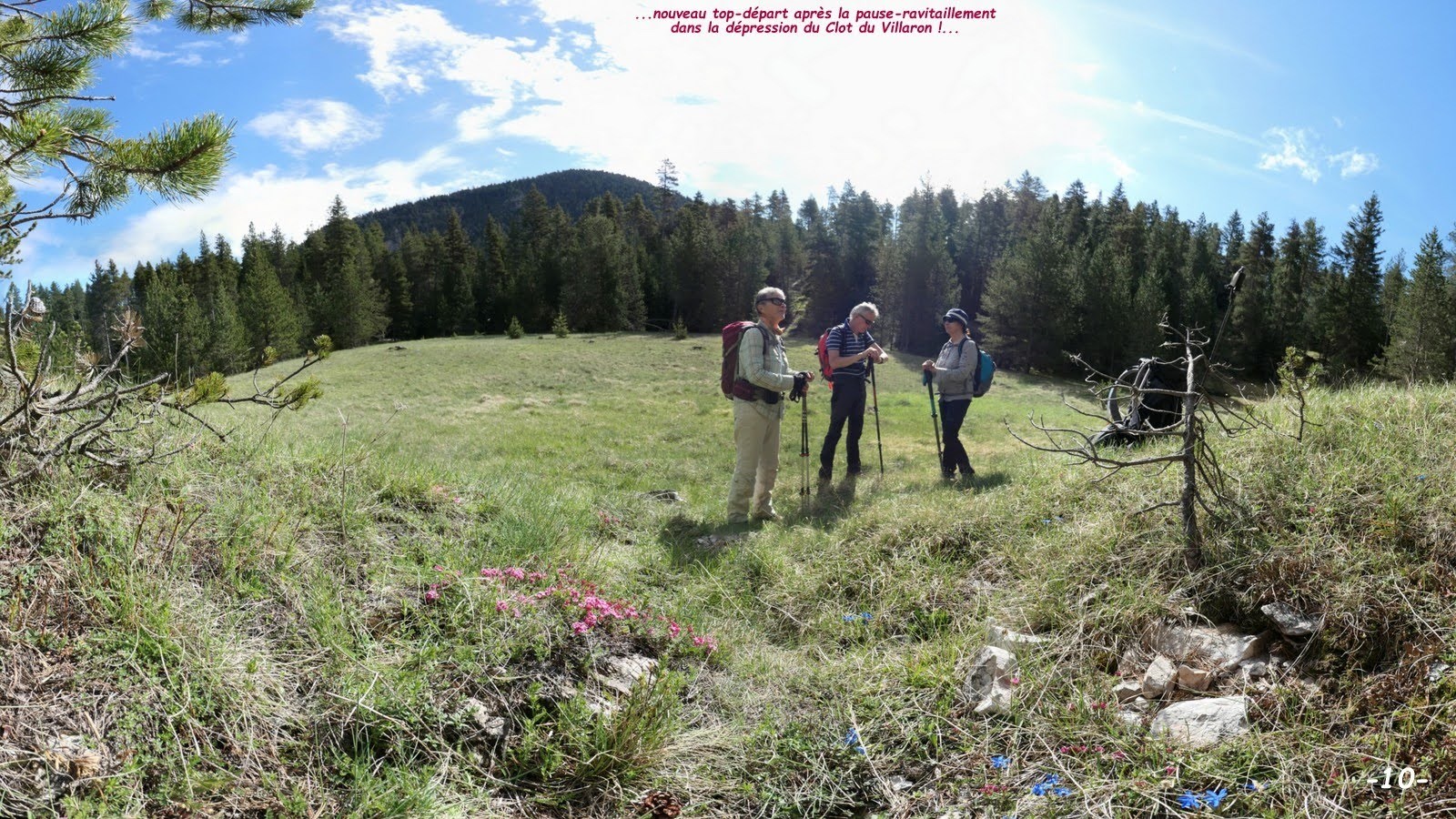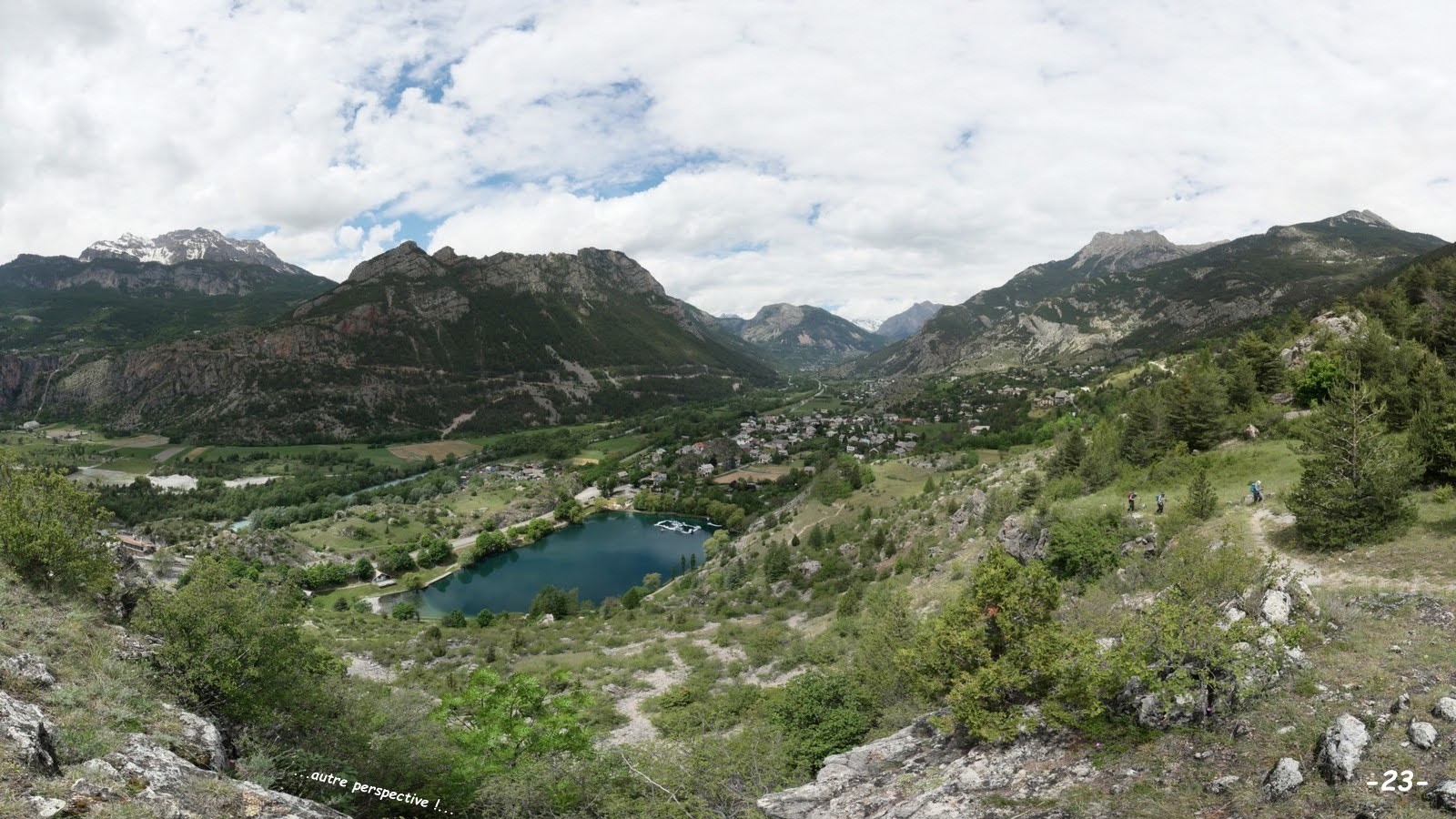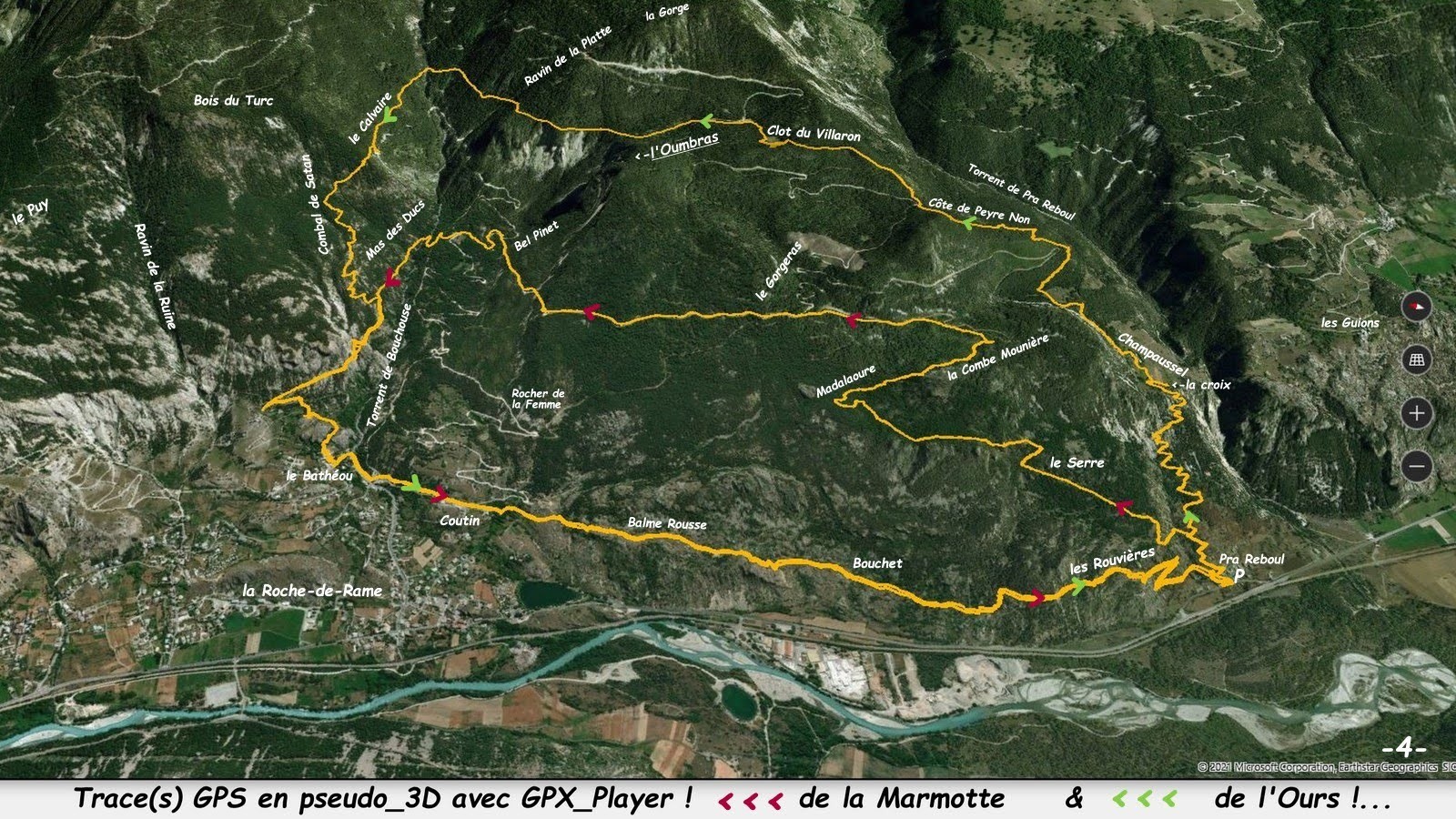 depuis le petit parking à l'entrée Nord de Pra Reboul > Champaussel par son excellent sentier historique sans oublier l'aller-retour au belvédère de la croix avec son beau panorama sur cette partie de la Vallée de la Durance > Côte de Peyre Non > Clot du Villaron par le raccourci hors sentier, mais par une excellente sente sur sa croupe Sud-Ouest (Nord-Est en montant bien évidemment !) (la visite de sa dépression herbeuse peut être intéressante en toutes saisons !) > le sentier du Ravin de la Platte > il traverse le Torrent de Bouchouse par la très large et solide passerelle de son captage hydroélectrique > le Calvaire > Combal de Satan par le Mas des Ducs > le Bathéou > Coutin > Balme Rousse > Bouchet > les Rouvières > retour parking.