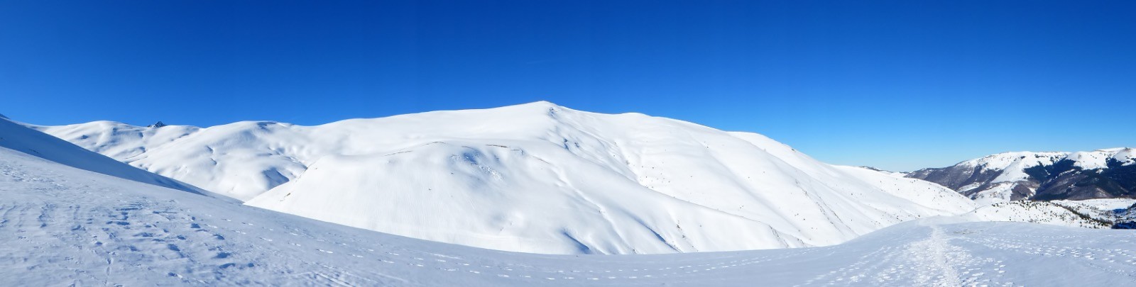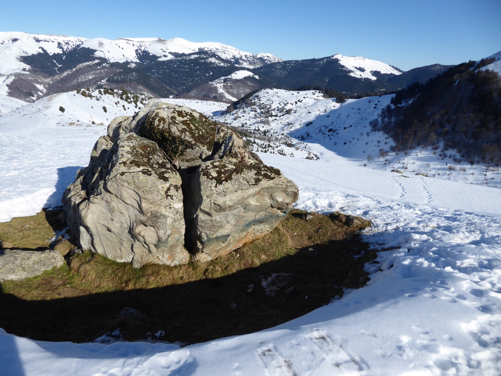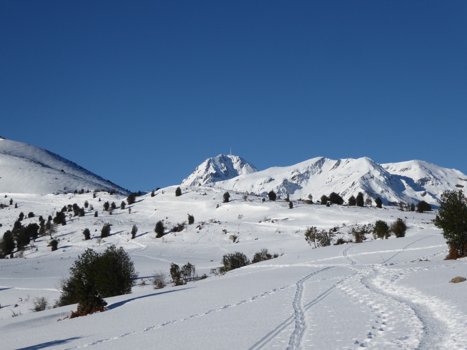 Une grosse couche de neige s'est posée sur les montagnes , ici nous avons près d'un mètre à certains endroits. Au-dessus du Cap de Camiet une congère de1,40 bloque le sentier de départ aux Esclozes. Le temps est magnifique et le Pic du Midi majestueux ainsi que le Coste Oueillère, le Monfaucon, et l'Arbizon, le Soum de Marianette la Bèque... où évoluent des skieurs.