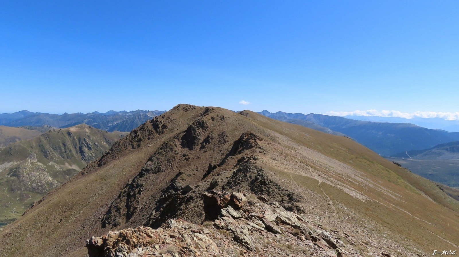 Suivre le fil de la crête sans difficulté particulière jusqu'au Coll dels Clots*. J'ai poursuivi au-delà du col, 600 mètres environ, pour atteindre le point où la ligne frontière plonge jusqu'au lit de l'Ariège. La pente est très raide, j'ai préféré revenir un peu vers le Coll dels Clots, 300 m environ et descendre par une portion moins accentuée pour revenir sur la ligne frontière au niveau de la Font de la Palomera. A part l'herbe haute peu agréable à la marche, la descente est beaucoup plus sûre. Quelques mètres avant d'atteindre l'Ariège prendre sur la gauche une piste rejoignant la route pour revenir au point de départ.