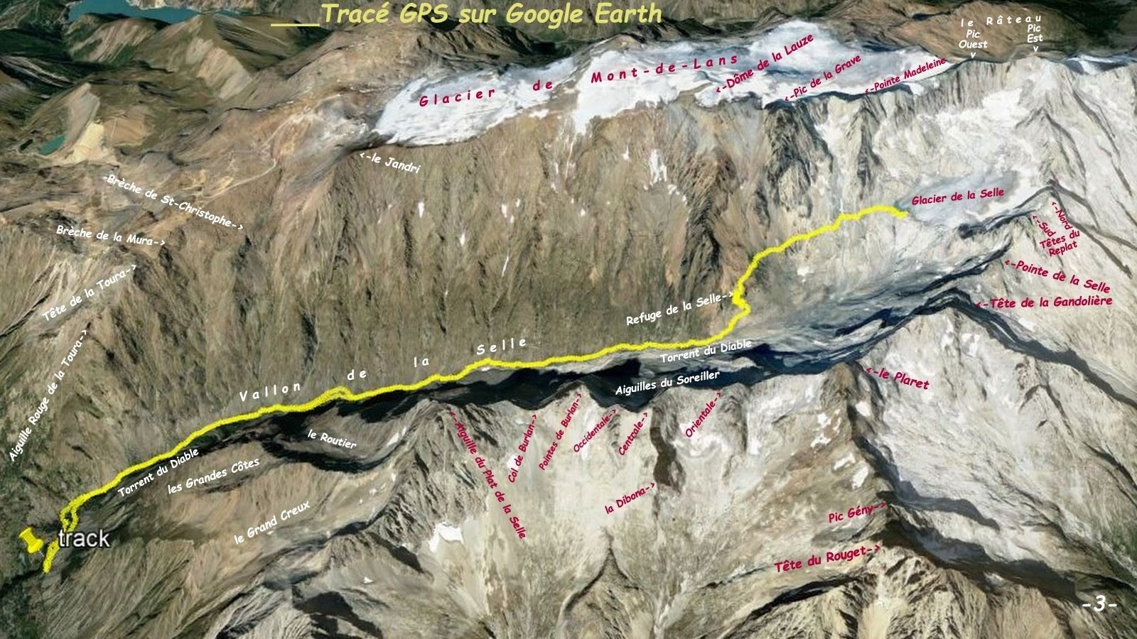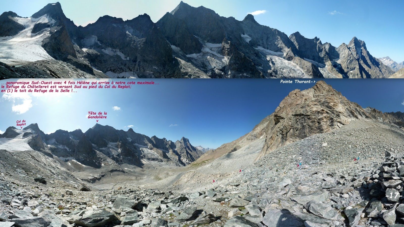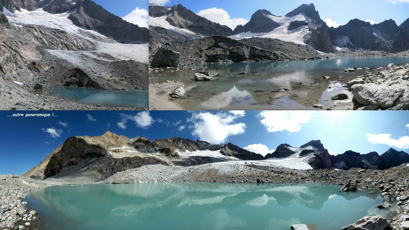 Par les temps qui courent, que peut-il bien subsister du vaste Glacier de la Selle ? C'est en partie pour répondre à cette interrogation que nous sommes montés dans le Vallon de la Selle jusqu'à son refuge, pour ensuite poursuivre jusqu'à son glacier par le sentier du Col du Replat. Et là ! Quelle n'a pas été notre surprise d'y découvrir un important lac sur front glaciaire, depuis seulement 4 à 5 ans d'après le gardien du refuge. Véritable cerise sur le gâteau qui récompense généreusement de l'interminable longueur de cet itinéraire. Là-haut, dans cet immense cirque entre le Pic de la Grave, le Râteau, les Têtes Sud et Nord du Replat, la Pointe de la Selle, la Tête de la Gandolière et plus loin toute la chaîne nord du Massif du Soreiller, nous sommes vraiment dans un autre monde et même si, misère des misères, il ne reste pas grand chose du grand glacier d'antan, quel spectacle !