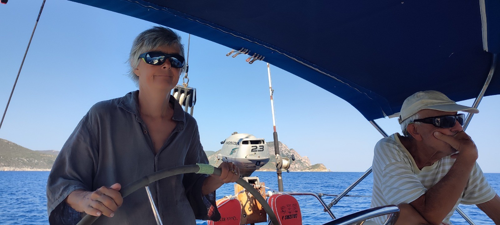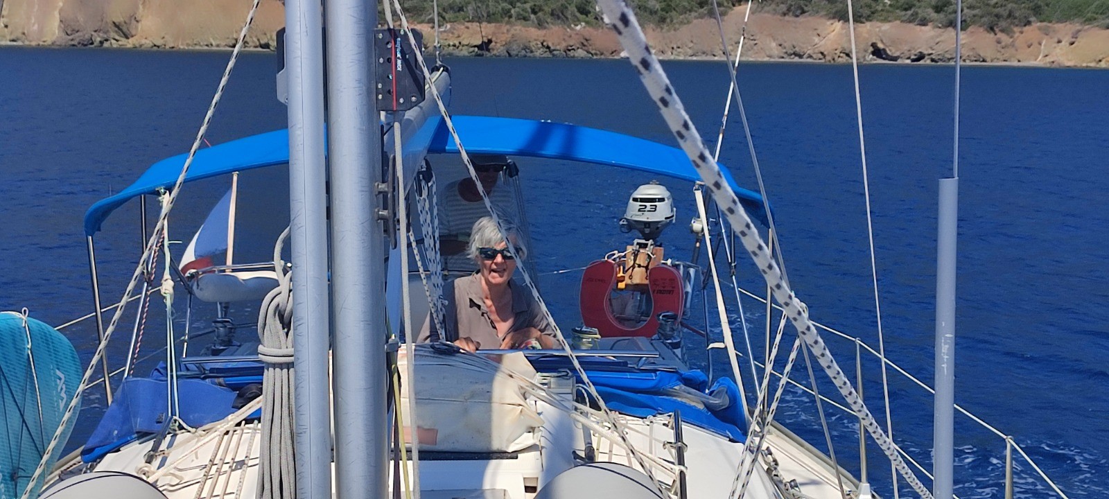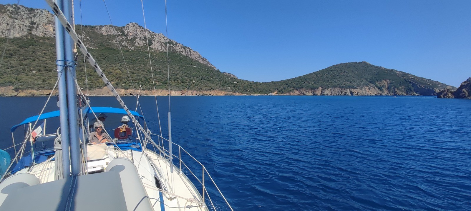 Après palabres nous optons pour partir déjeuner de l'autre côté. Mouillage, déjeune agrémenté par la surveillance d'un paddle abandonné en pleine mer. Quand le plongeur se décide à ce montrer nous repartons sur l'autre bord du doigt, notre destination tion initiale. Nous dedaignons une grande baie touristique, echouons à mouiller dans une jolie crique mais étroite et l'ancre dérape. Mouillage suivant réussi avec haussière à l'arrière sur un beau béquet.