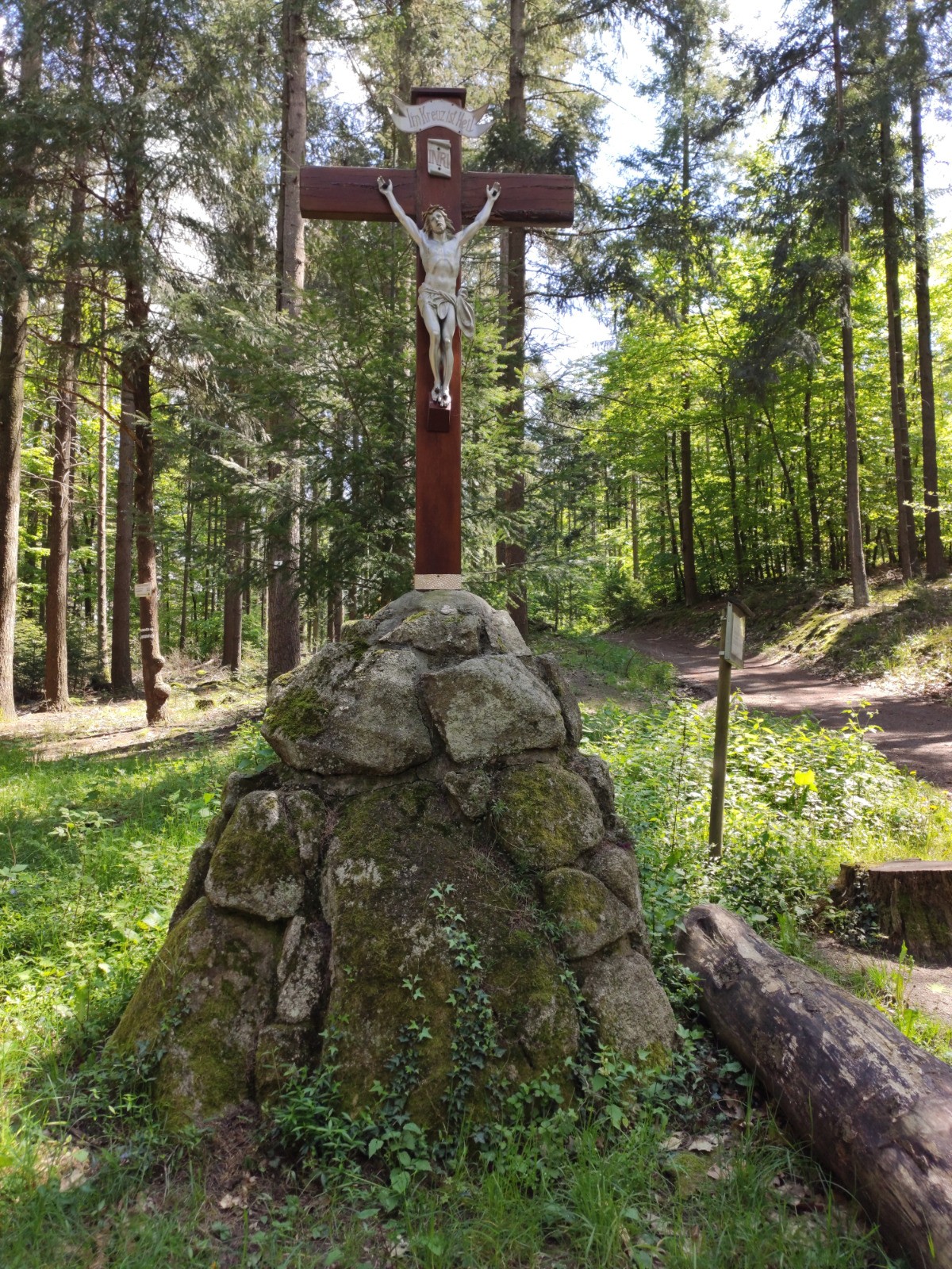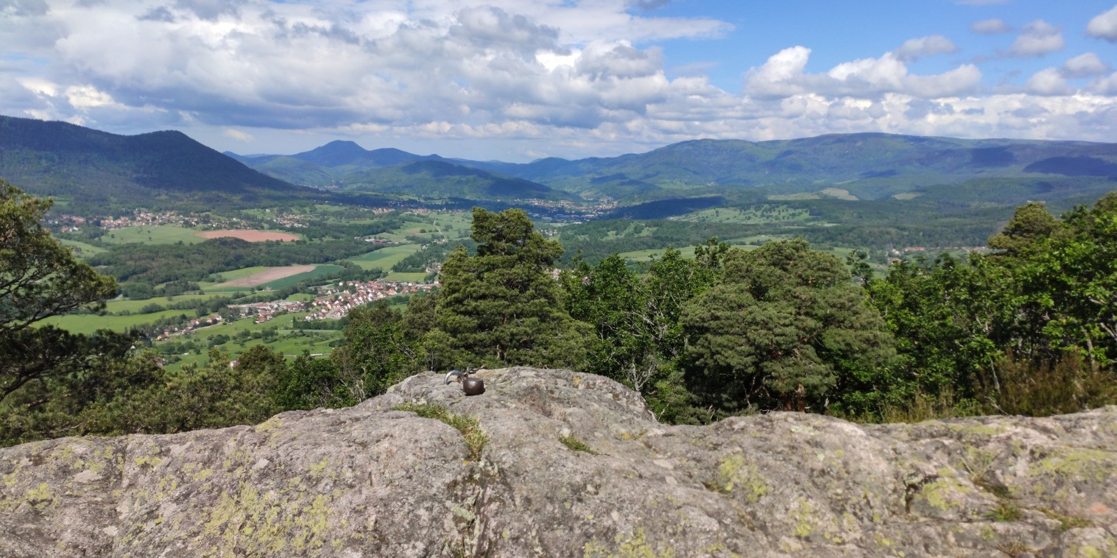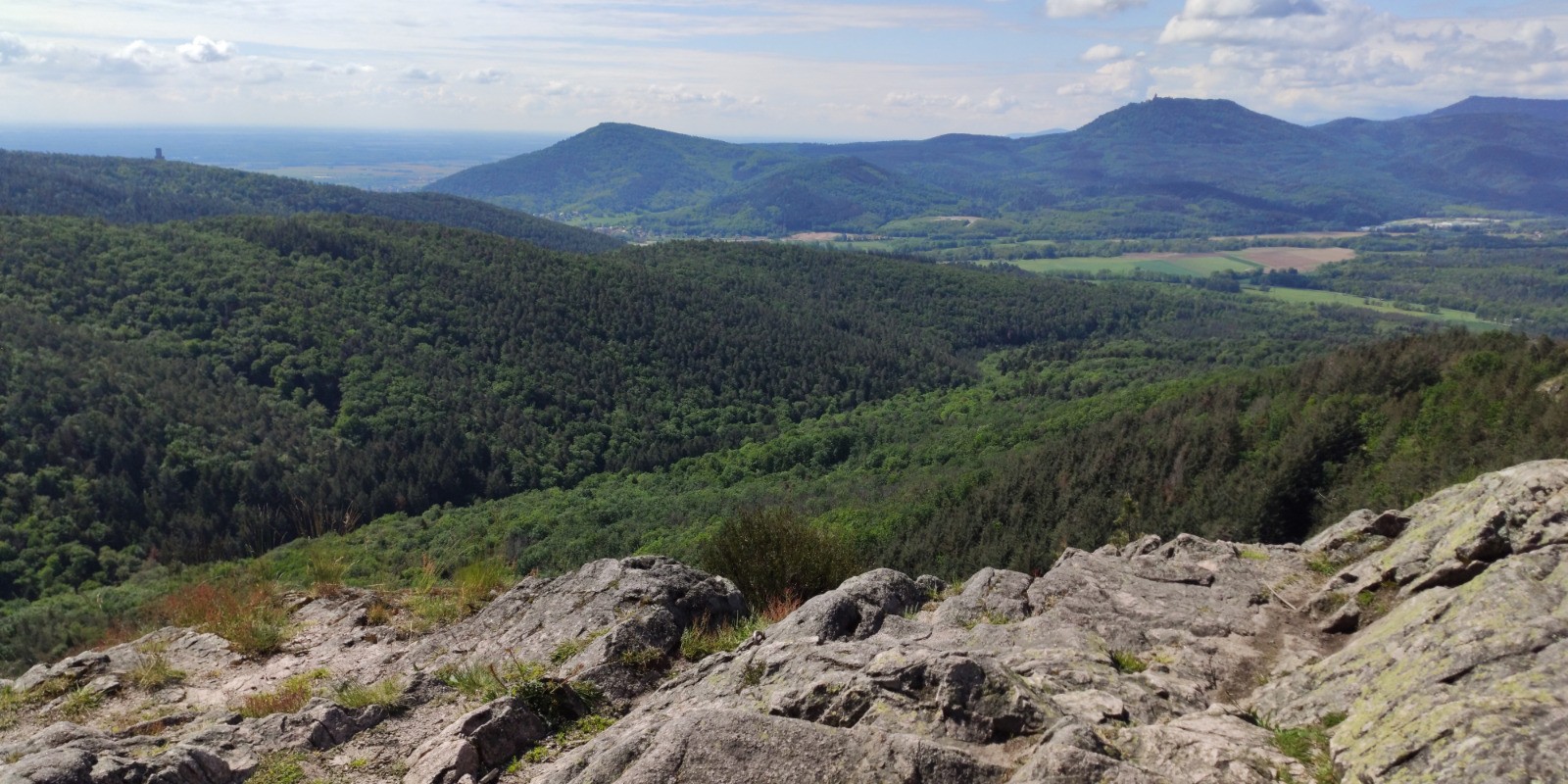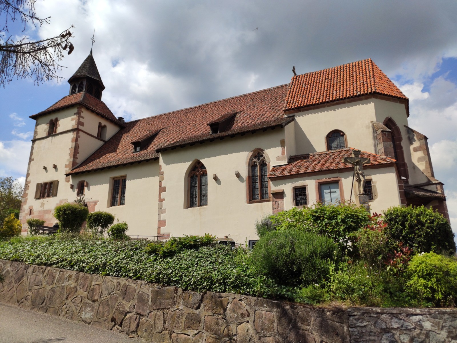 Dieffenthal (parking de l'église Saint Michel) - Rocher des Celtes - Opferstein - Wolfskirche - [GR5] - Kriegshurst - Engelfelsen - Hagelstein - Falkenstein - Willerpfad - Abri Teufelsloch - Rocher de l'Äne - Schulwaldplatz - Kaesmarkt - Chapelle Saint Sébastien - Sentier de Compostelle - Dieffenthal