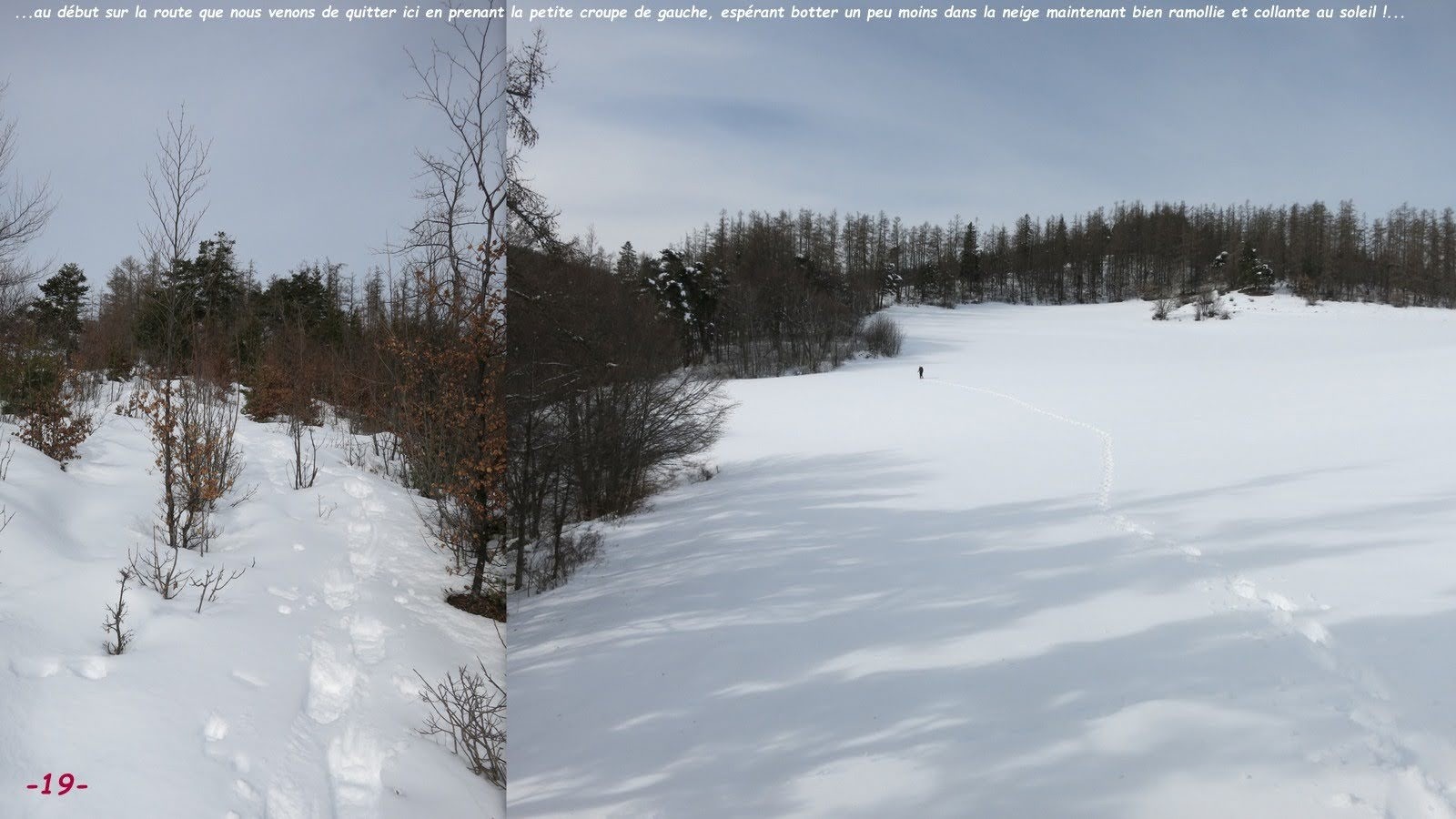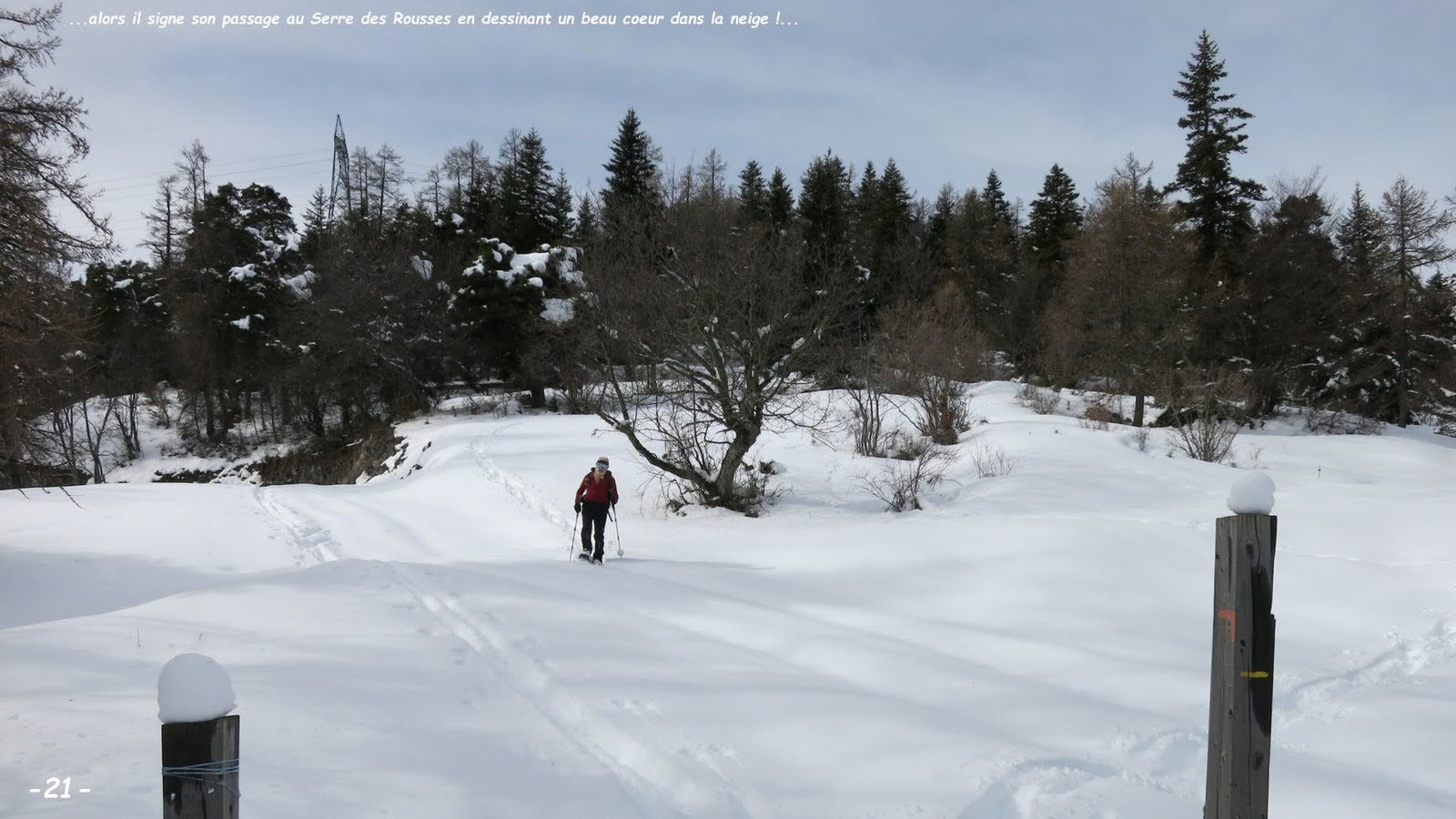 Mont Colombis, 1733m, voilà bientôt dix ans que je connais l'Ours et que j'entends parler d'une randonnée en raquettes sur les débonnaires pentes Nord de cette modeste montagne, l'une de nos plus proches voisines; alors, avant les températures estivales prévues pour la semaine prochaine, autant profiter de l'encore bon enneigement à basse altitude pour enfin aller y promener nos raquettes. Pour être encore plus sûr d'y trouver une bonne neige, il n'a rien trouvé de mieux qu'improviser un itinéraire le plus direct possible en suivant au mieux le talweg du Torrent du Bridon suivi de celui du Ravin de Malaval qui s'est avéré probablement déjà bien compliqué pour nous et impraticable pour la Marmotte qui nous suivait à distance comme elle en a l'habitude. Revenu à plus de raison sur un itinéraire plus accueillant mais forcément bien plus long et sur lequel nos raquettes bottaient beaucoup trop pour que nous puissions aller jusqu'au de bout de nos ambitions, pris par le temps nous avons dû abandonner au collet en amont du Serre des Rousses.