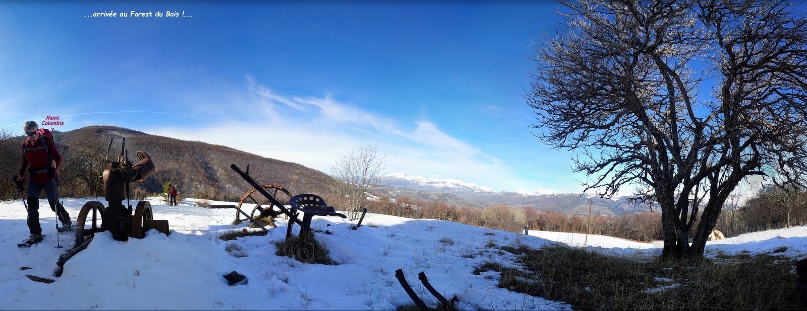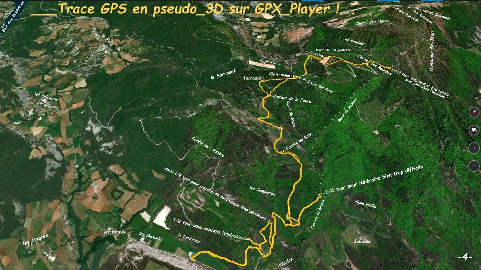 depuis le vaste parking à la cote 998m après les Massots et en face le départ de la route pastorale de Nicolas, le Forest rénové des Combeaux (non nommé sur l'IGN) (signalé par un panonceau indiquant Forest du Bois 4km, correspondant au sentier balisé représenté par des tiretés rouges de l'IGN) qu'il suffit de suivre (en évitant notre erreur d'aiguillage sur la route forestière de Mal Boisset suivie de la malencontreuse tentative de rattrapage ainsi que notre A/R jusqu'au Torrent du Bridon avec l'irréaliste objectif de rejoindre au plus court la Route du Mont Colombis par son talweg suivi de celui du Ravin de Malaval) en partie détruit par un récent et plus large labour en arrivant au Forest du Bois > sa route pastorale jusqu'au lacet coté 1275m > draine de débardage qui traverse le Ravin du Sauge quand elle redescend couper à travers bois (clôture à moutons) jusqu'à l'alpage, le traverser au mieux pour aller chercher la draine de débardage à son extrémité Sud après Forest de la Faure en suivant notre trace de retour jusqu'à la Croix des Prés (accès probablement un peu plus facile que notre trace de montée !) > Route du Mont Colombis, en coupant ses lacets en amont de l'Eyrette, jusqu'au col coté 1602m (où, suivant notre projet, nous aurions dû la rejoindre !) après le Serre des Rousses où nos différents aléas nous ont contraints à abandonner > retour par ce même itinéraire.