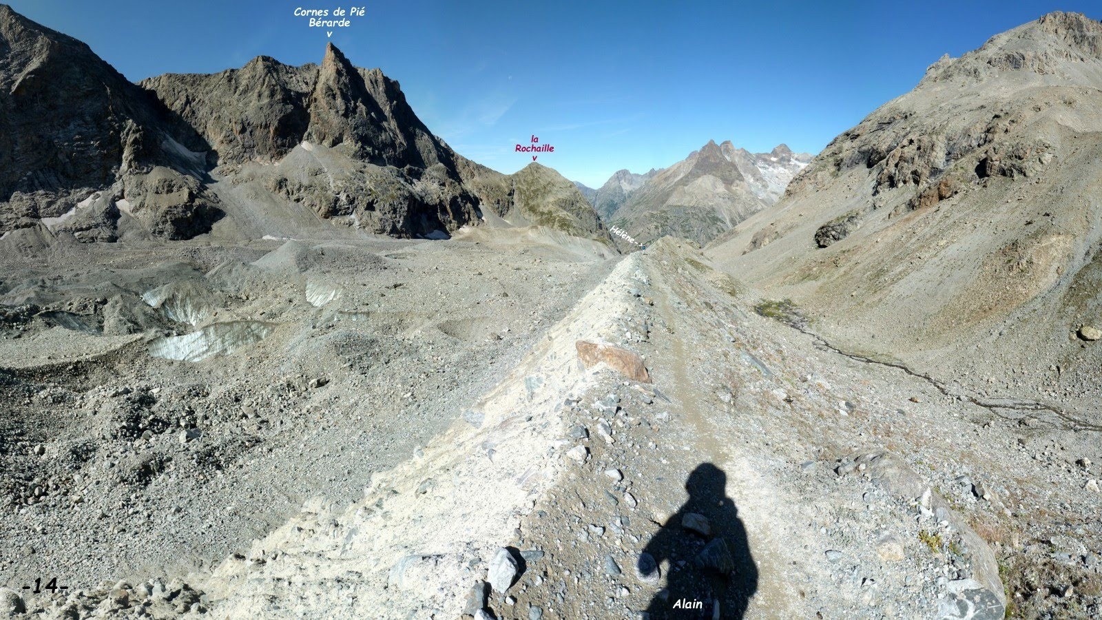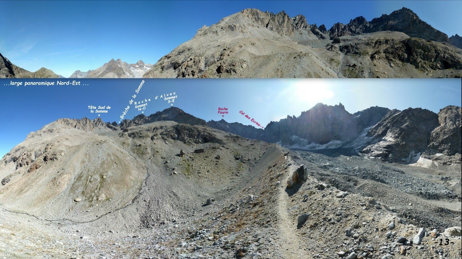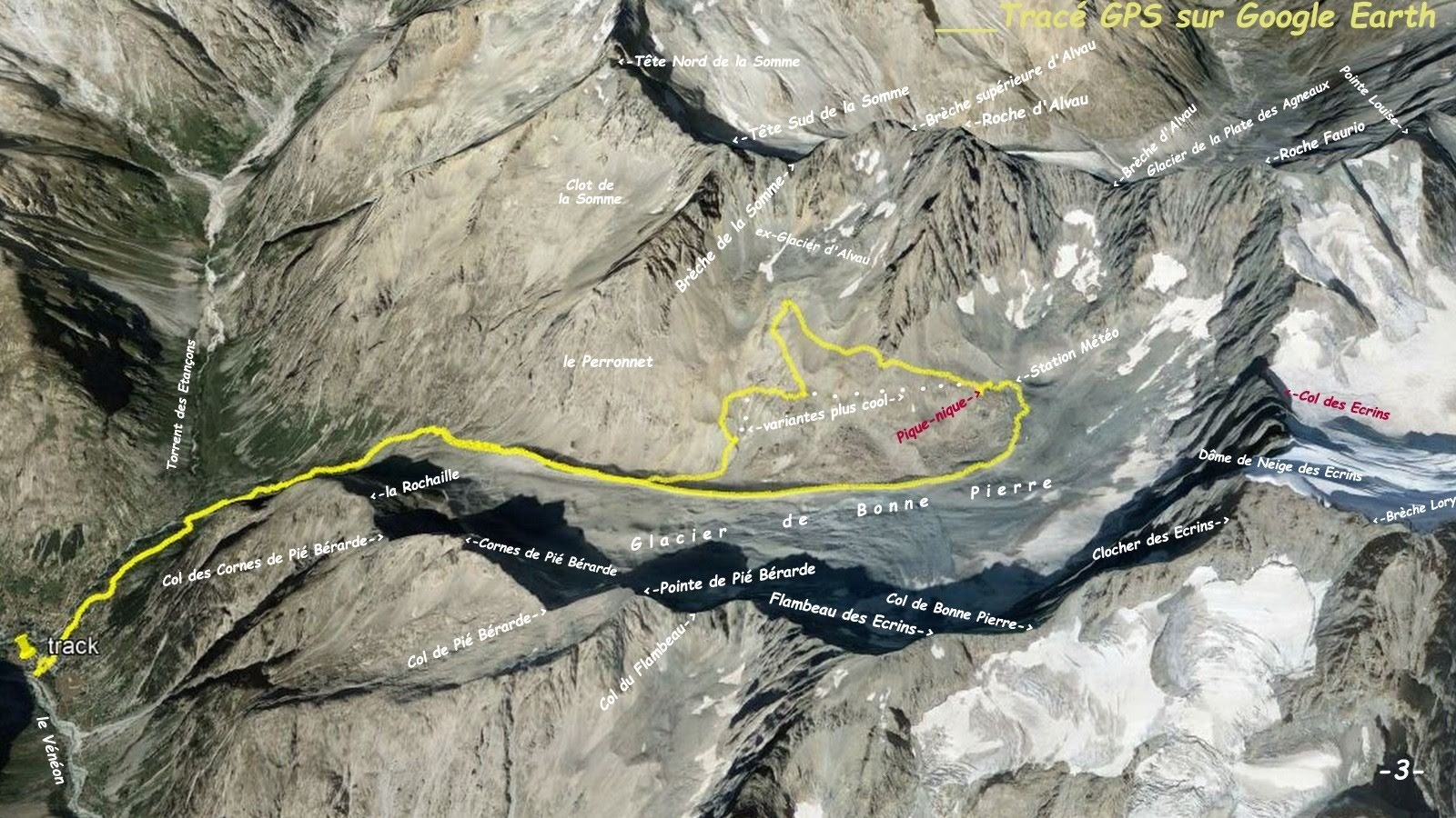 Depuis le parking de la Bérarde, 1706 m > le raccourci du sentier des Refuges du Châtelleret et Promontoire jusqu'après la passerelle sur le Torrent de Bonne Pierre > le sentier du Vallon de Bonne Pierre jusqu'à la station météorologique, 2944 m > traversée vers l'ouest en passant par le petit lac morainique puis, soit rester à niveau sur ce balcon pour rejoindre au plus court la VN de descente de la Brèche de la Somme à la cote GPS de 2873 m, soit effectuer une traversée ascendante des pierriers au plus près du pied de l'arête sud-ouest de la Roche d'Alvau qu'on rejoint sous son premier ressaut, juste sous un bloc caractéristique à la cote GPS de 2970 m, de là deux options possibles : pour les plus véloces une montée directe à la moraine de l'ex-Glacier d'Alvau en suivant au mieux le pied des rochers ou, comme nous, traverser le pierrier qui suit, puis à niveau sur le flanc de la moraine, bien plus facile qu'il n'y paraît à priori ! puis par une diagonale ascendante rejoindre, pour le spectacle, la bosse rocheuse à la cote GPS, 2980 m, à la verticale de la Brèche de la Somme, où on trouve un cairn de sa VN, qu'il va falloir suivre jusqu'à ce qu'elle rejoigne le sentier suivi à la montée sur la moraine du Vallon de Bonne Pierre (attention ! après les premières bosses rocheuses, elle effectue une longue traversée sur la gauche pour ensuite revenir à droite sous la barre rocheuse et regagner le bas de la pente au mieux par la rive droite du thalweg.) > retour parking par le sentier de montée.