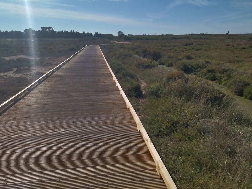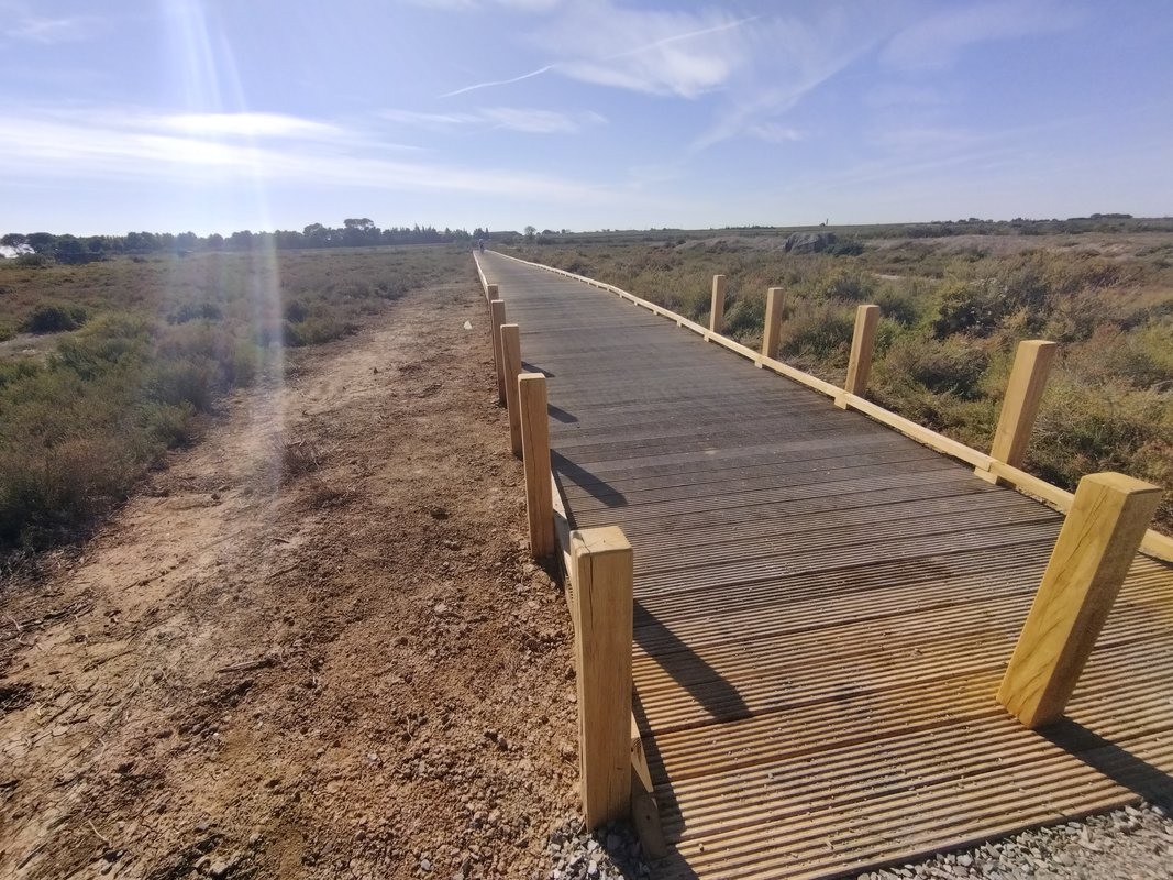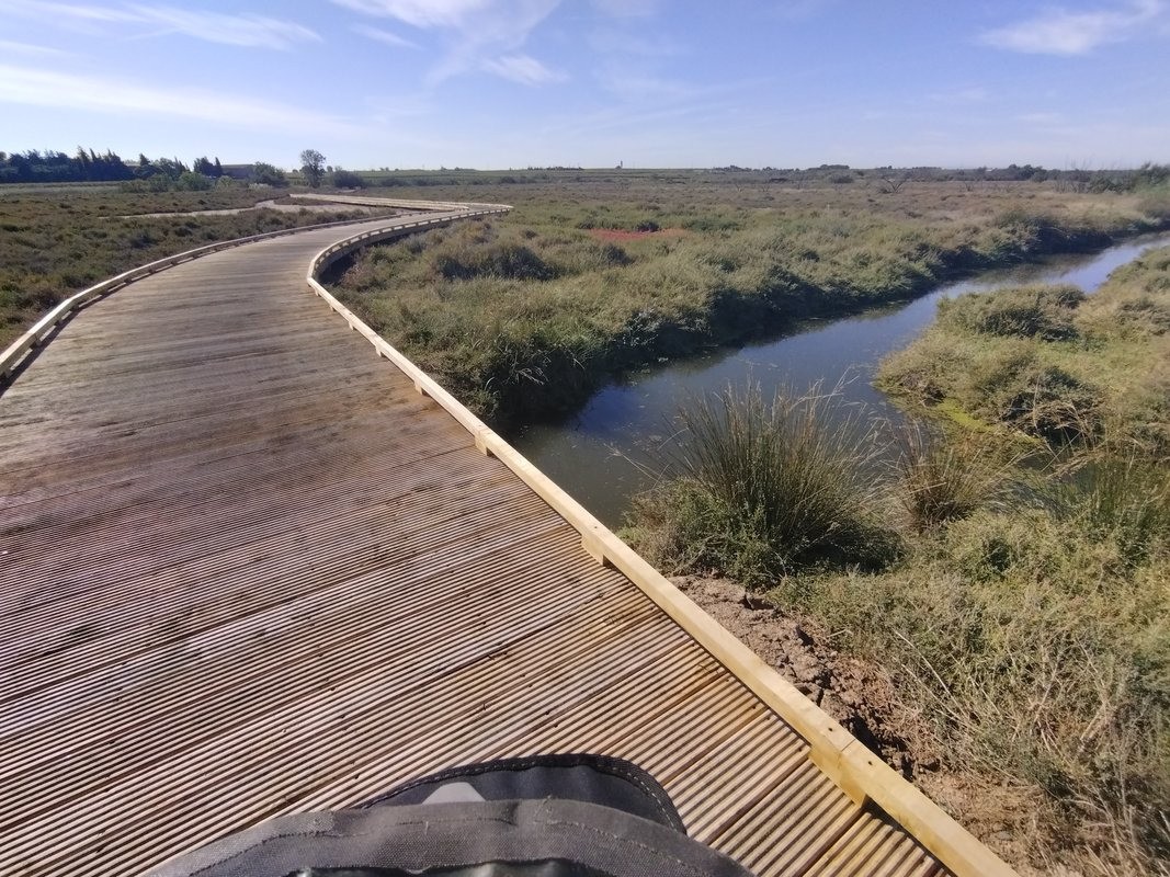 Le tour de l'étang de Thau, utilisant les pistes séparées. Avec le dernier aménagement: un passage sur pilotis dans la zone humide près de Marseillan ville.