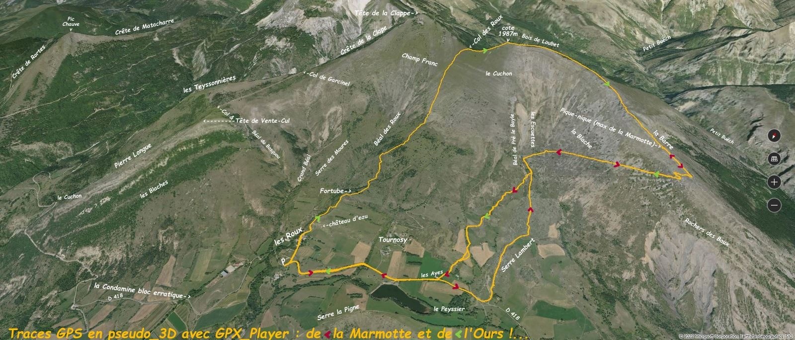depuis le carrefour de la D418 qui conduit de la Roche-des-Arnauds aux Bas Baux, avec la route d'accès aux Roux > l'emprunter et poursuivre en amont par la piste d'accès au château d'eau (et éviter ainsi notre désagréable remontée parmi les épineux !) > monter à vue par de vagues pistes d'accès à la ferme abandonnée de Fortube, puis aux différents captages de 3 sources et autres sentiers de chèvres parmi les genêts, genévriers et quelques résineux clairsemés, pour terminer par la pente semi-herbeuse qu'il suffit de traverser en diagonale jusqu'au Col des Roux (c'est certes pentu, mais toujours largement inférieur à 30°, exactement 23° au plus raide, merci EditGPX !) > où nous avons trouvé une neige très dure et toujours portante qui nous a bien aidés pour rejoindre par sa croupe le sommet, coté 1987m, point culminant de l'impressionnante demi-lune formée par la falaise de son arête Sud-Est en exacte continuité avec la Barre en amont des Rochers des Baux (cet ensemble ne pouvant pas laisser insensibles les amoureux des harmonieuses lignes naturelles !) > sa portion la plus effilée descendue avec encore plus de prudence à cause des plaques de neige gelée nous avons rejoint la Marmotte sur la Barre pour un pique-nique royal bien à l'adret dans un creux de la falaise > retour par le sentier balisé jusqu'au creux des Escuettes d'où nous sommes passés hors sentier en rive droite du Béal de Pré le Bayle pour poursuivre jusqu'aux Ayes, histoire d'offrir une variante en forme de raccourci à la Marmotte > retour parking par la D418.