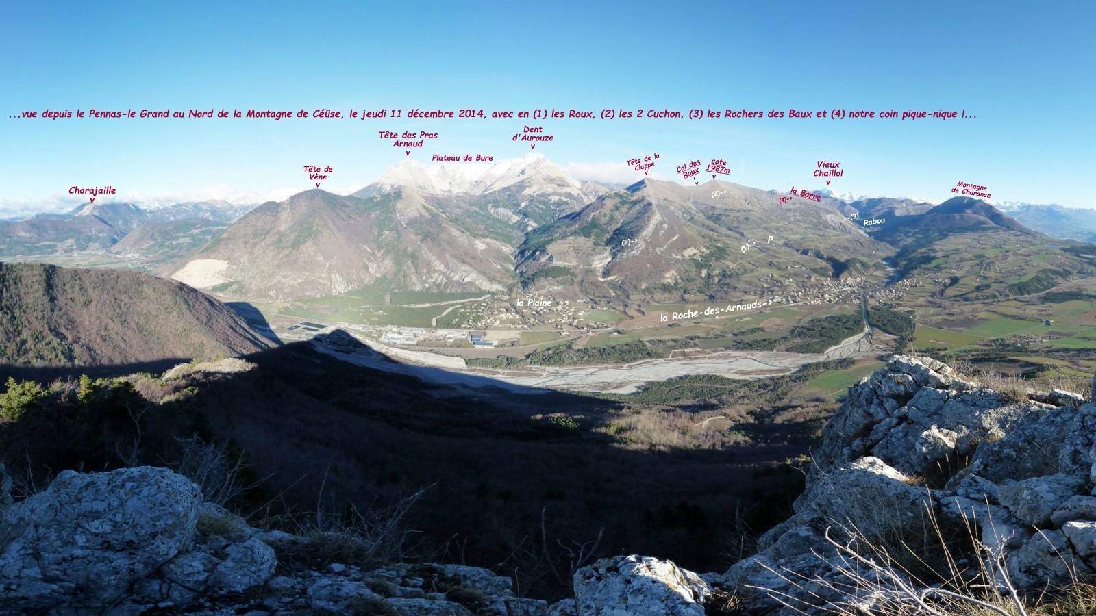 C'est ainsi que, sans la moindre anticipation, nous nous sommes retrouvés bien à l'adret sous le petit hameau des Roux au pied de la pente du vaste arc de cercle qui va du Cuchon de Pierre Longue aux Rochers des Baux, dominé en son centre par la débonnaire Tête de la Clappe, 2019m, ornée de ses 3 grands cairns, déjà visitée en