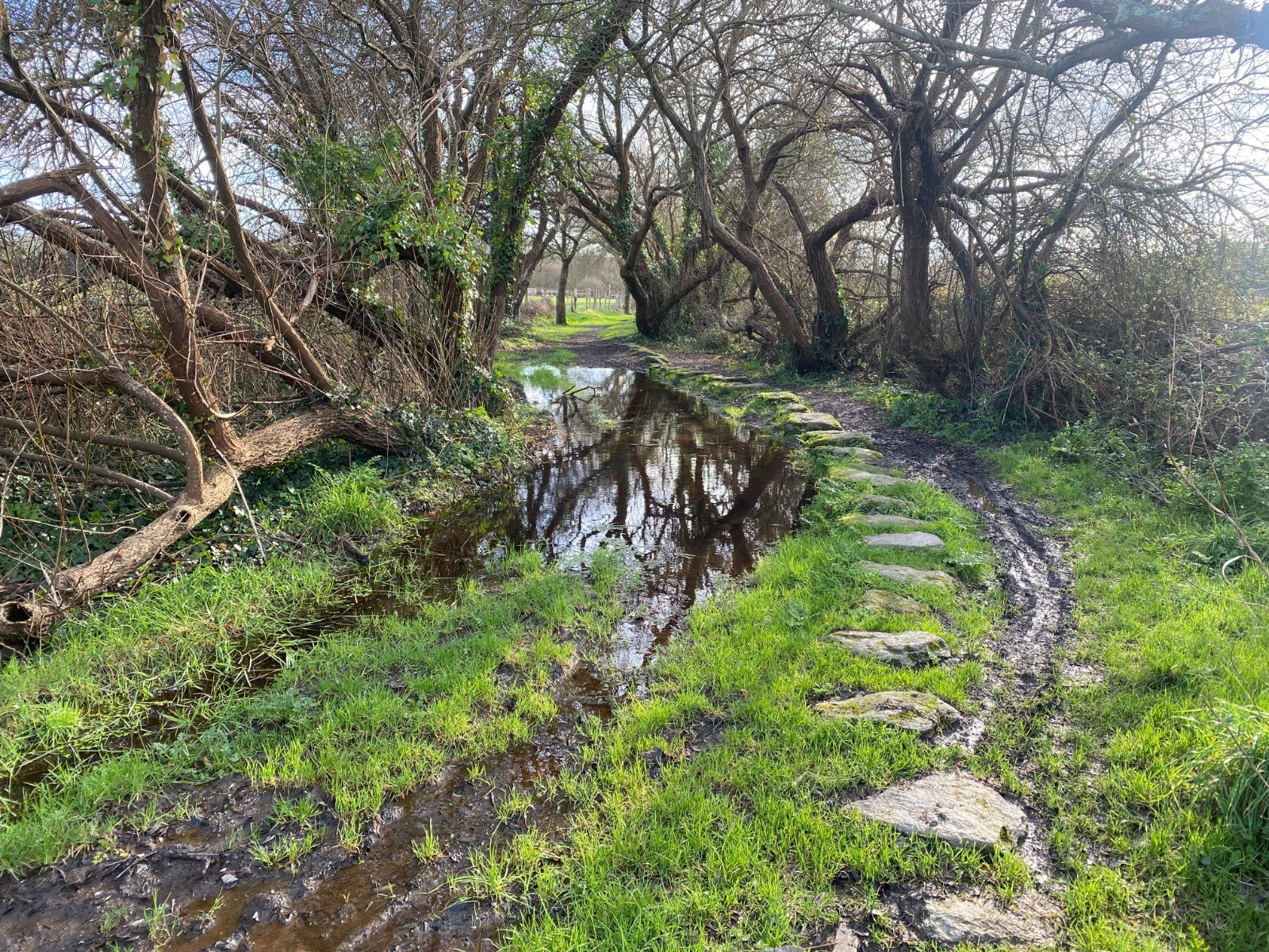 Les quelques chemins empruntés sont très boueux ( voire de grandes flaques ) en ce moment suite aux pluies incessantes que nous avons depuis un mois.