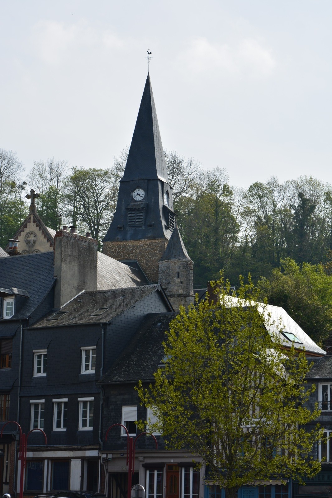 • L'église Sainte-Croix (XIIe et XIXe). Cette église, située au cœur du quartier du Mont-Mirel, présente la particularité unique en Normandie d'avoir le sol en pente (environ 9 %), mettant ainsi l'autel majeur au niveau des orgues ; l’orgue de 1841 de Georges Luce a été reconstruit en 1903 par C. Mutin, et relevé en 1983 par Philippe Hartmann (10 jeux, 2 claviers, pédalier) ; les vitraux, détruits en 1944, ont été remplacés par de nouveaux, exécutés par Guays-Merigot, maîtres verriers à Paris, en 1949 ;