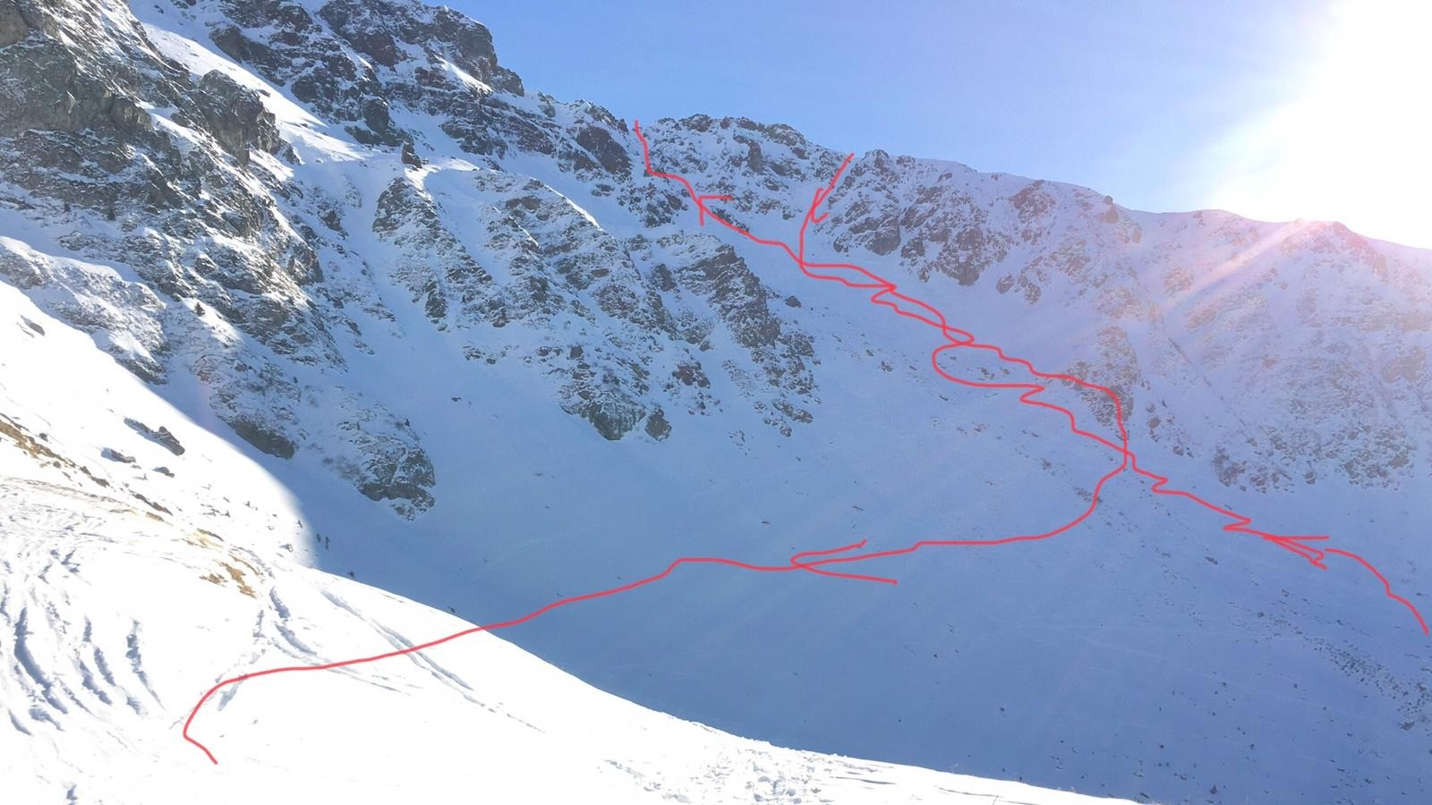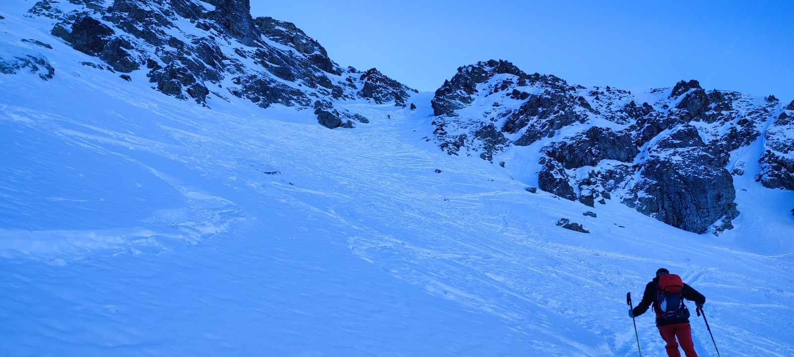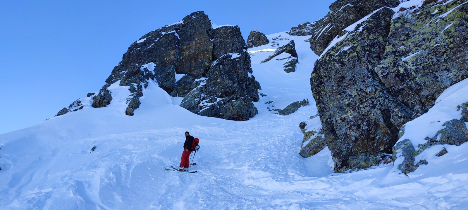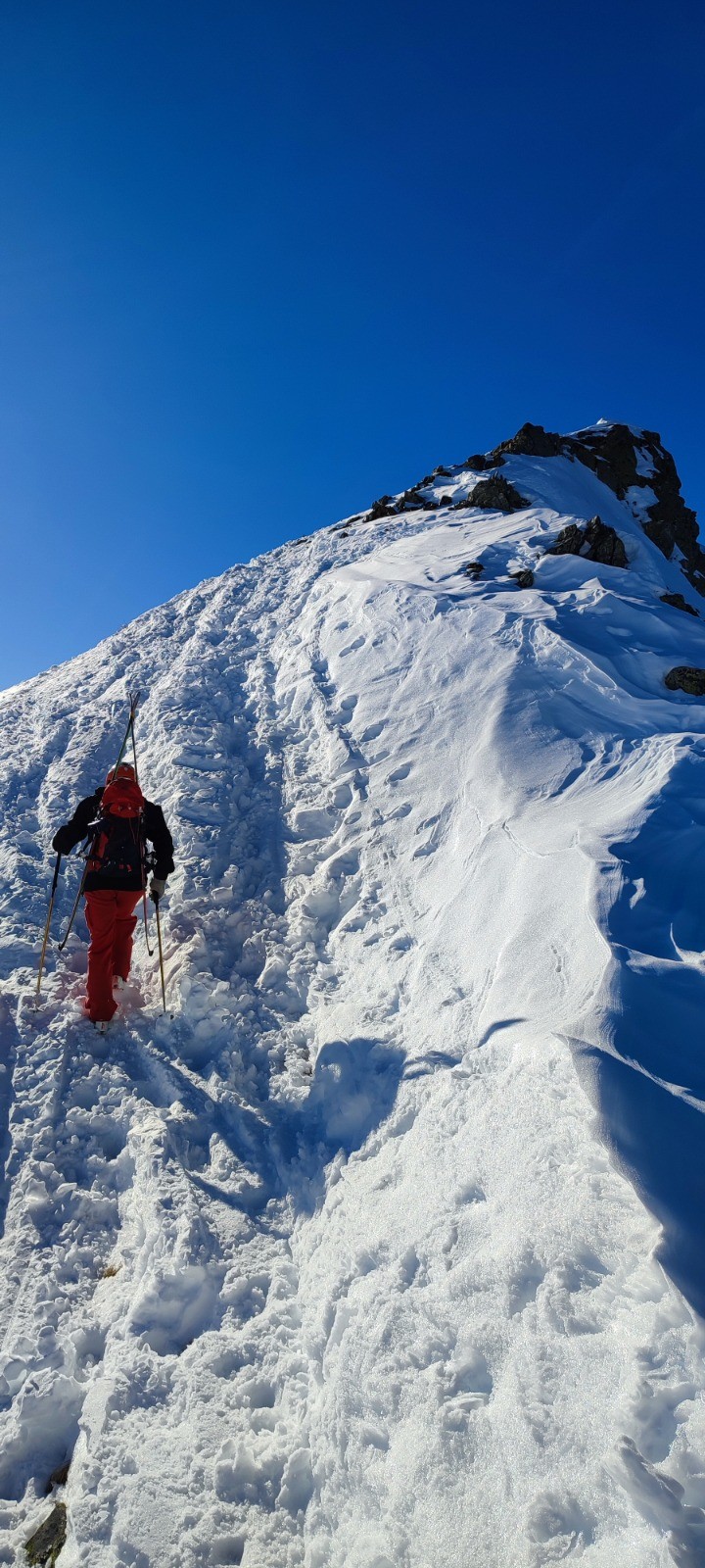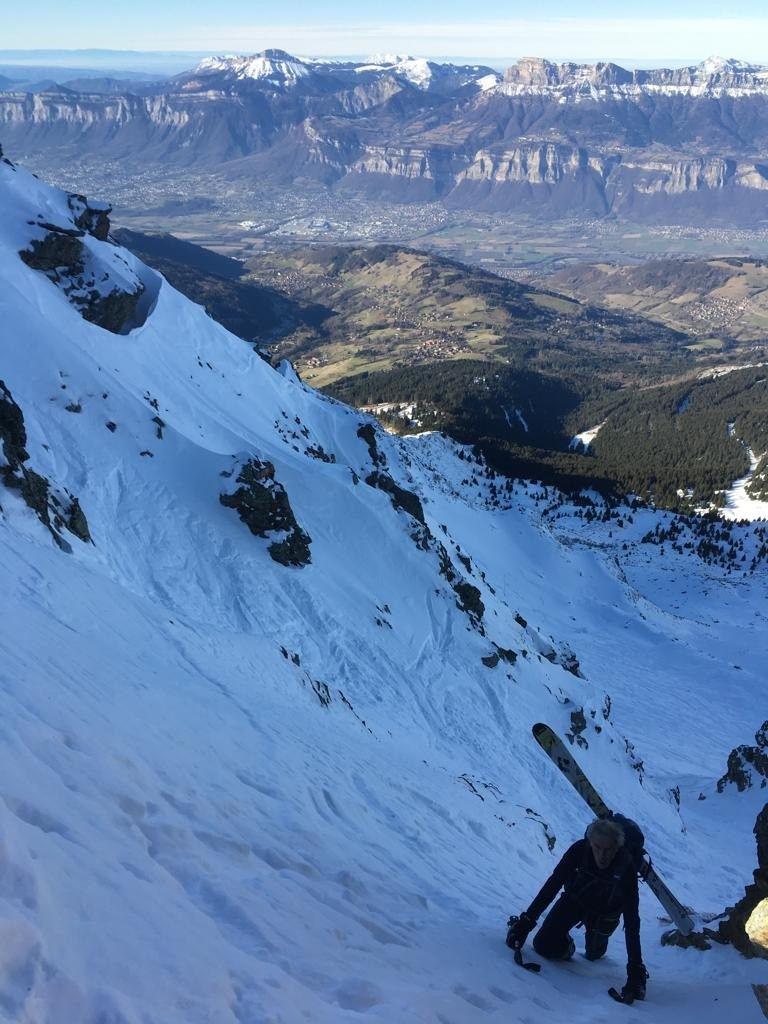 Bref cette fois, moins de neige mais on va en haut, en prenant le couloir en face au lieu de celui, plus classique sur la droite. Bien nous en a pris, la montée (finale à pied) relativement aisée, et la descente du couloir habituel intenable sur plus de 100 mètres.