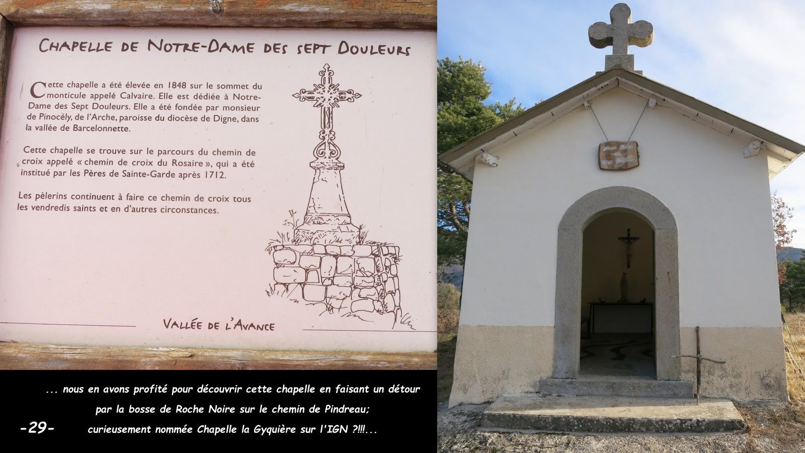 depuis la Plâtrière, 710 m > le sentier du Col du Tourrond jusqu'à la cote 1030 m d'où, en attendant la Marmotte, nous avons improvisé une boucle au Sud, mais versant Nord de Puy Cervier ! revenant sur le col > Charamère > la Côte Belle (en poussant jusqu'au Pas du Lièvre, c'est un peu plus esthétique !) > Puy Maurel en traversée tandis que la Marmotte empruntait le raccourci en direction des Bancs > la Morfondière > A/R sur la Montagne de l'Aigle pour un pique-nique abrité > Statue de l'Ange > N-D du Laus > Chapelle du Précieux Sang > Chapelle la Gyquière sur l'IGN, des Sept Douleurs sur le terrain > improvisation pour rejoindre Pindreau > Comberland > la Plâtrière.