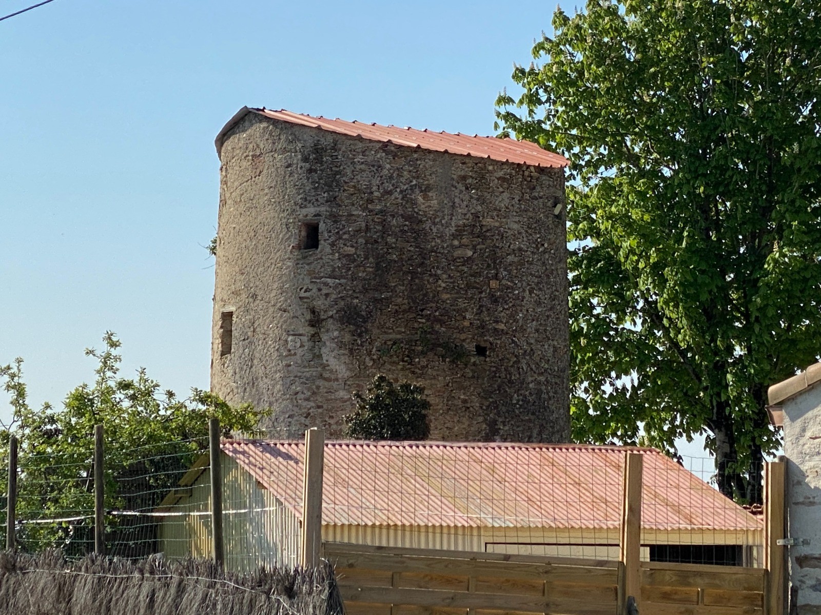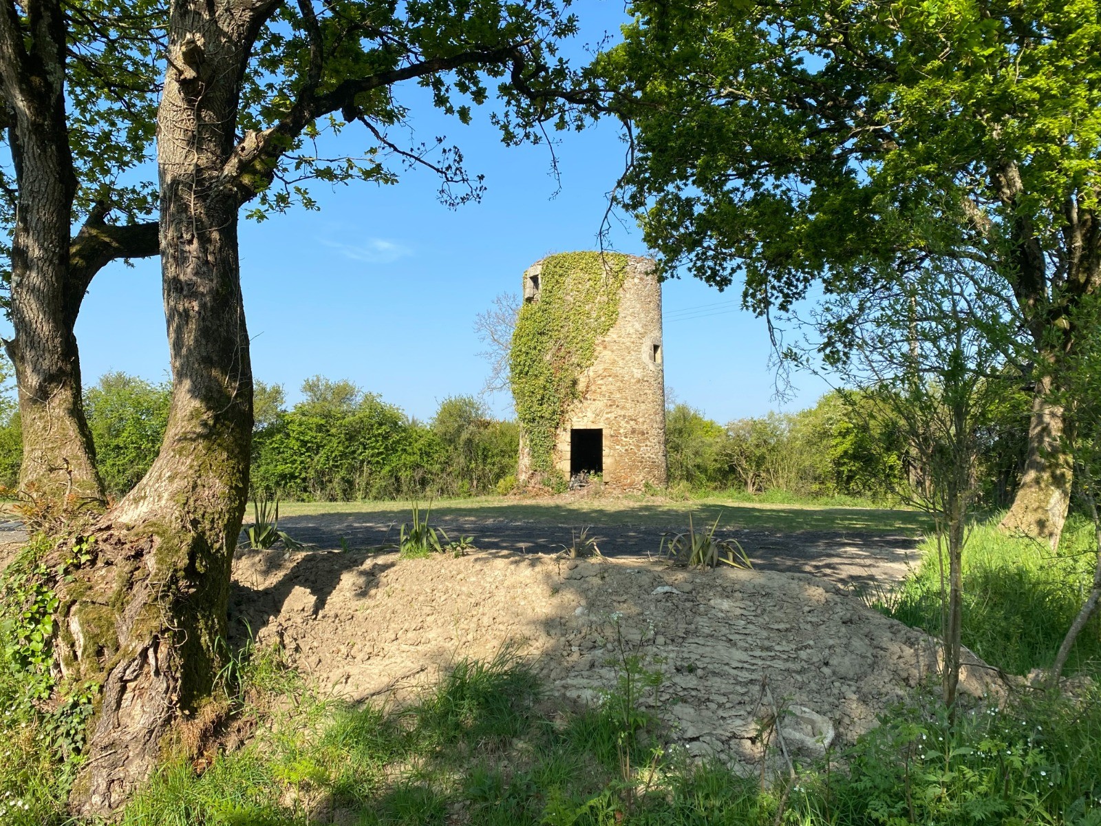 Un peu plus loin, caché parmi des habitations, le moulin des Landes un peu tronqué s'offre à nos yeux.