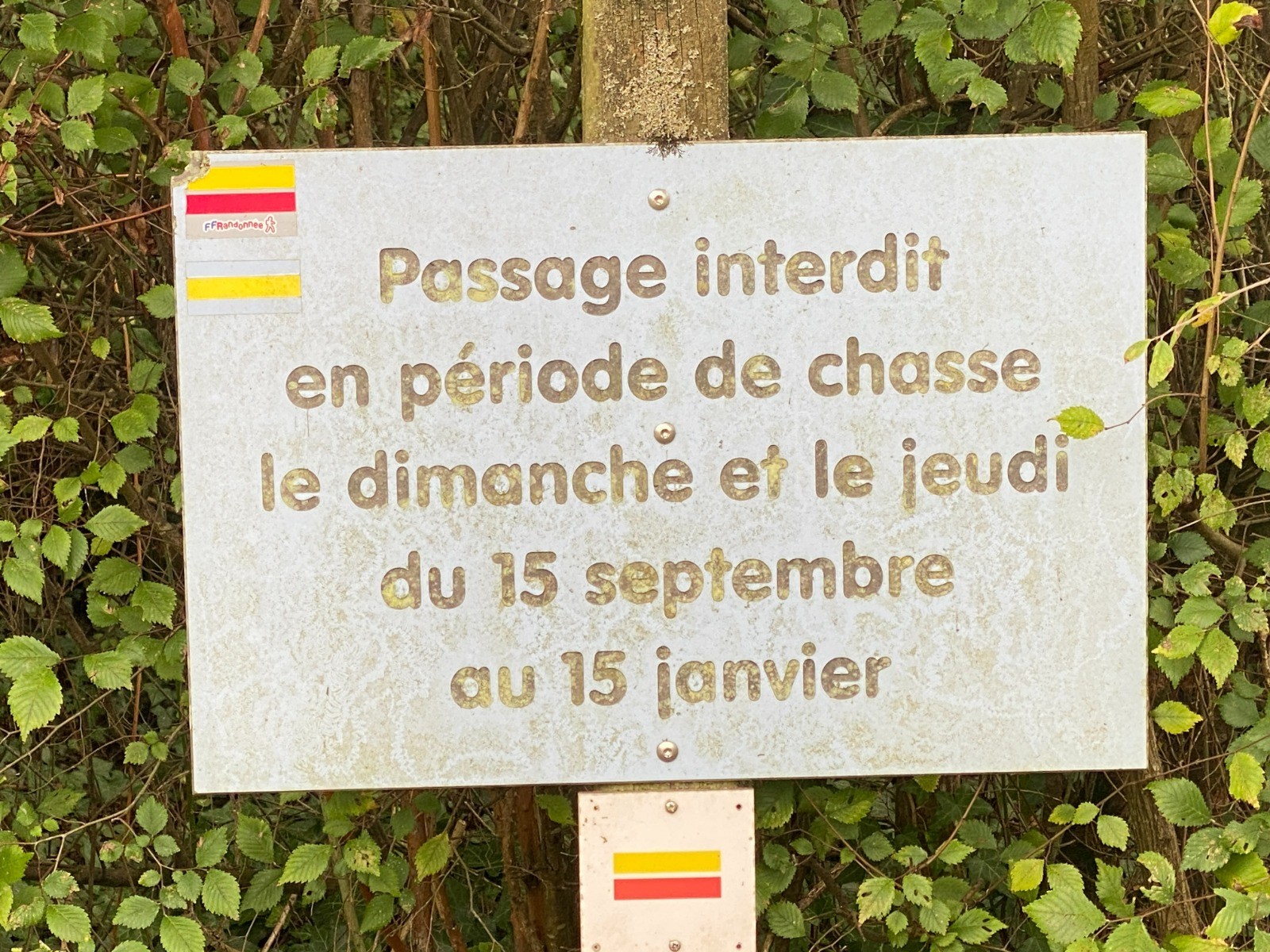 Un peu plus loin, au kilomètre 5, la vigilance est de mise : un panneau rappelle que le passage est strictement interdit en période de chasse ( voir photo n°12 ).