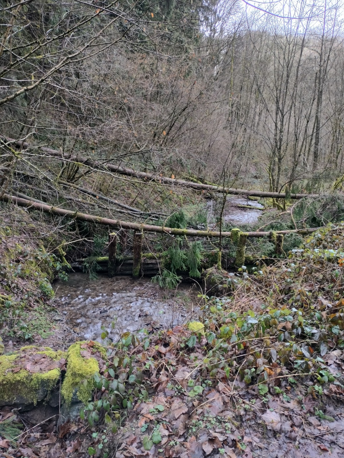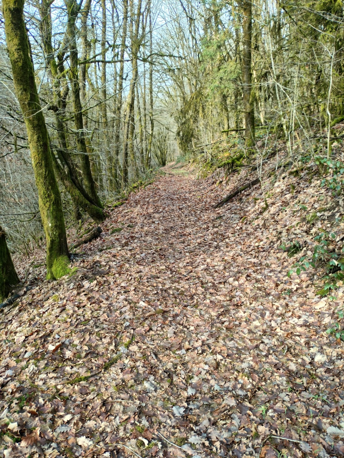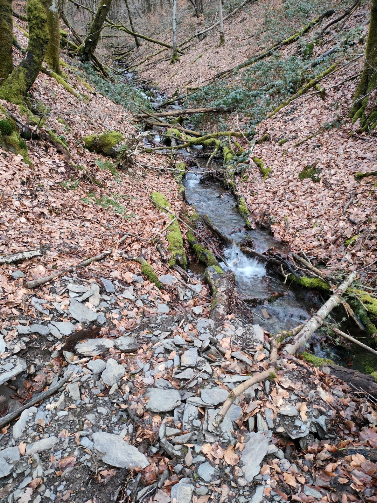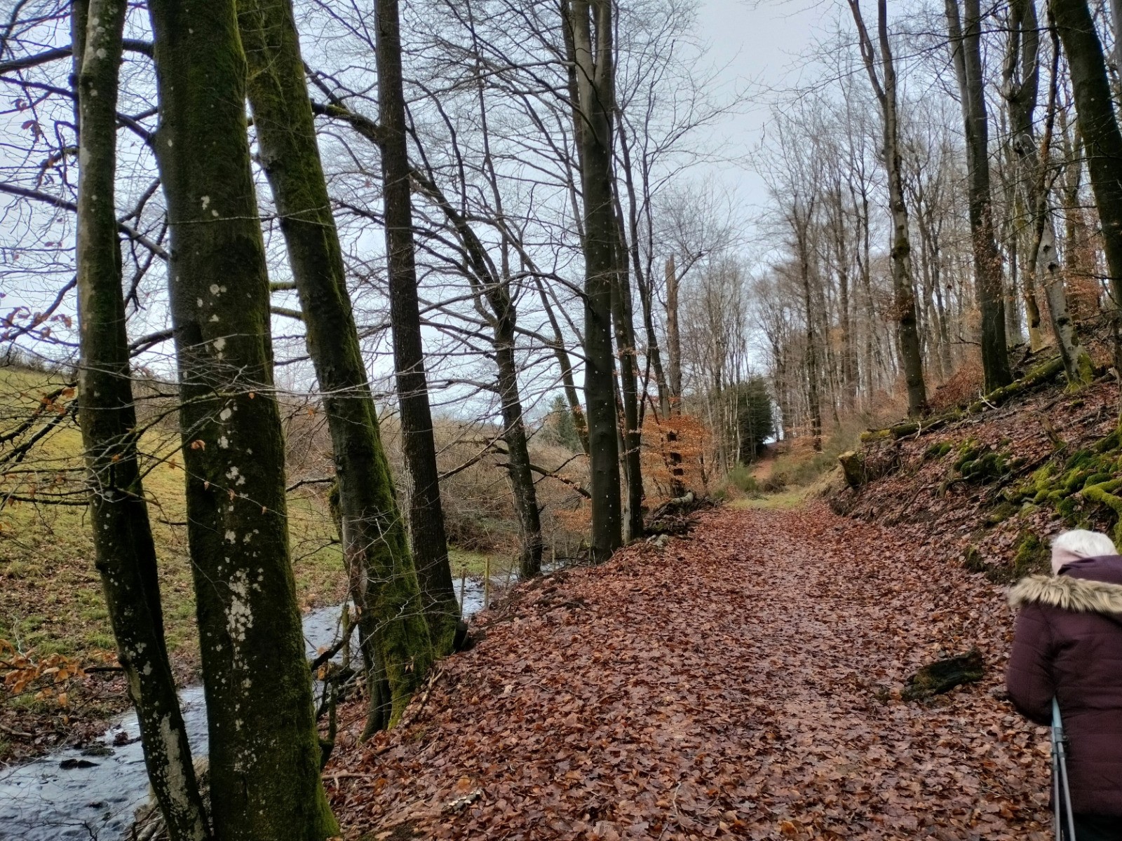 Dillebaach, que nous remontons ensuite sur la rive gauche dans une atmosphère fraîche et boisée. Après avoir longé l’eau, le sentier s’élève progressivement à travers une forêt de feuillus avant d’atteindre une zone plus dégagée en hauteur. Nous entamons alors la descente qui nous conduit au