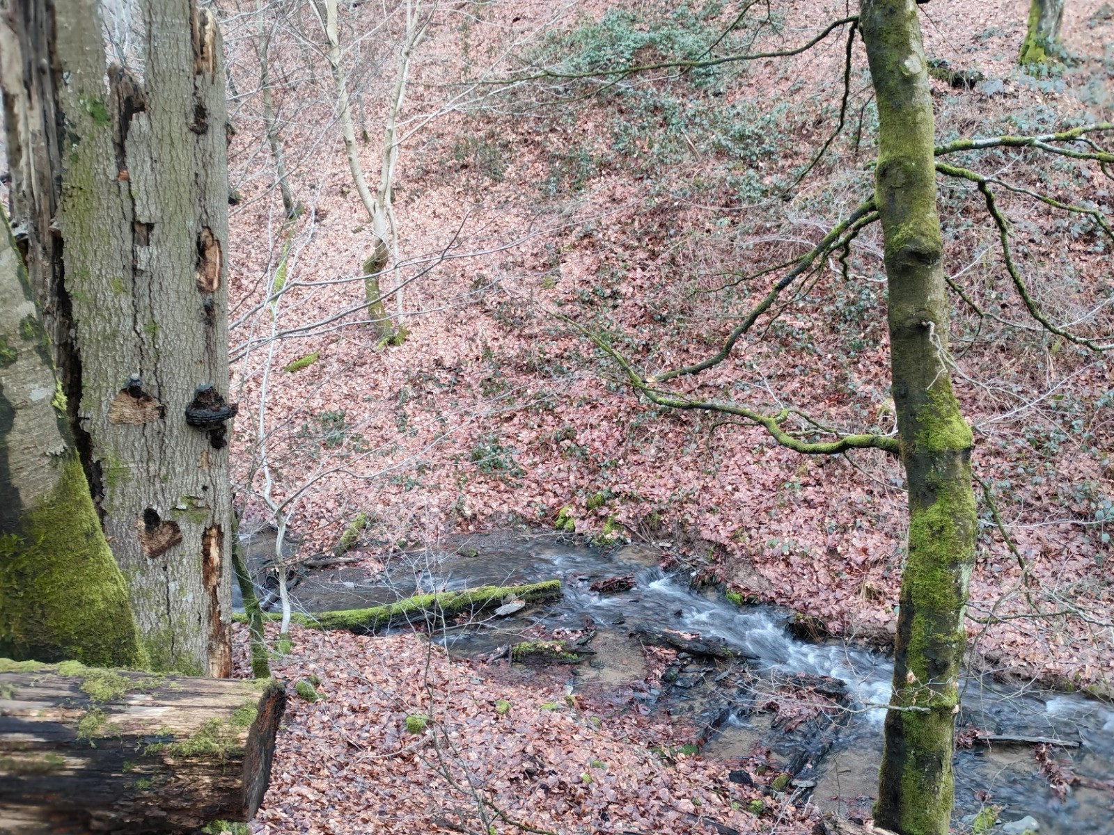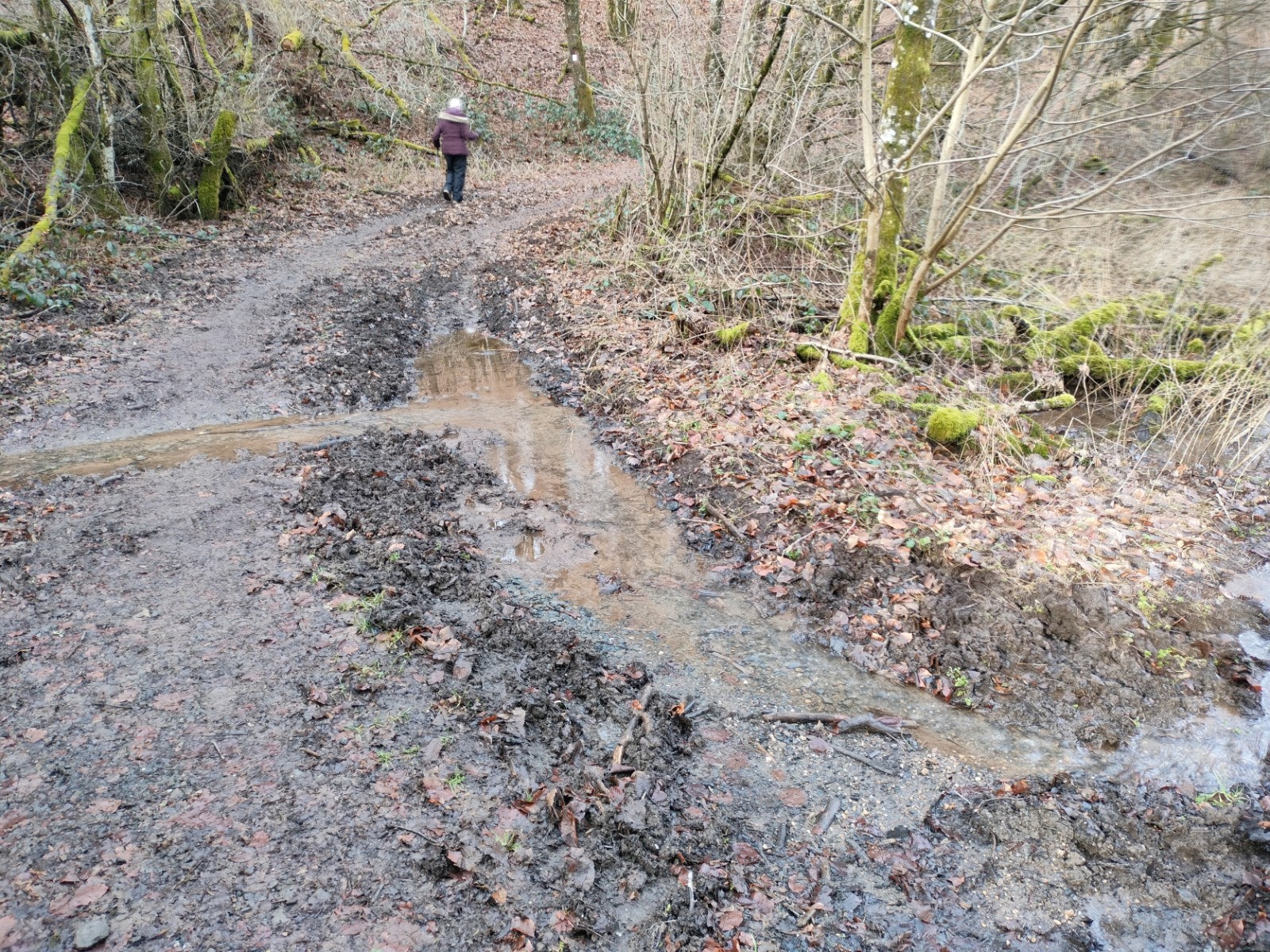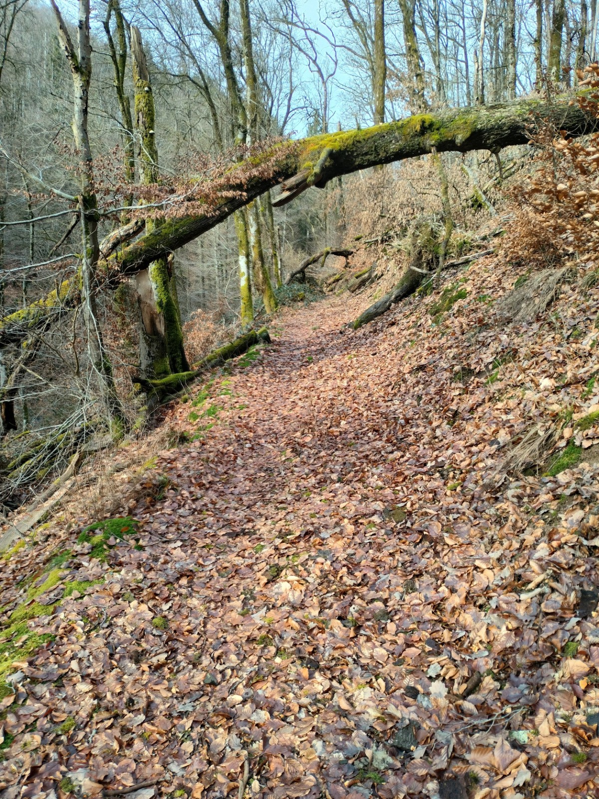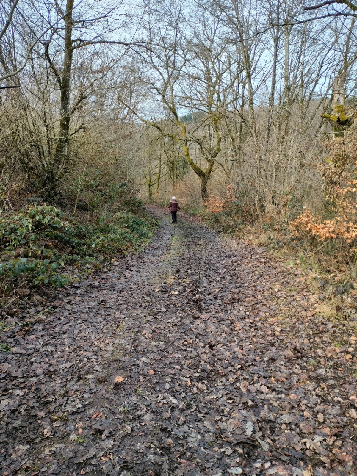 Dillebaach, que nous remontons ensuite sur la rive gauche dans une atmosphère fraîche et boisée. Après avoir longé l’eau, le sentier s’élève progressivement à travers une forêt de feuillus avant d’atteindre une zone plus dégagée en hauteur. Nous entamons alors la descente qui nous conduit au