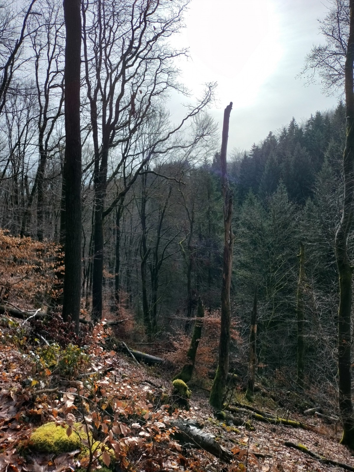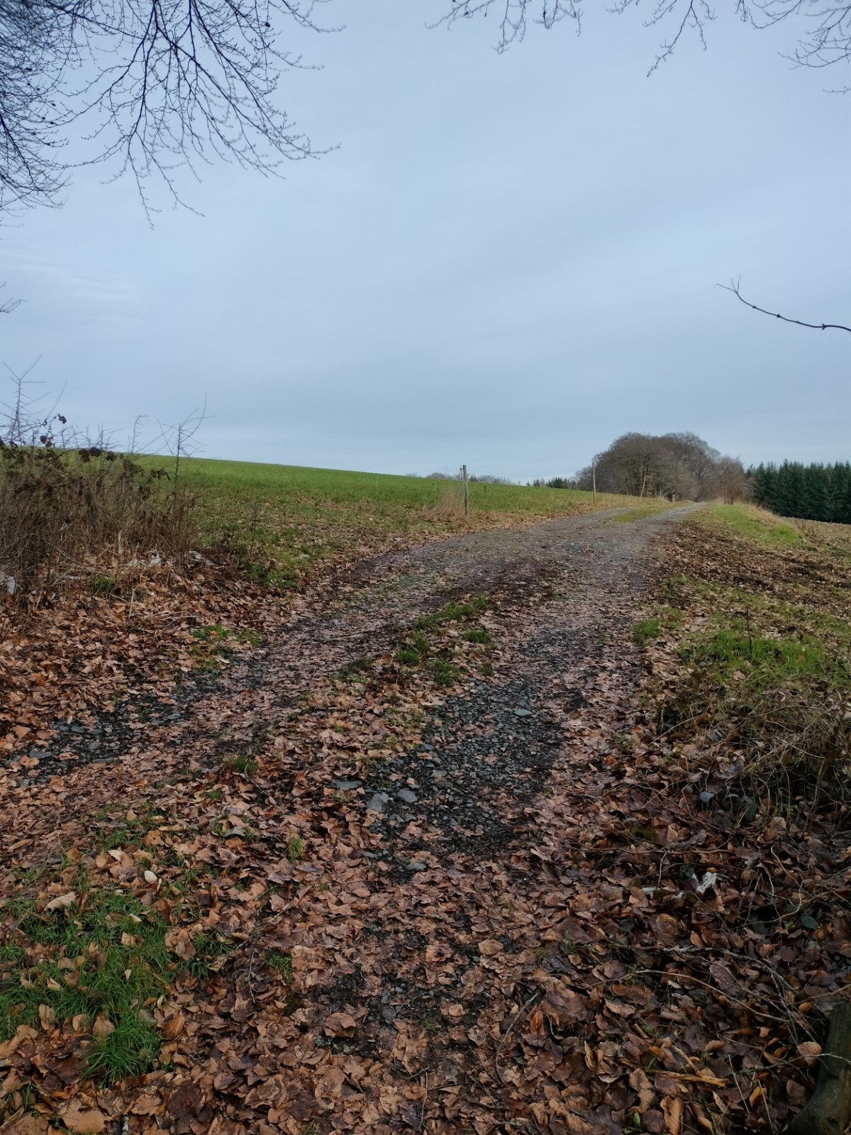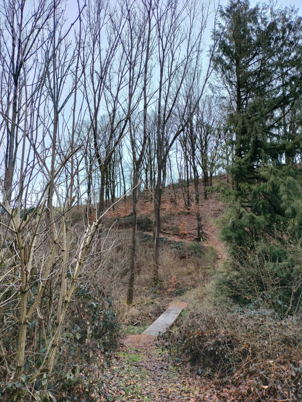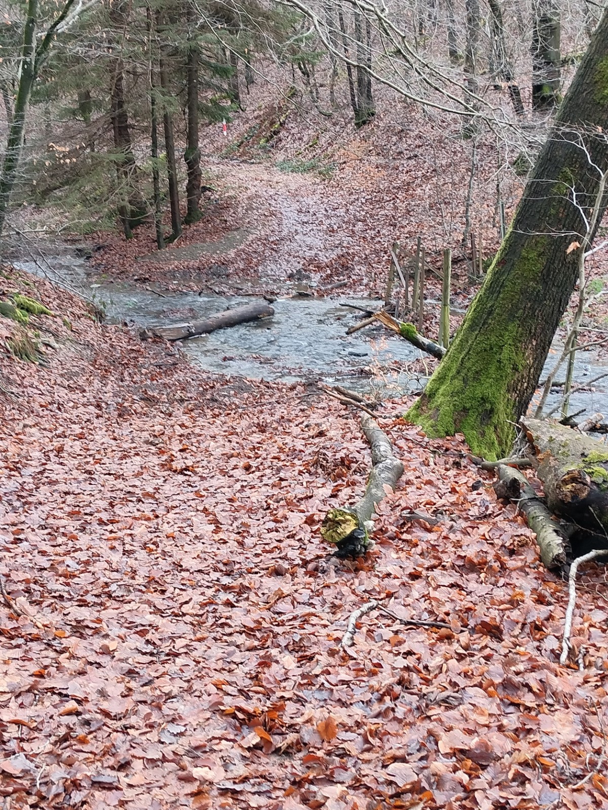 Dillebaach, que nous remontons ensuite sur la rive gauche dans une atmosphère fraîche et boisée. Après avoir longé l’eau, le sentier s’élève progressivement à travers une forêt de feuillus avant d’atteindre une zone plus dégagée en hauteur. Nous entamons alors la descente qui nous conduit au