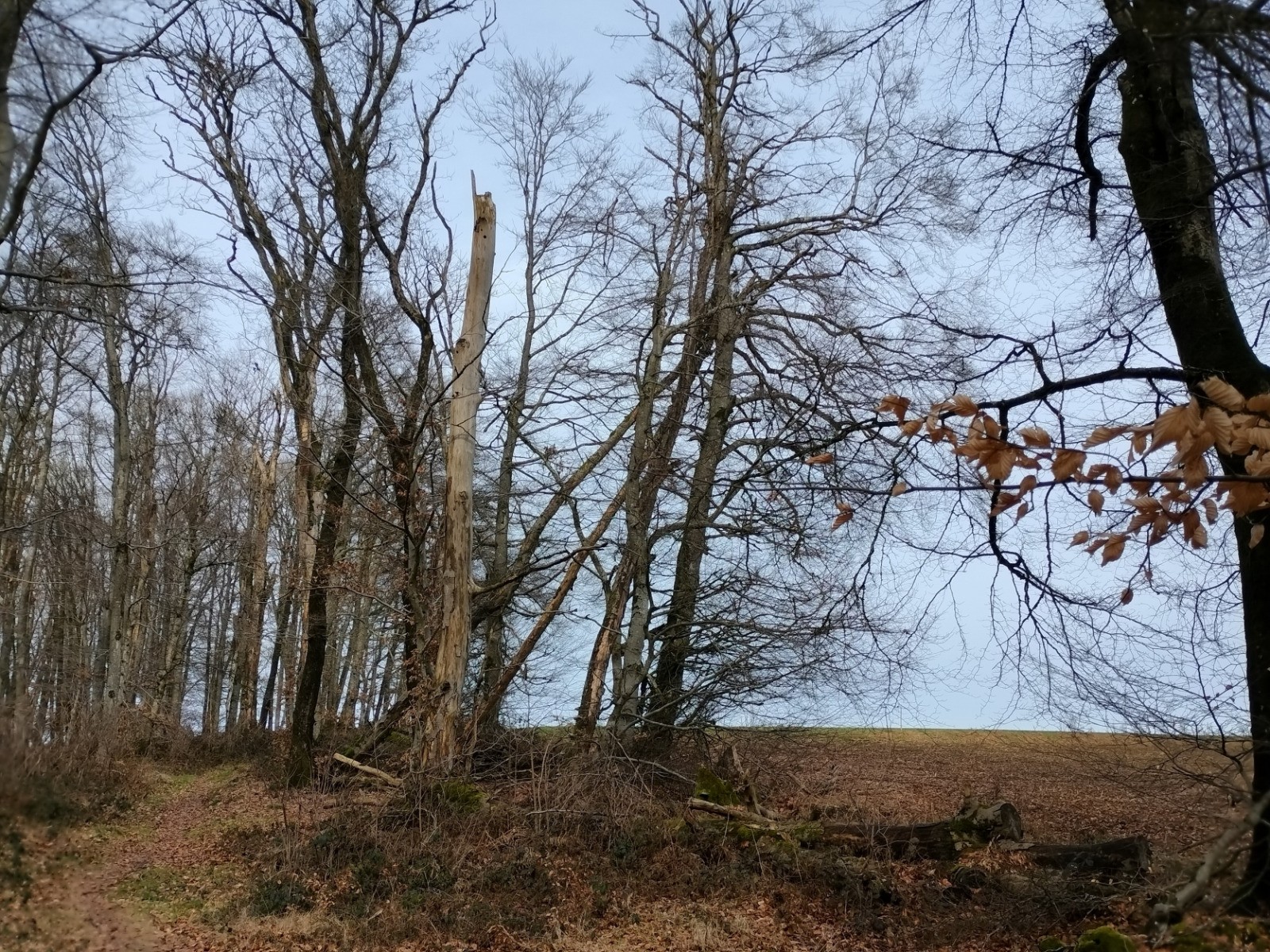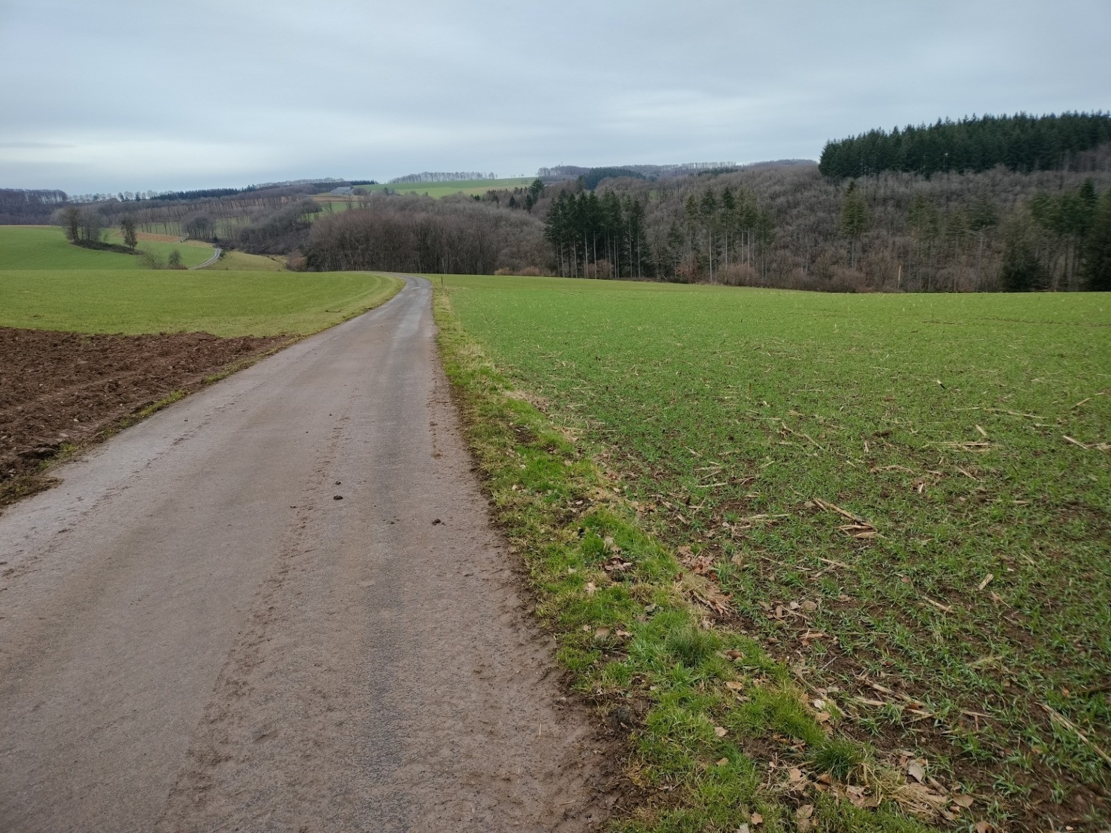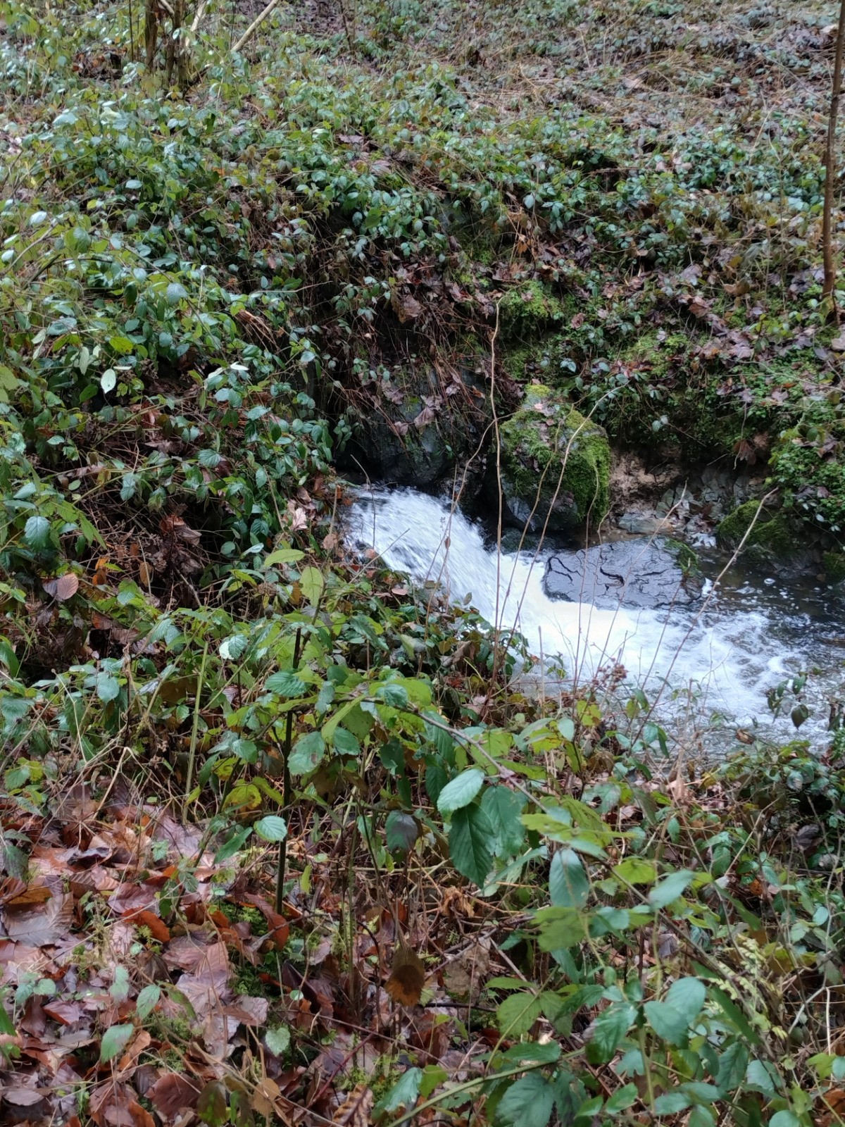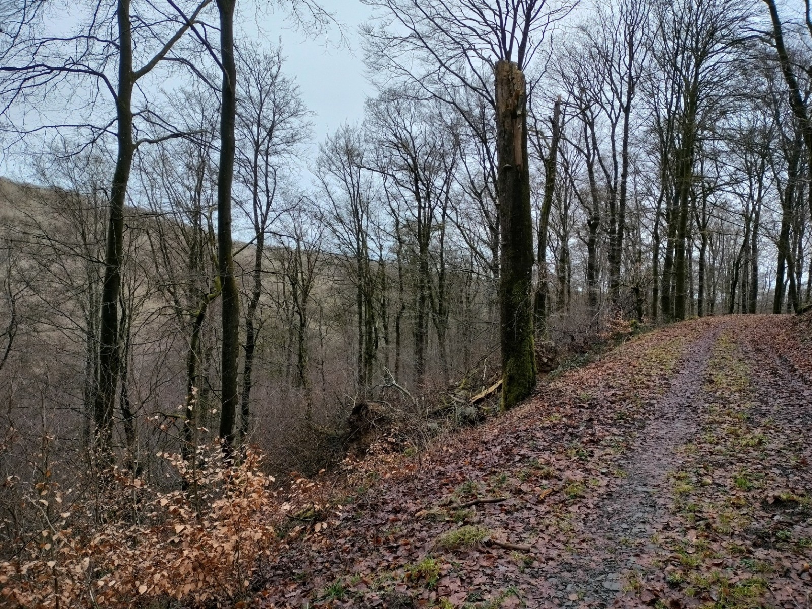 Dillebaach, que nous remontons ensuite sur la rive gauche dans une atmosphère fraîche et boisée. Après avoir longé l’eau, le sentier s’élève progressivement à travers une forêt de feuillus avant d’atteindre une zone plus dégagée en hauteur. Nous entamons alors la descente qui nous conduit au