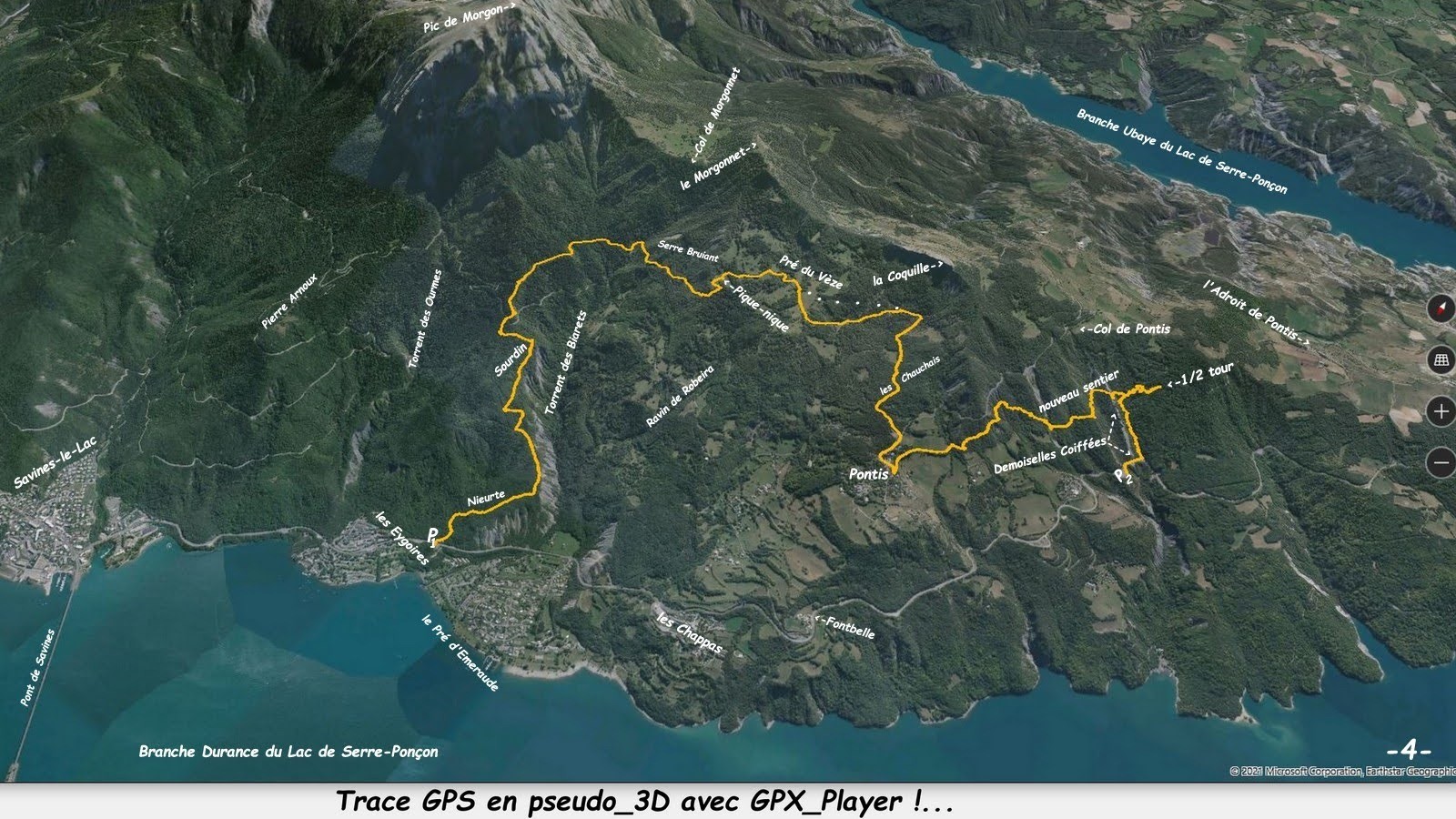 depuis le parking P1 en face du départ du sentier à gauche après les Eygoires sur la D954, 810m > Nieurte > Sourdin > traverser la Route Forestière qu'emprunte le GRP Tour du Lac de Serre-Ponçon et poursuivre jusqu'à la piste supérieure qu'emprunte le circuit du Tour du Lac de Serre-Ponçon à VTT, la suivre jusqu'après son croisement avec le GRP précédent et avant qu'il descende fortement vers la Fontaine du Serre Durian, suivre la draine amont qui monte fortement vers Serre Bruiant pour accéder aux clairières d'alpage de Pré du Vèze > dès la cote 1361m suivre le sentier de gauche (que nous avons raté !) et rejoindre plus horizontalement la piste forestière de Pontis par les Chauchais > de Pontis suivre le tout nouveau sentier des Demoiselles Coiffées qui traverse très intelligemment les Cougnets pour passer ensuite de manière plus scabreuse les ravines au-dessus des dites Demoiselles Coiffées, sans pour autant faire la jonction avec le sentier touristique de ces dernières depuis les parkings officiels sur la D954, pour remonter ensuite probablement en direction du Col ou de l'Adroit de Pontis (probablement pour ne surtout pas déborder sur les Hautes-Alpes et la commune du Sauze-du-Lac, y aurait-il une de ces lamentables querelles de clocher entre ces différentes entités ?) > résultat, nous avons dû faire demi-tour et jouer les sangliers sur une vingtaine de m de dénivelé pour rejoindre la terrasse touristique la plus haute de la visite recommandée du site > descente jusqu'à P2.