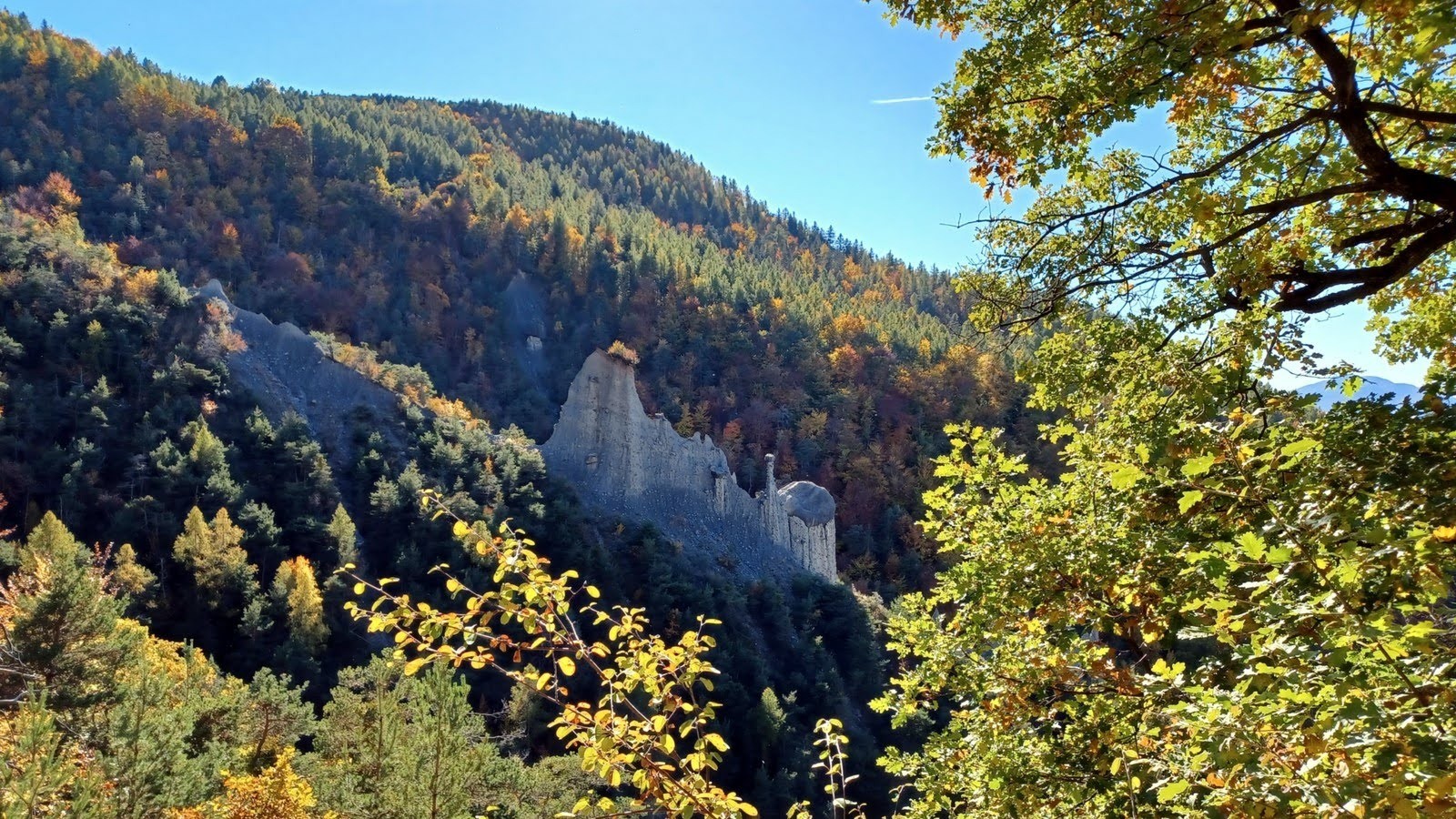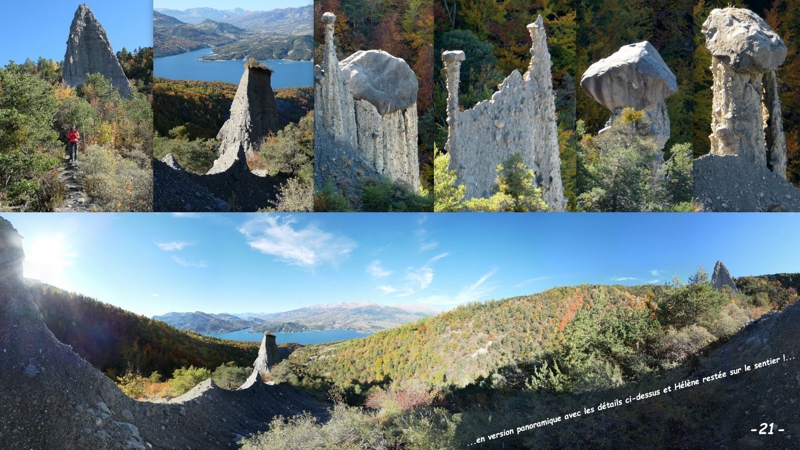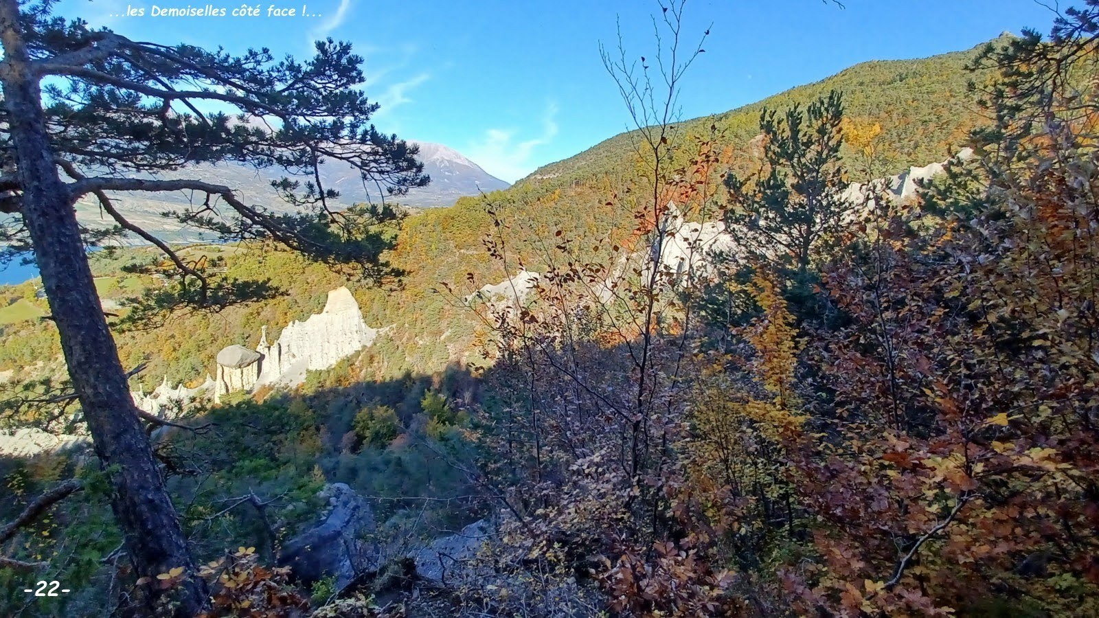 Ainsi nous avons pu profiter d'une de ces magnifiques journées d'automne, avec le ciel bleu azur des Hautes-Alpes enfin retrouvé, les toujours aussi hypnotiques couleurs d'automne de cette grande Forêt de Morgon aux essences très variées et le caractéristique patchwork de bosquets et micro-alpages en versant Nord de la crête du Morgonnet à la Coquille jusqu'à la rive du Lac de Serre-Ponçon; arrivés à Pontis, nous avons profité de cet excellent nouveau sentier qui, parfaitement bien tracé et taillé à la micro-pelle mécanique, se faufile intelligemment dans le relief tourmenté des Cougnets jusqu'à l'abord des ravines du secteur des Demoiselles Coiffées où, terrain oblige, il devient plus étroit, scabreux et a été construit à la main.