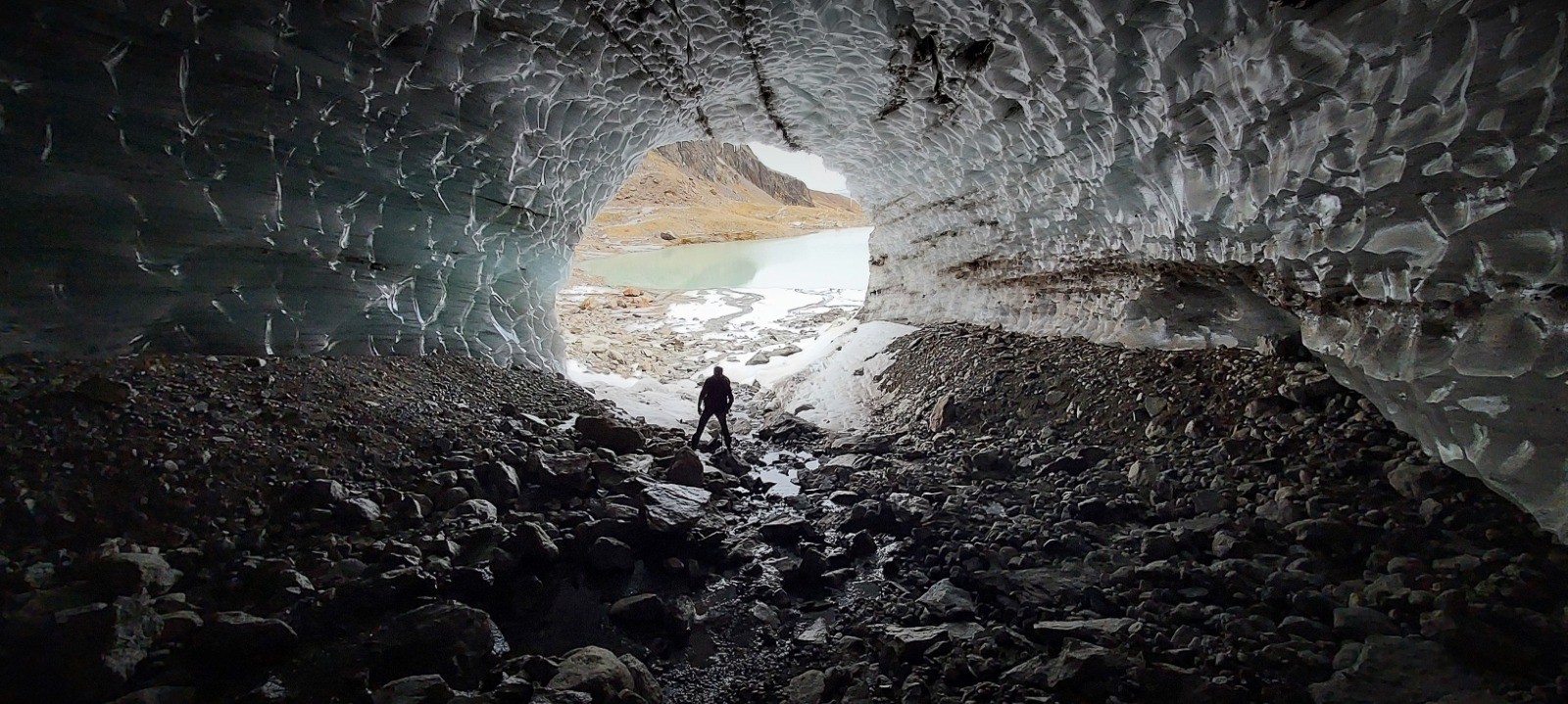 Lac des Quirlies en partant de "Le Perron". Superbe rando d'automne. Le sentier est très bien marqué. Tout au bout du lac, sur le glacier une grotte glaciaire.Attention tout de même aux rochers pris dans la voute, ils pourraient se détacher