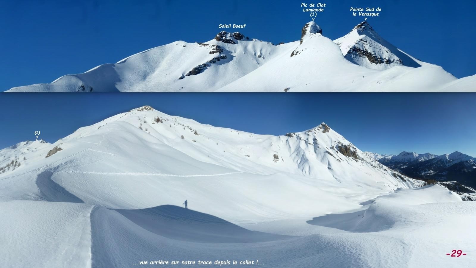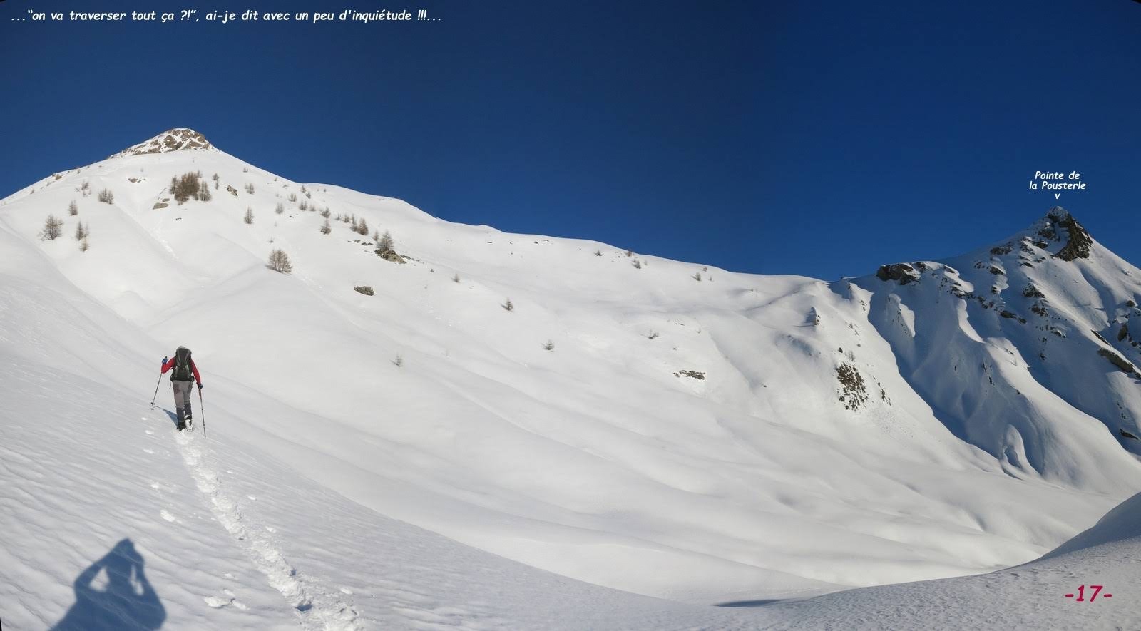 Pour nous changer un peu du célébrissime Palastre, bien trop fréquenté à notre goût, nous avons vainement tenté de grimper au sommet de la Pointe de la Pousterle terminant à l'Ouest la barre rocheuse qui domine au Sud le petit Lac de l'Estang, non nommé sur l'IGN, au creux de Clot Lamiande; sans oublier bien évidemment d'aller revoir le spectaculaire Vallon du Tourond depuis le haut de l'impressionnante barre rocheuse de son Ubac. Pour une raison évidente de sécurité, nous nous sommes bien gardés de suivre le sentier d'été de la Cabane de la Baume et sommes montés par la VN de la Pointe de la Prouveyrat jusqu'au collet, 2180 m, au-dessus de la terminaison Nord-Ouest de la barre rocheuse en rive droite de la combe qui abrite la dite cabane. Duquel, la neige nous paraissant suffisamment stable, nous avons effectué une traversée à niveau puis ascendante pour rejoindre directement la crête Nord-Est de la Pointe de la Prouveyrat au Nord du collet, coté 2302 m, qui la sépare de la Pointe de la Pousterle dont l'accès au sommet est particulièrement raide et relativement étroit sur les 50 derniers m. En présence d'une neige dépourvue de sous-couche, essentiellement composée de gobelets sans aucune consistance jusqu'aux rochers verglacés, par prudence nous avons préféré abandonner à une dizaine de m du but; dommage car ce splendide 360°, déjà pratiqué en traversée hors neige, nous intéressait vraiment, faudra y revenir !...