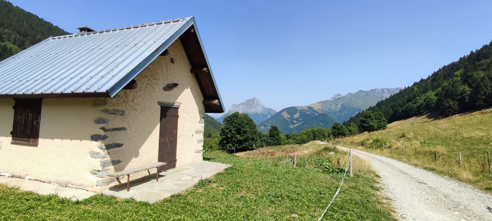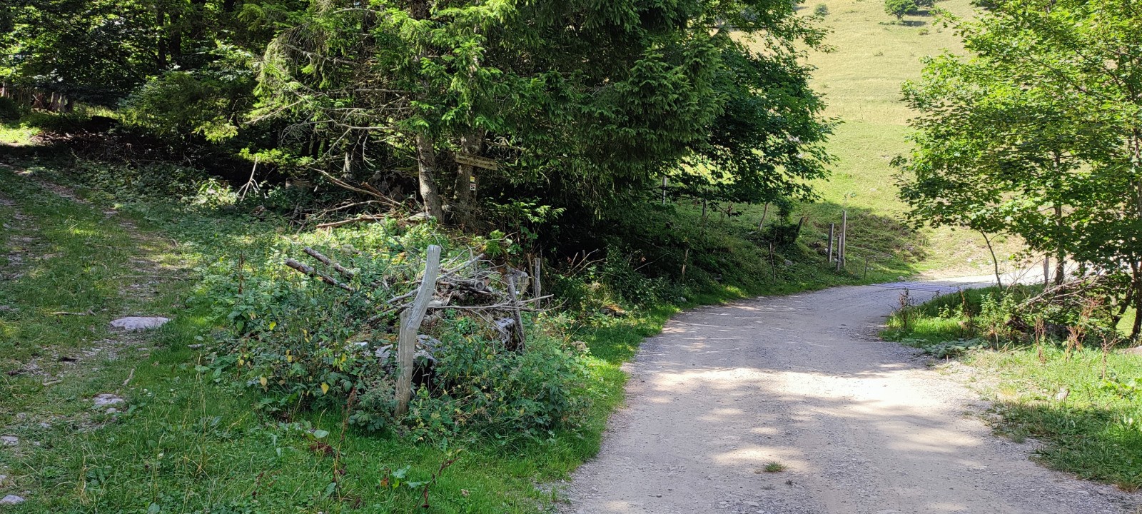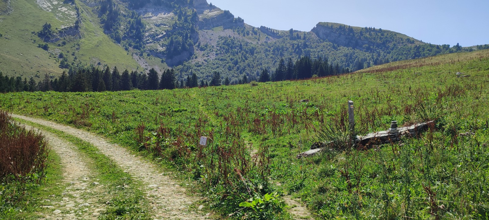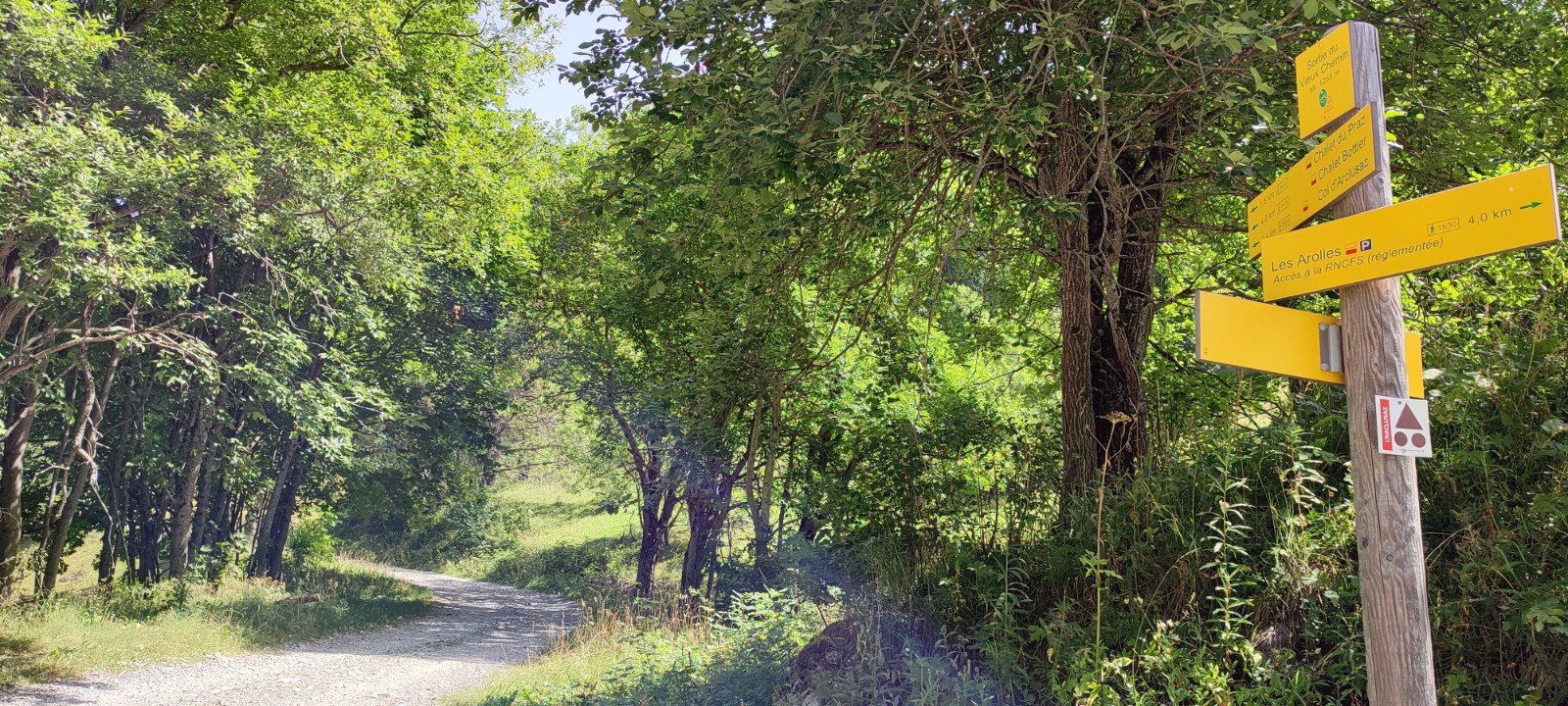 La traversée du ruisseau d’Arclusaz au point 6,6 km (panneau indicateur « Sortie du vieux chemin ») marque la limite de forêt. Désormais, les coins d’ombre seront plus rares.