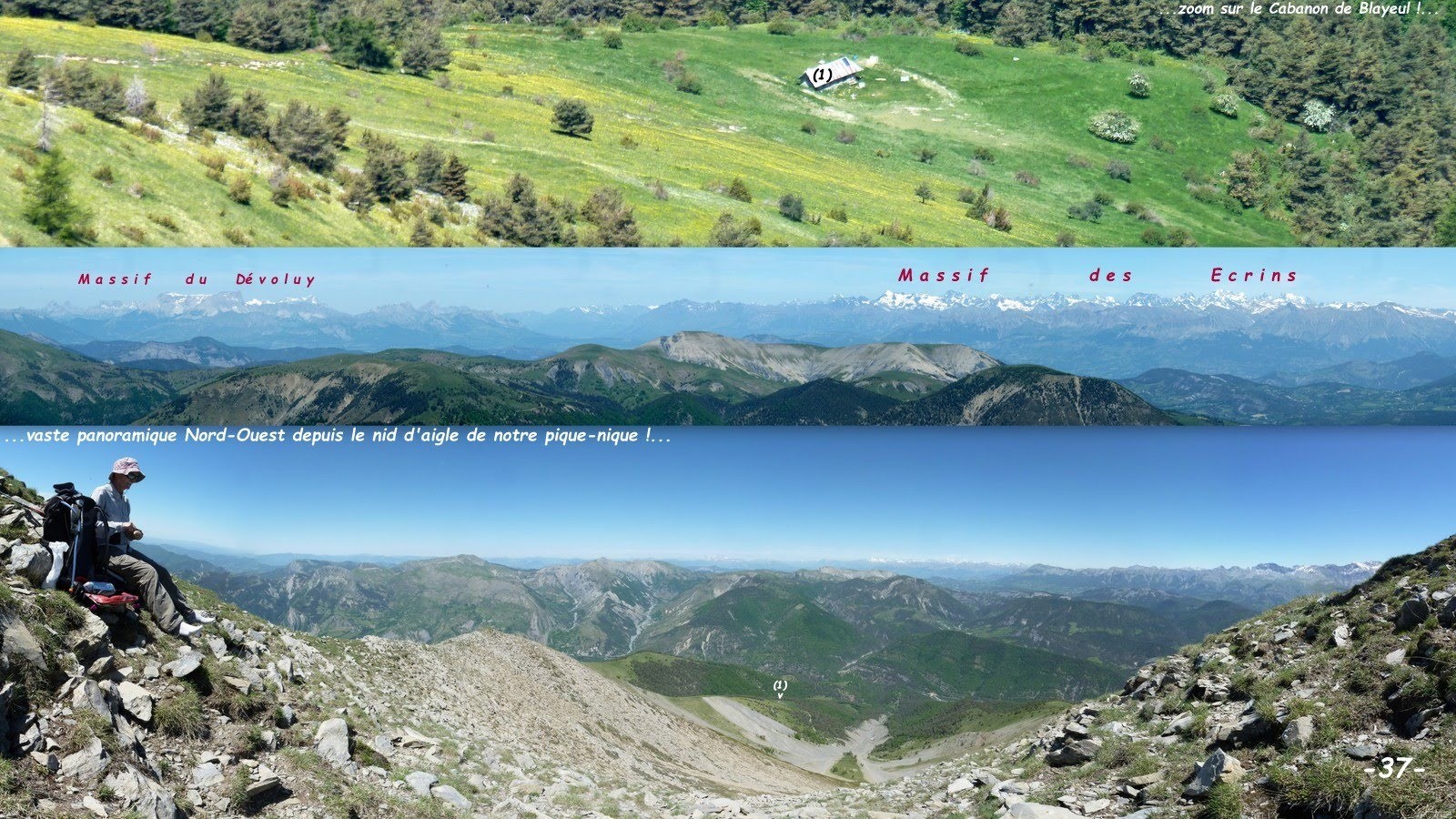depuis la route forestière des Pinées après le Pont du Martinet, 1074 m > de récentes exploitations forestières ayant complètement ravagé la forêt sous Bassette nous ont fait rater la piste de la crête du Bois des Pinées que nous avons retrouvée après un passage involontaire par les prés des Pinées > crête Nord-Ouest du Dou, suivie d'une inflexion vers le Pas de Blayeul de manière à déboucher, pour le spectacle, sur la crête Ouest du Dou juste sur la barre du haut du Ravin des Eyssarts > le Dou > la Tour > Sommet du Blayeul par le fil de la crête, large et facile > visite complète du sommet et de ses plus proches annexes > retour par la crête de montée jusqu'à sa jonction avec la croupe du Cabanon de Blayeul qu'il suffit de descendre au mieux par le fil (nos différents écarts sont le fruit de notre cueillette de fleurs de mélèzes !) > sous le Cabanon, l'ancien sentier du Bois de la Cadenière n'est plus très bien marqué et on se retrouve assez vite à nouveau au milieu des délires des exploitants forestiers ; alors, dépités ! retour parking par la route forestière.
