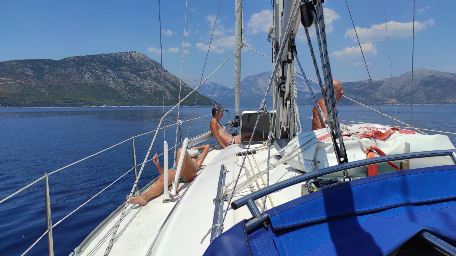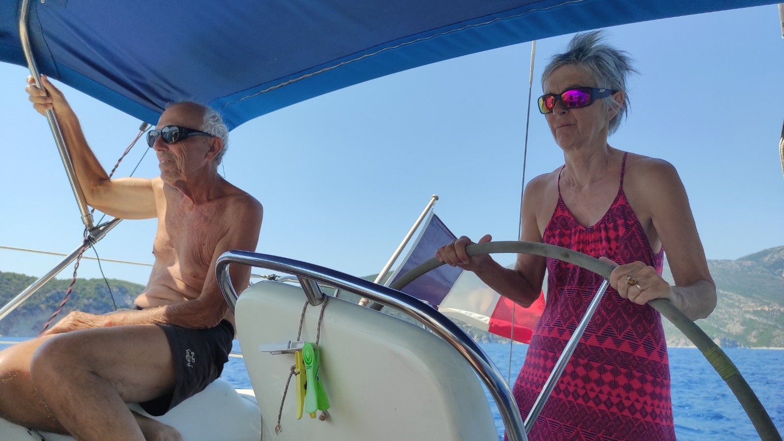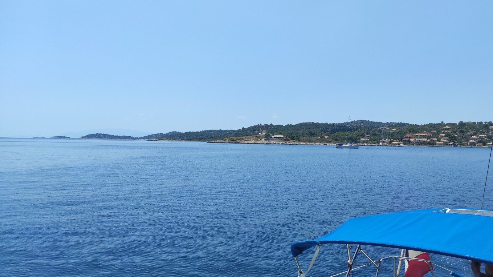 Après tour en paddle et baignade, on quitte notre mouillage aux chèvres. Le berger leur à apporté de l'eau en bateau, nous partons pour le port de Kastos nous ravitailler. Mouillage, courses (pas de fruits), apéro (où je laisse mon téléphone que je reviens chercher en annexe avec Sylvie). On part pour Mitikas où l'on a rendez vous pour le soir avec des amis de Bernard et Maryvonne. Beaucoup de moteur, pas de vent, baignade en pleine mer pour nous rafraîchir car il fait vraiment très chaud.