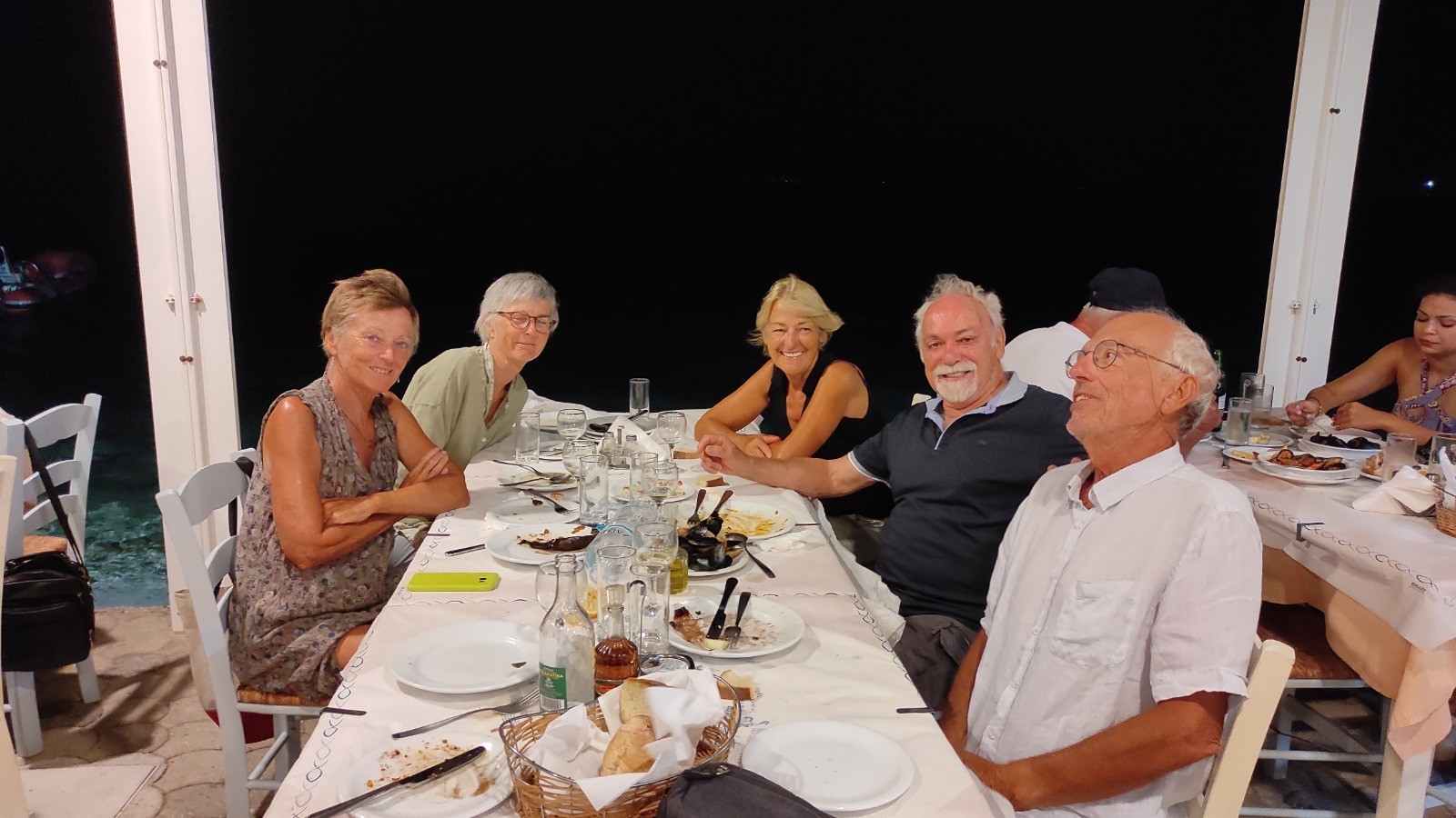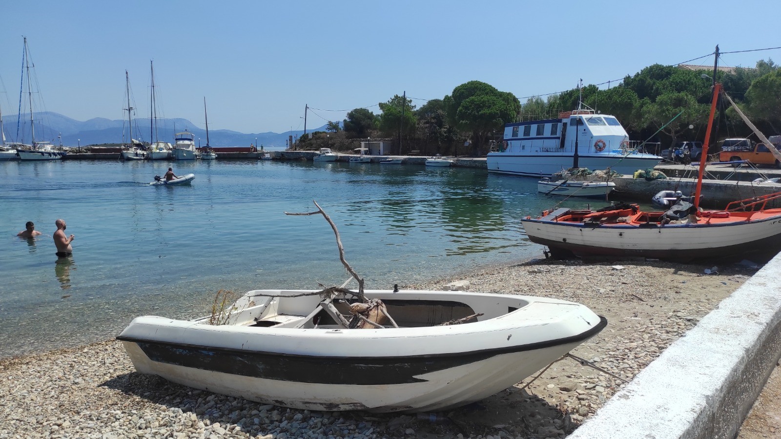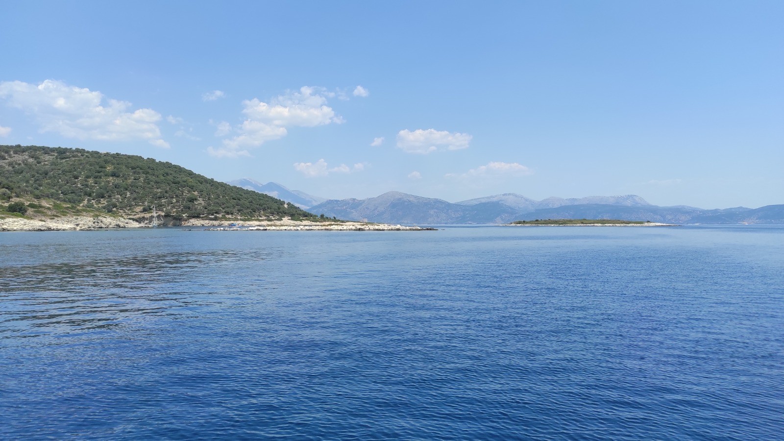Après tour en paddle et baignade, on quitte notre mouillage aux chèvres. Le berger leur à apporté de l'eau en bateau, nous partons pour le port de Kastos nous ravitailler. Mouillage, courses (pas de fruits), apéro (où je laisse mon téléphone que je reviens chercher en annexe avec Sylvie). On part pour Mitikas où l'on a rendez vous pour le soir avec des amis de Bernard et Maryvonne. Beaucoup de moteur, pas de vent, baignade en pleine mer pour nous rafraîchir car il fait vraiment très chaud.