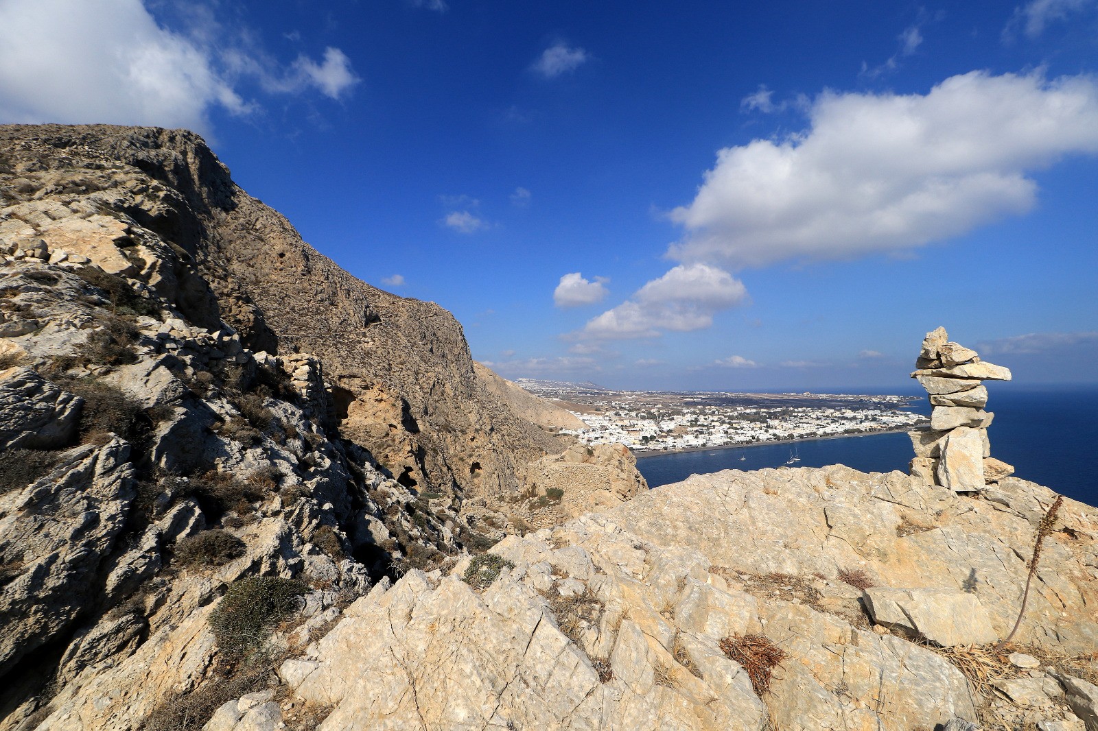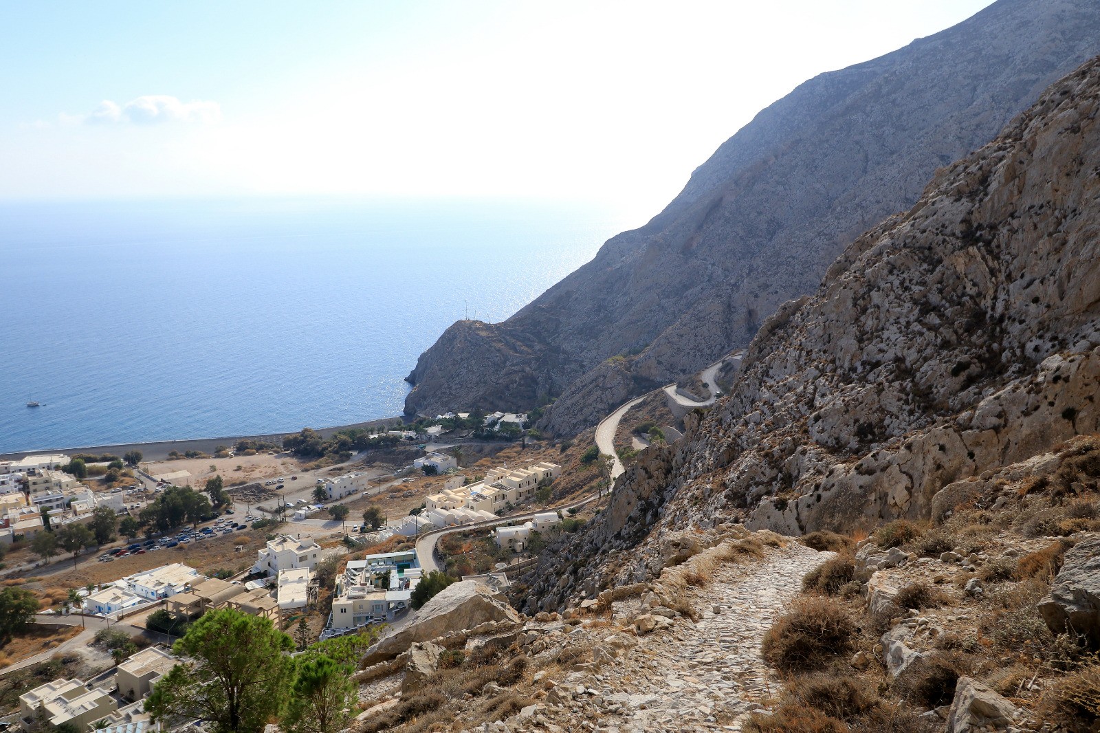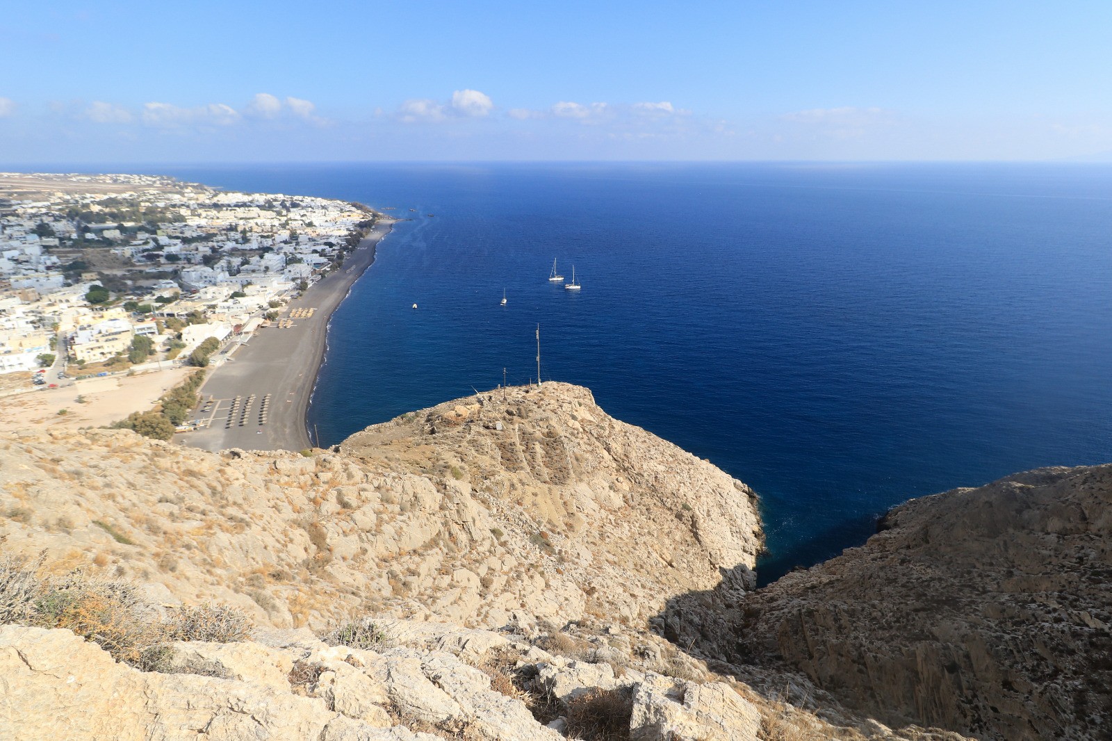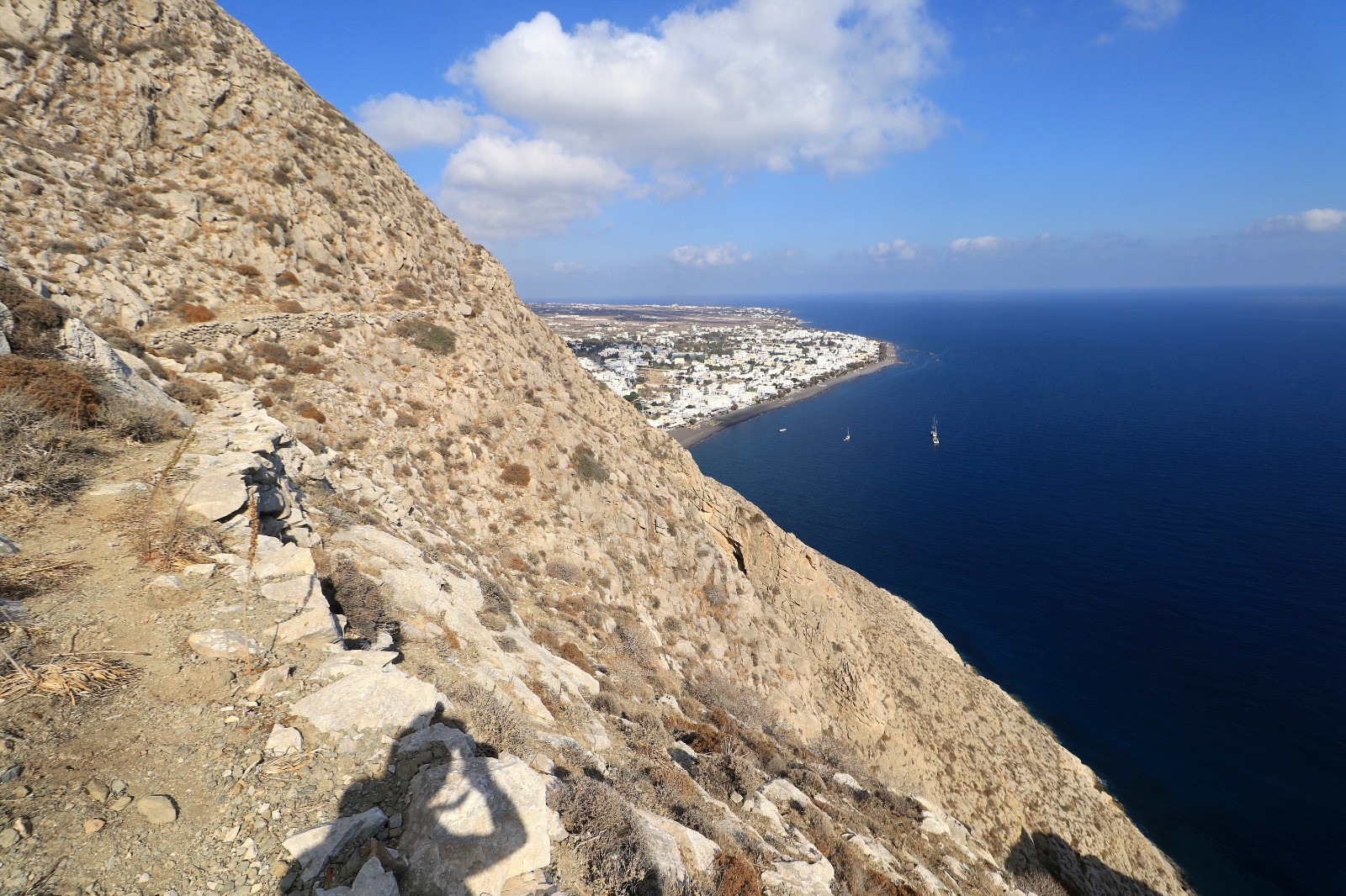 www.pascal-sombardier.com/santorin-randonnees-du-vertige "Depuis la plage de Kamari, nous apercevons un sentier qui traverse les escarpements de la pointe est en direction de l'ancienne cité de Théra, fondée par les Spartiates. Après avoir cherché un peu, nous en trouvons le départ."
