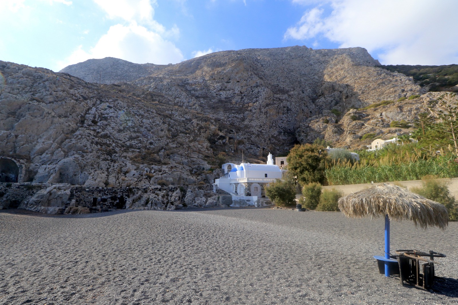 www.kalimera-greece.eu/santorini-trips/church-with-spring-zoodochos-pigi-santorini-island/) jusqu'à la plage de sable noir de