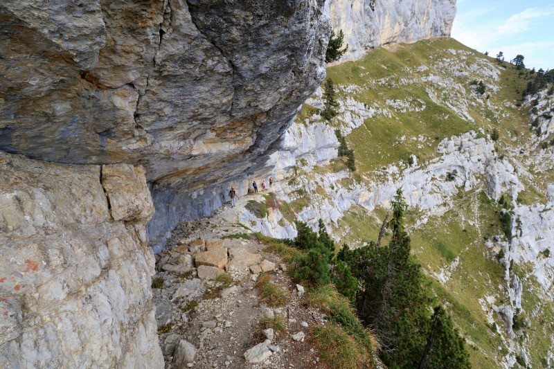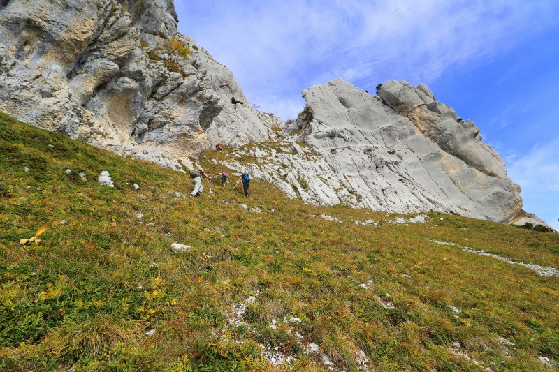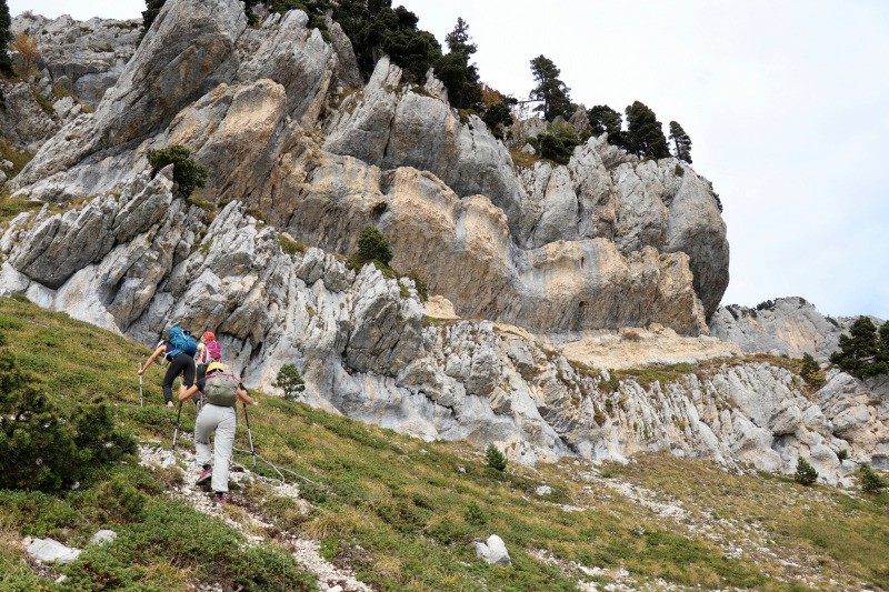 Pas de Montbrun" un sentier qui monte raide et sort de la forêt vers 1600. Le sentier part N-NE jusqu'au pt ign 1618. De là partir droit dans la pente à droite d'un piton rocheux. Le pas de Montbrun passe dans cette faille (marques bleues)...