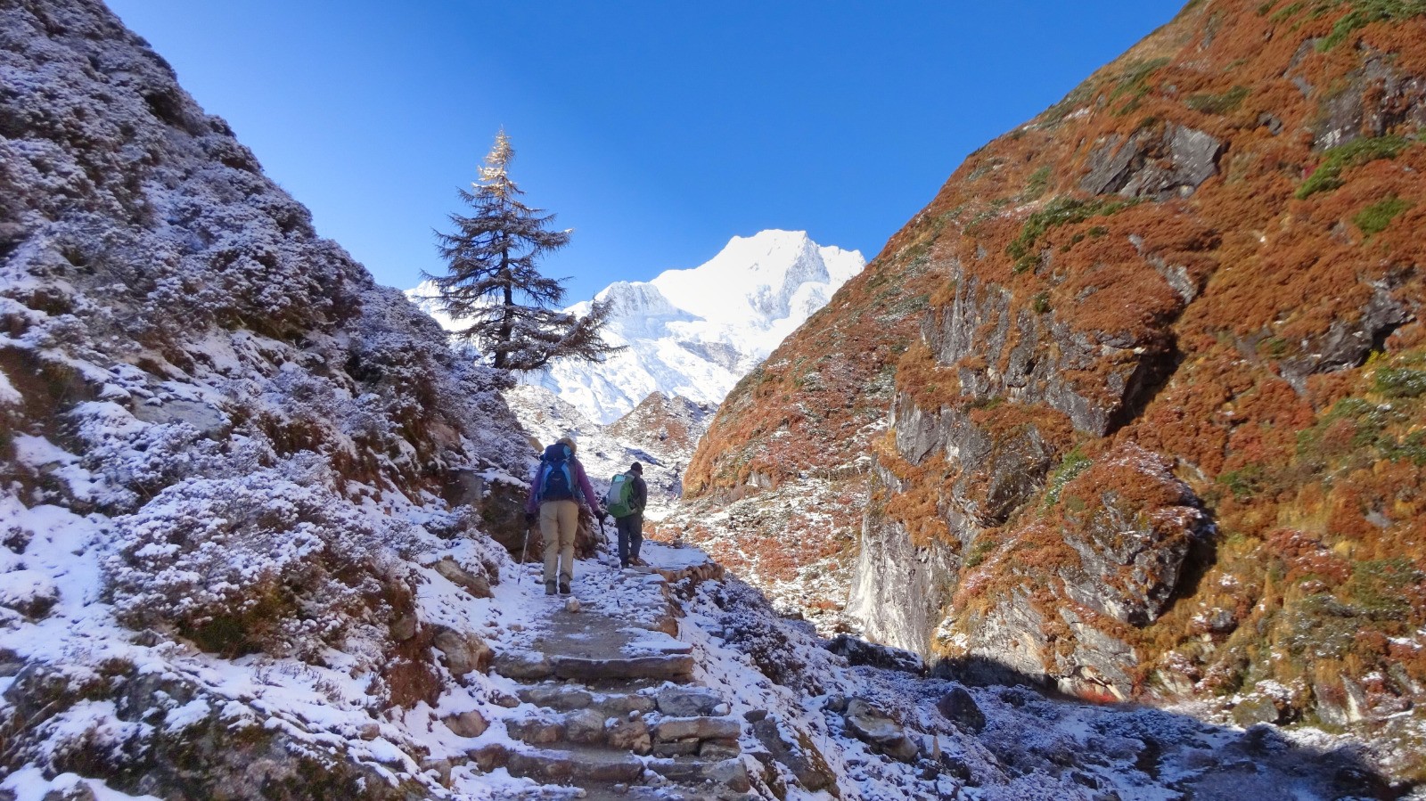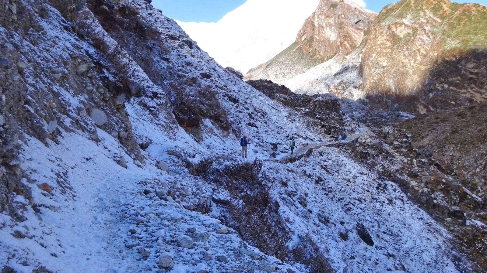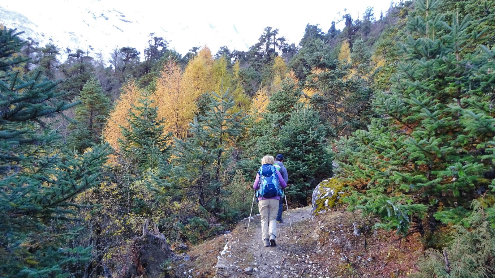 Nous quittons Shyala par un splendide sentier bien raide qui serpente au milieu des forêts de conifère, quelques passages en corniche enneigés voir verglacés la vallée se présente avec de beaux passages çà et là sur des portions glissantes, on rejoindre le sentier principal d’accès au monastère, une belle première partie !