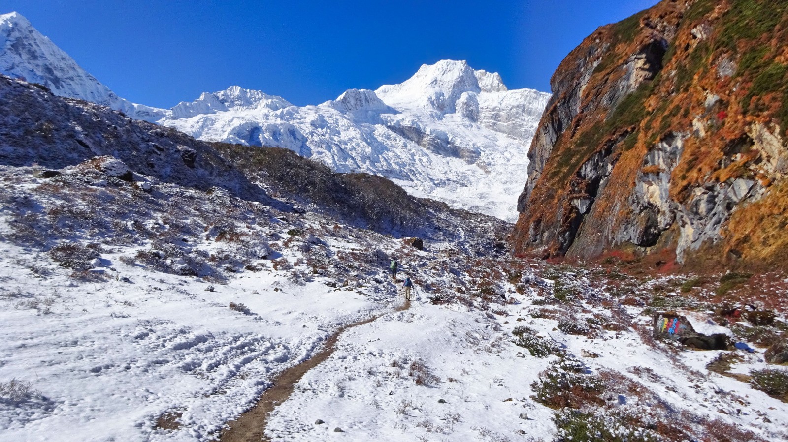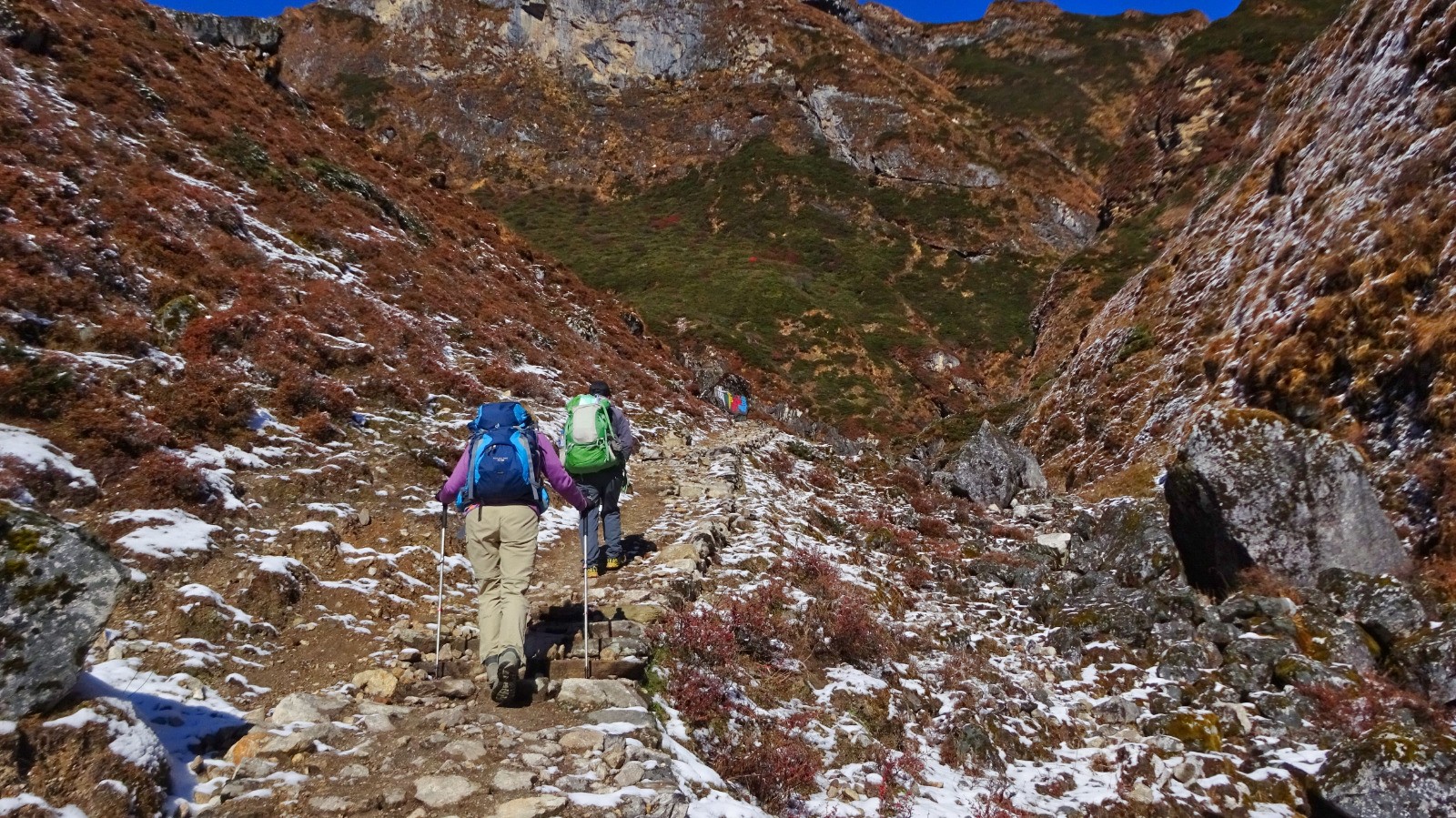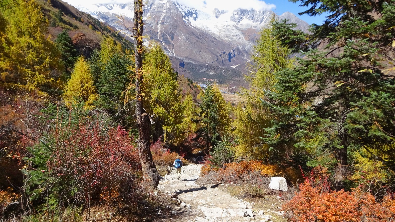 Nous quittons Shyala par un splendide sentier bien raide qui serpente au milieu des forêts de conifère, quelques passages en corniche enneigés voir verglacés la vallée se présente avec de beaux passages çà et là sur des portions glissantes, on rejoindre le sentier principal d’accès au monastère, une belle première partie !