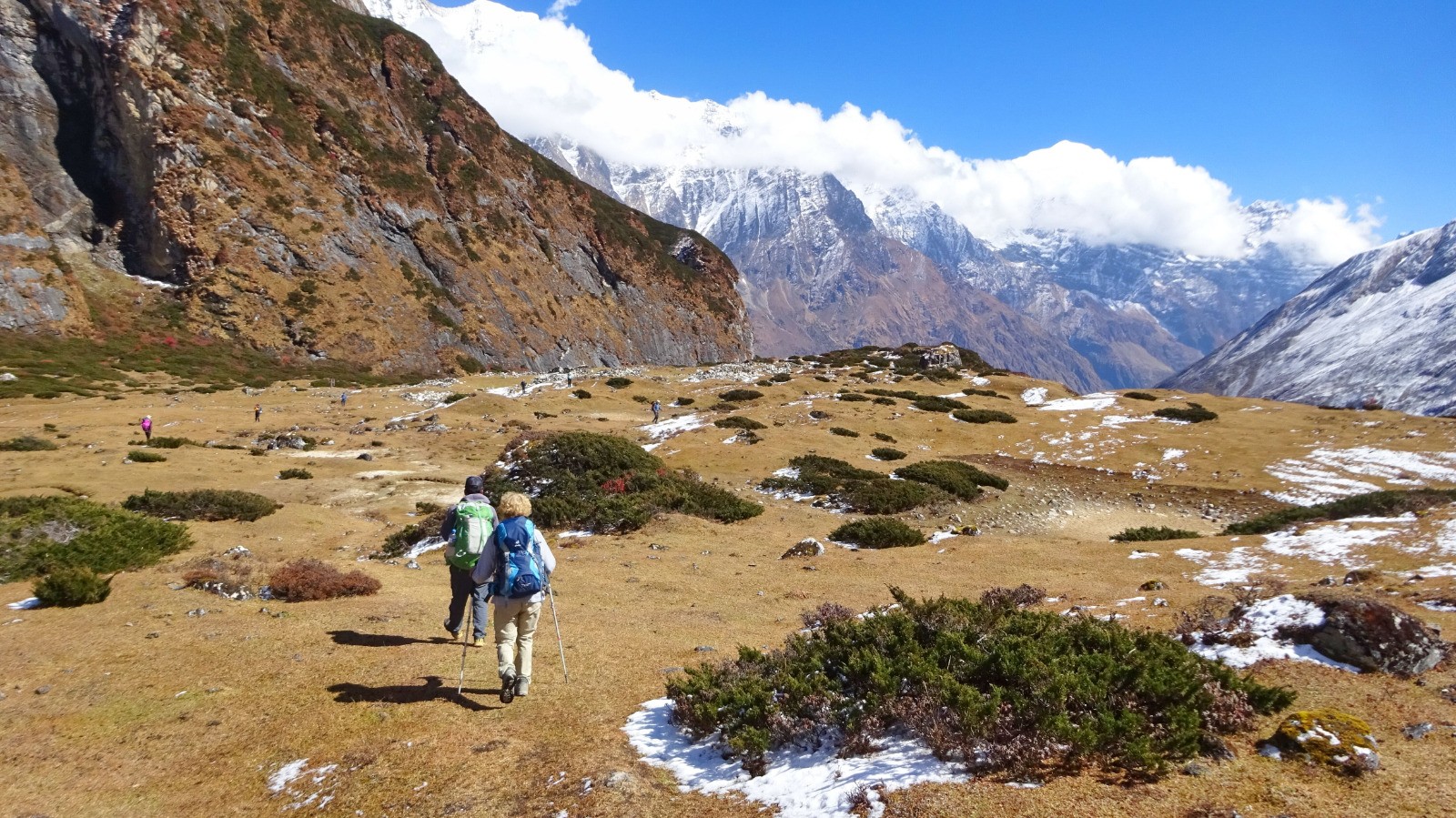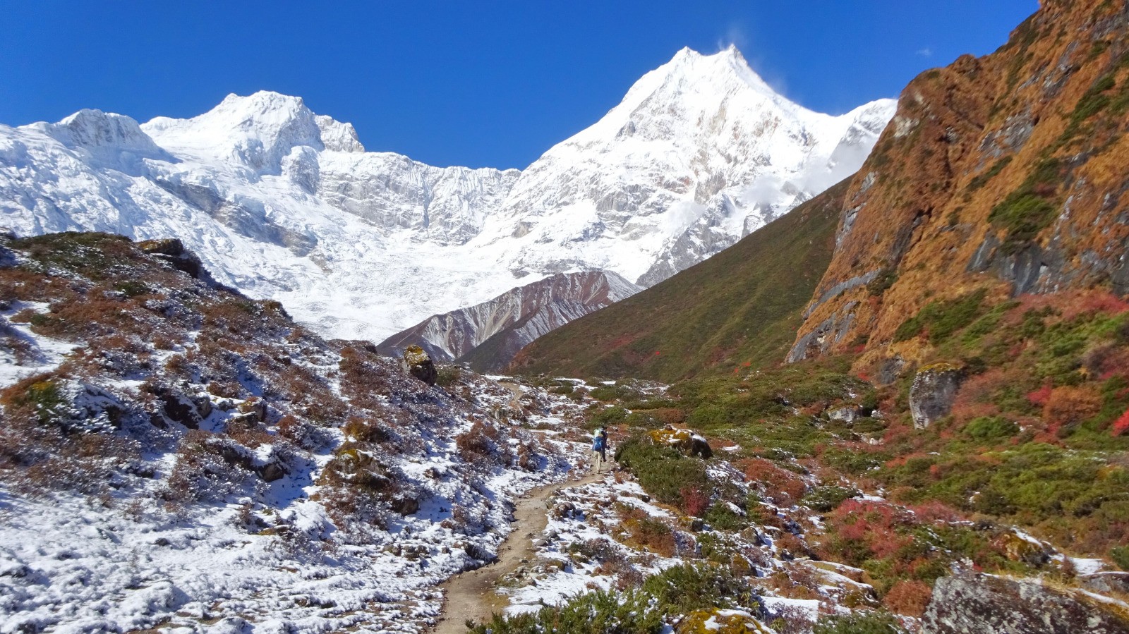 On enchaîne ensuite par une longue montée avec son cortège d'escaliers, les paysages sont grandioses, la vallée s'élargit et laisse place à un panorama exceptionnel sur le Manaslu et les autres sommets.