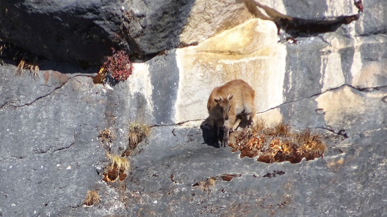 Retour vers Samagaun en partie par le chemin de l'aller, on croise au passage des chamois qui évoluent avec aisance sur la falaise.