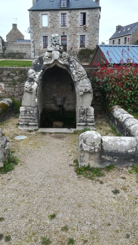 Explication du "presque" : le chemin officiel ne passe pas réellement à la chapelle et c'est un tort :-)) Plutôt que de passer par Kerhuellan pour rejoindre la D74 après la Chapelle des 7 Saints, le chemin des améthystes emprunte le GR34A : juste à 'entrée des "Sept Saints", il oblique sur la gauche pour passer juste à côté du Léguer avant Pont Coat Dunois. Il rejoint la D74 peu après. En cherchant la fontaine (sans la trouver vu que je m'étais trompé de piste), j'ai quelque peu raccourci le chemin officiel mais le mien était fort beau aussi ! A noter : un très beau saule (ou bouleau ?) pleureur avant d'arriver à Kerhuellan mais surtout un gros chien blanc assez "protecteur" (m'a fait un peu peur) à Kerhuellan même !