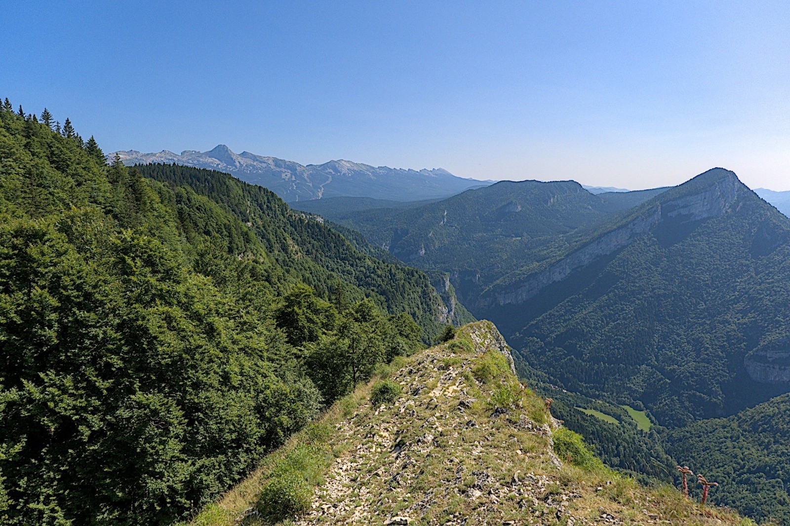 Il y a plus ou moins une sente de bout en bout. Parfois bien marquée, parfois à peine visible. Terrain parfois un peu chaotique (rochers, lapiaz, arbres en travers) mais globalement pas difficile. Très jolie vue sur les parties découvertes de la crête. Voir le topo pour plus de détails.