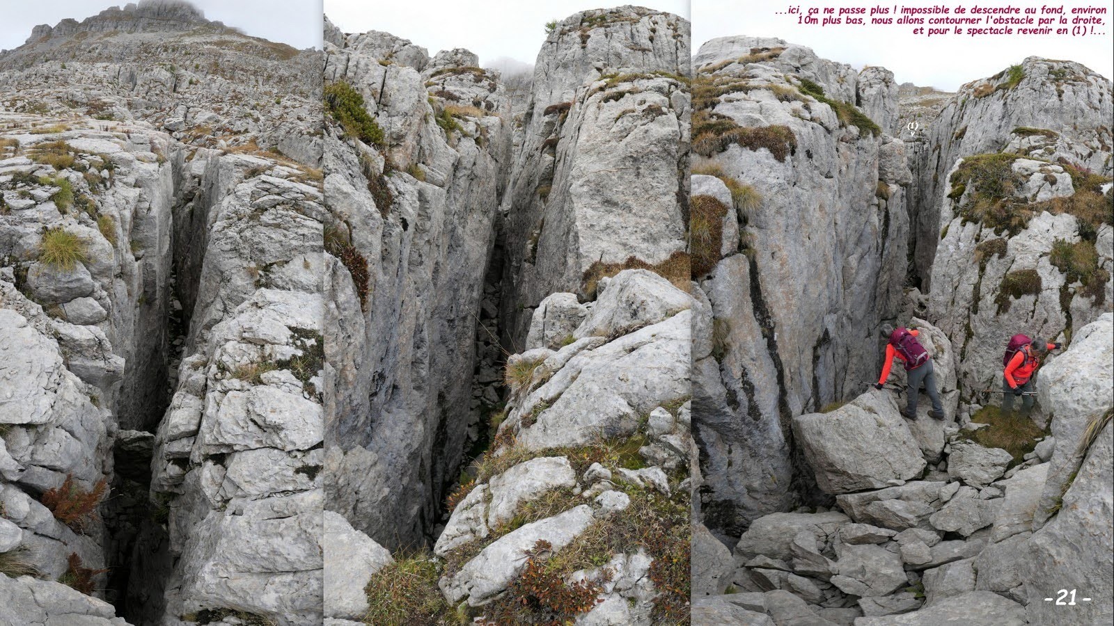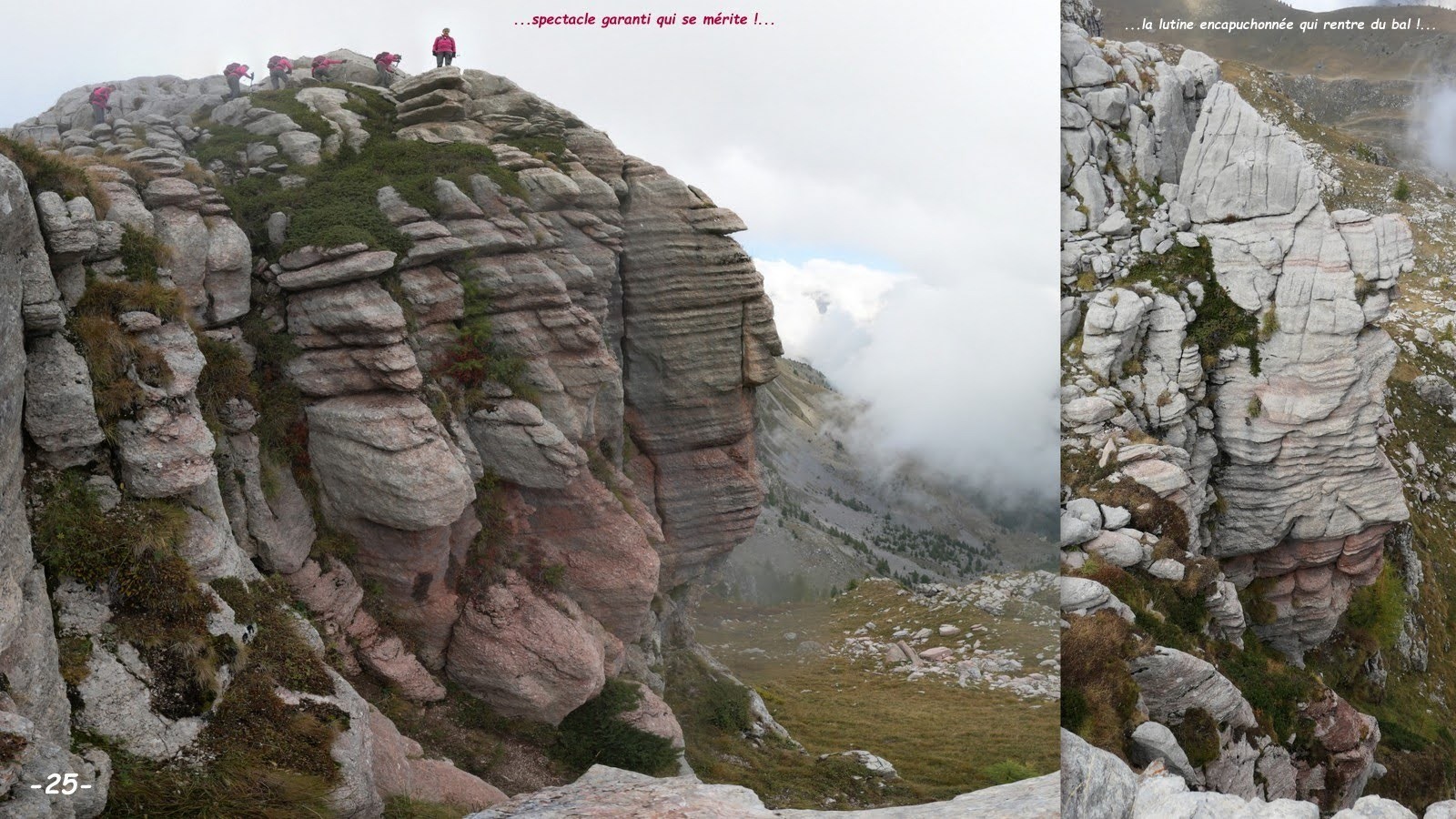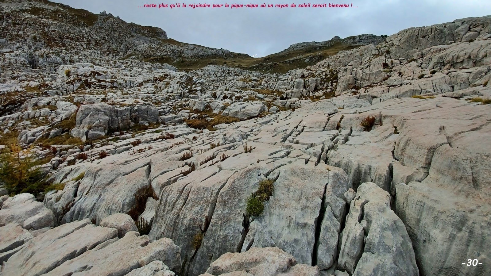 Si, une fois de plus, nous n'avions pas été trahis par les prévisions de Météo France, ç'aurais dû être le grand jour; manque de bol c'est presque la tête dans les nuages que nous avons essayé de profiter au mieux de cette singulière immensité calcaire qui, vue du sommet des Aiguilles de Chabrières, en dehors de ses multiples failles en forme de crevasses, donne l'impression d'être assez horizontal mais qui, ramené à l'échelle humaine, se révèle être un champ de bataille des plus tourmentés qui met les genoux à rude épreuve.