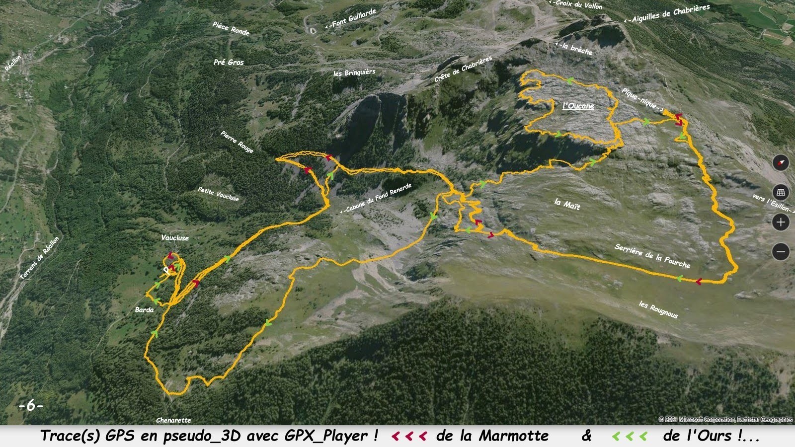 depuis la route sylvopastorale de la Cabane de Corbières, juste après les Chalets de Vaucluse et le départ des sentiers pour la dite Cabane et celle du Fond Renarde, vers Barda et Chenarette > Cabane du Fond Renarde jusqu'au sentier du circuit classique des Aiguilles de Chabrières par la Brèche, l'Oucane et le Vallon des Rougnous (suivre le sentier comme la trace de la Marmotte ou couper l'épingle la plus orientale, comme la trace de l'Ours) > vers 1950m abandonner le sentier balisé au profit d'une sente à moutons relativement bien marquée qui emprunte le couloir d'accès direct à l'Oucane et en effectuer la visite la plus exhaustive possible selon son goût, ses compétences sportives et son sens de l'itinéraire en exploitant au mieux les nombreuses opportunités offertes par le terrain, véritable labyrinthe calcaire particulièrement érodé et crevassé, dont nous avons eu le plaisir d'effectuer le tour le plus large qui soit de sa partie, à notre sens, la plus spectaculaire > retour par son collet pour le rendez-vous du pique-nique avec la Marmotte qui s'est contentée d'un aller-retour par le sentier balisé tandis que l'Ours en a profité pour effectuer une reconnaissance de l'alpage en semi-balcon au-dessus de Vaucluse.
