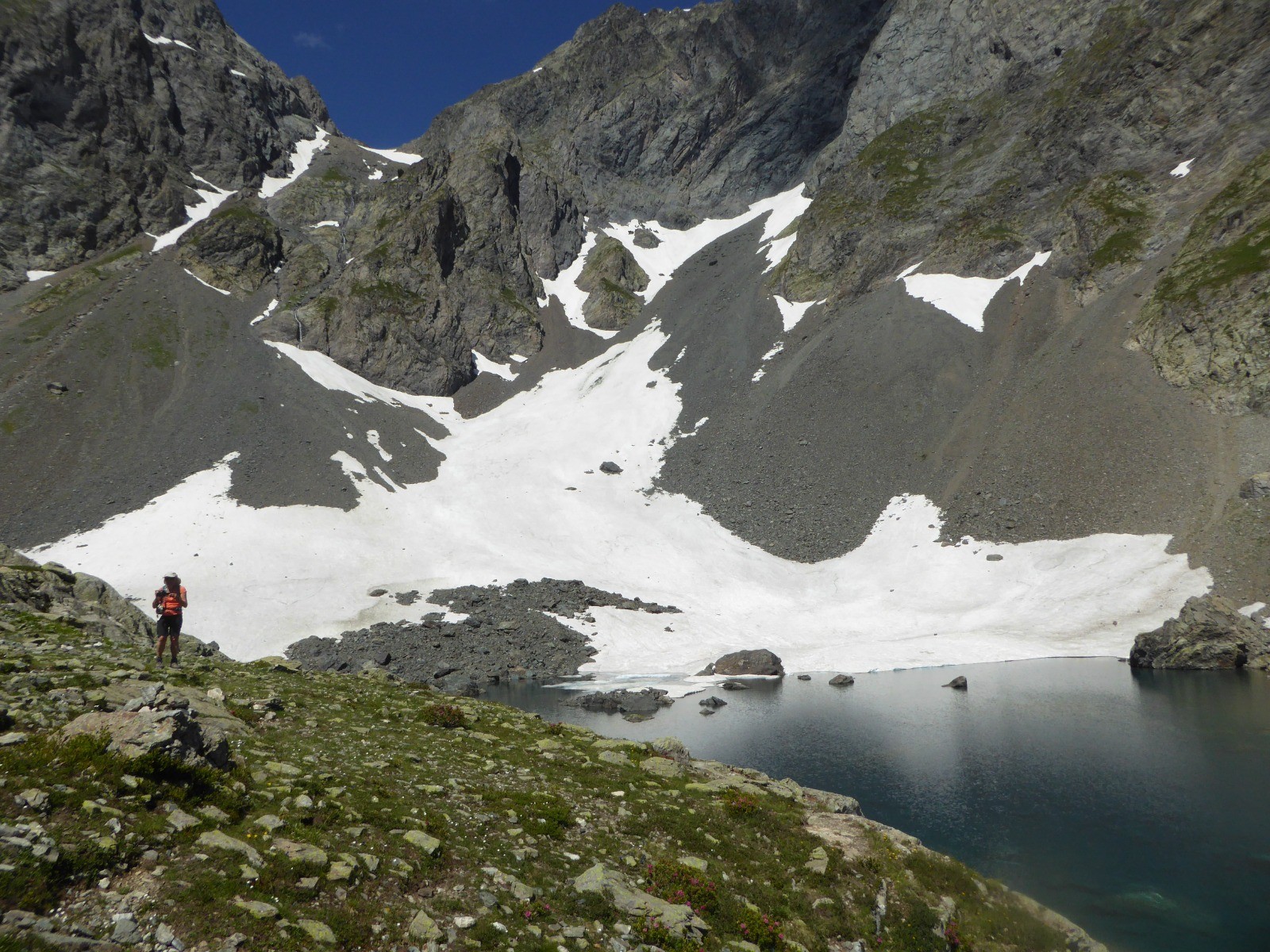 Lac très clair sous la croix de Belledonne. encore un beau névé qui se jette ds le lac