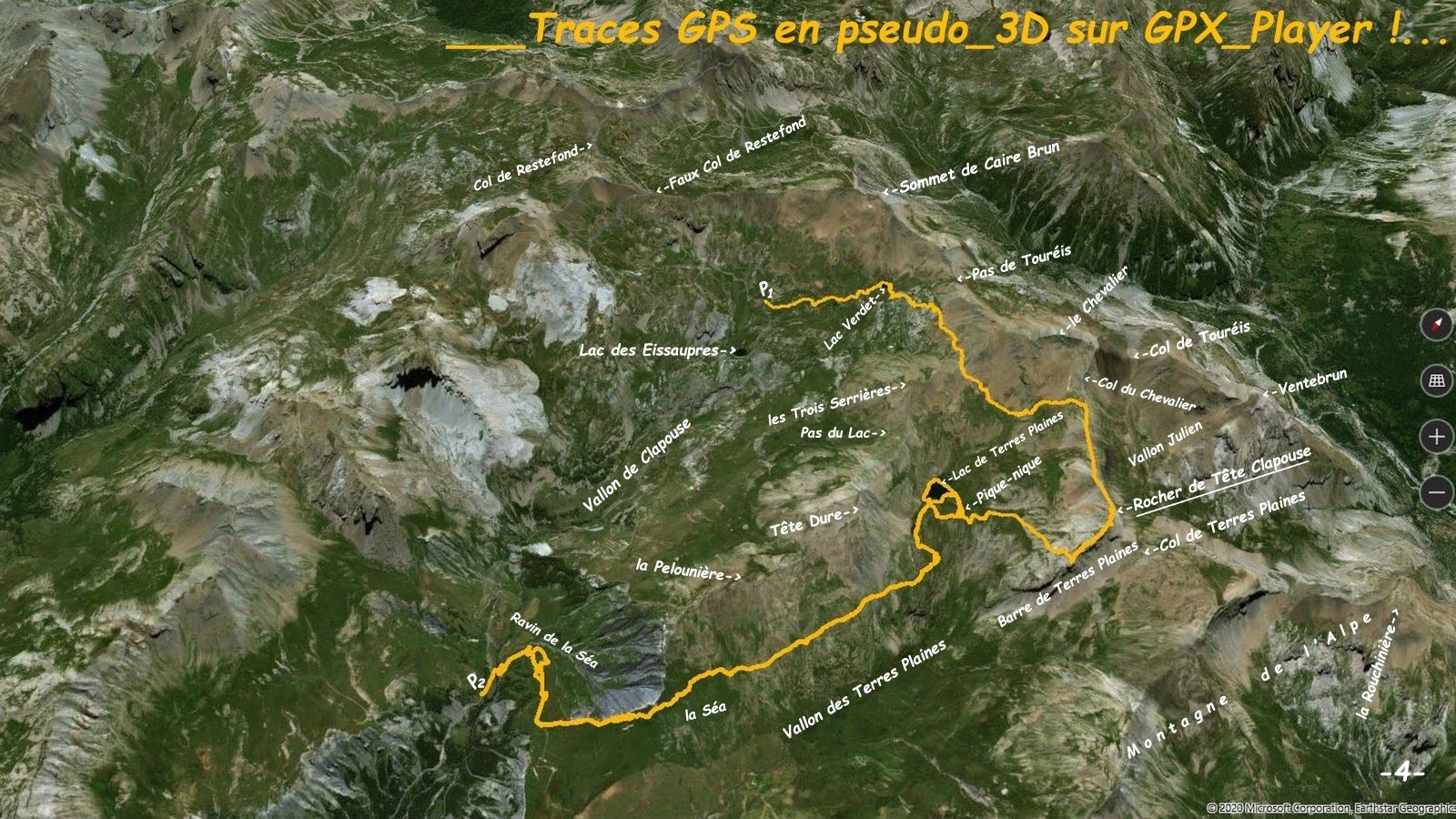 depuis le lacet à 2370 m sur la Route Stratégique de Restefond > rejoindre au mieux le sentier du Lac Verdet > le lac et l'accès le plus direct aux Roches Blanches et leur micro-lac, au-dessus viser le point le plus bas, 2667 m, entre les crêtes Nord-Est du Chevalier et Sud-Ouest des Trois Serrières > descendre dans la combe du Lac de Terres Plaines et traverser au mieux sous les pierriers en direction du Col du Chevalier > rejoindre sa crête Nord-Ouest en restant le plus possible dans le vert > remonter cette longue arête assez aérienne par son fil jusqu'au Rocher de Tête Clapouse en franchissant 2 dents de plus en plus techniques, aucune difficulté majeure et rocher relativement bon, mais où il ne faut surtout pas chuter, une assurance peut être utile pour les moins aguerris > descendre en longeant les Barres de Terres Plaines et rejoindre au mieux le Lac homonyme > retour par le splendide sentier en balcon du Vallon des Terres Plaines, suivi de celui de la Séa et la Chaup, jusqu'à la cote 1917 m sur la Route de Restefond, lorsqu'on a la chance de bénéficier du Taxi-Marmotte, sinon par le Pas du Lac et le Vallon du Chevalier, pour rejoindre au plus court le point de départ.
