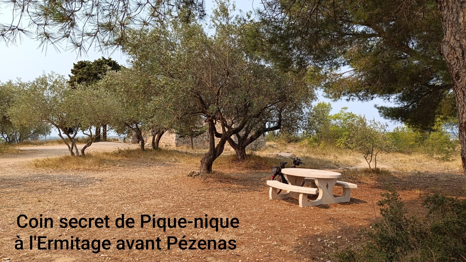 Un pique-nique est prévu à l'Ermitage de Saint Antoine juste avant Pézénas sur une table secrète qui se mérite avec un passage en gravel.