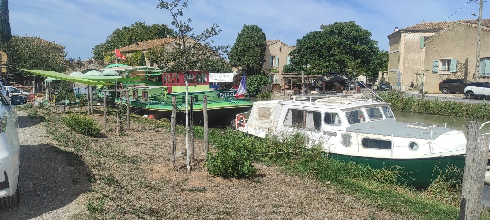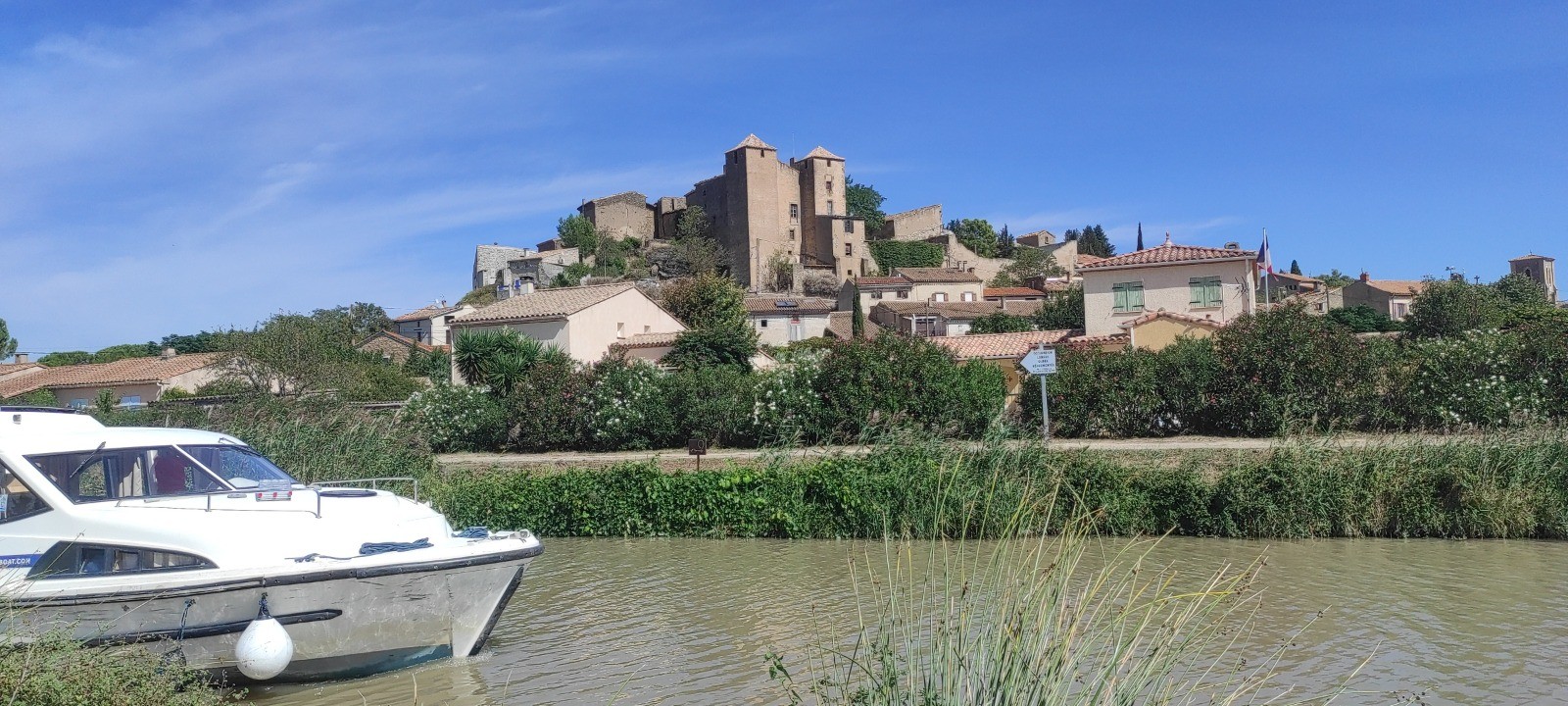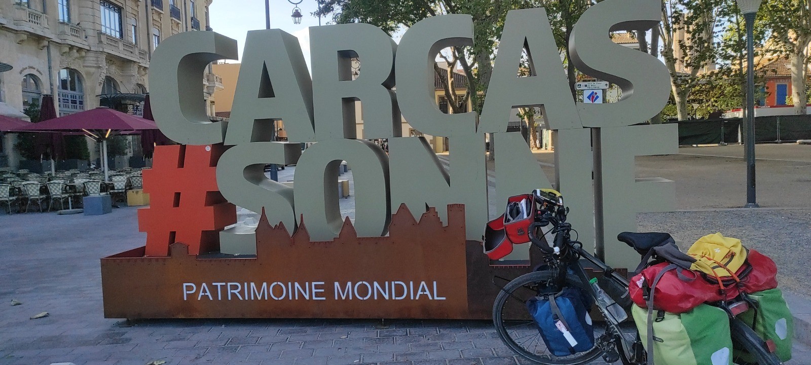 Carcassonne n'est pas loin et difficile d'accès. Chemin étroit, mal indiqué, et finalement je me retrouve en dehors de la ville sans n'avoir rien vu. Ça roule bien. Je revoie une cycliste aux sacoches à l'avant qui a dormi sur le bord du canal.