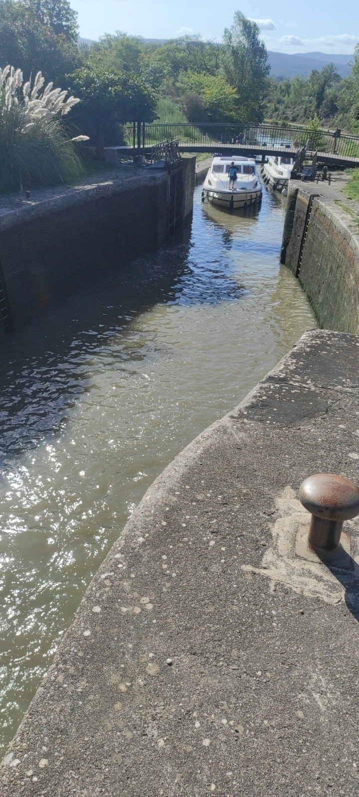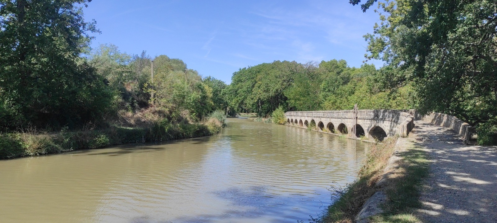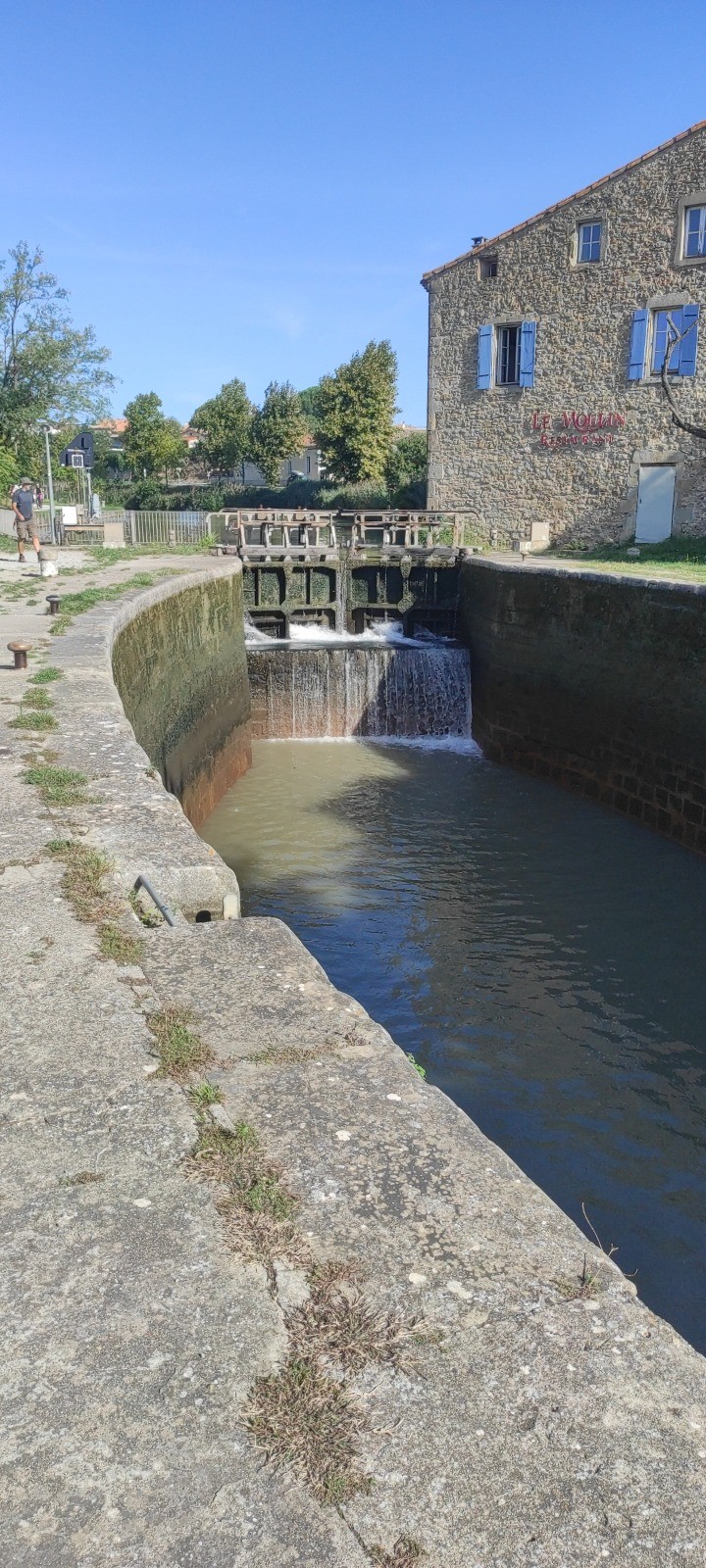 Je roule beaucoup et m'arrête aux écluses, certaines sur plusieurs niveaux. Le terrain est toujours du chemin mais globalement assez roulant. J'irais finalement assez près de bezier. Peu de commerces et de café d'ouverts. J'ais fait le plein pour la soirée et même demain.