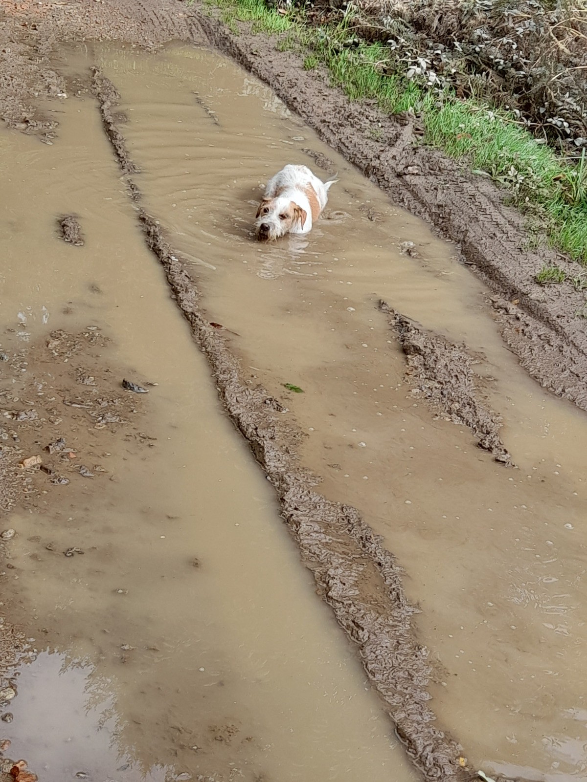 Les chemins au milieu des châtaigneraies nous indiquent que les champignons 🍄poussent, les mauvais laissent présager le meilleur. Quelques flaques d'eau pour le plus grand plaisir des unes, petite pose avec le pot de colle et une petite toilette de boue ensuite.