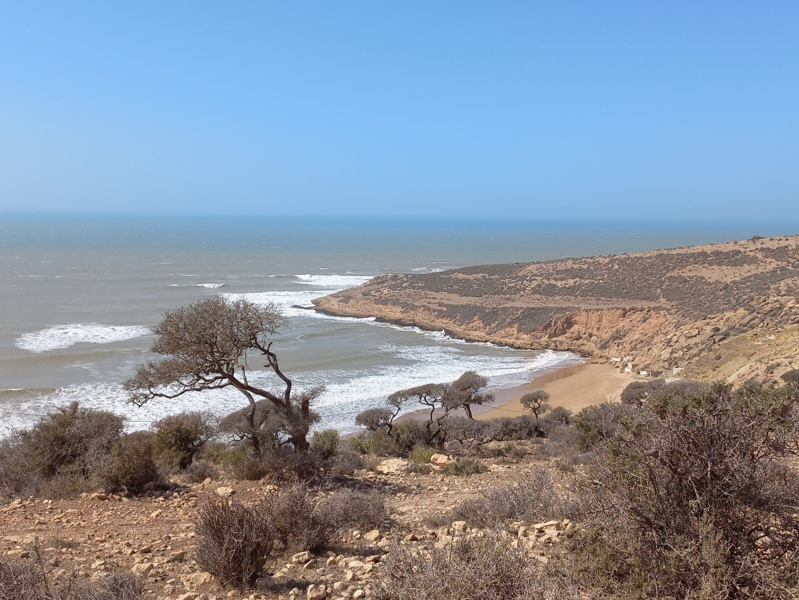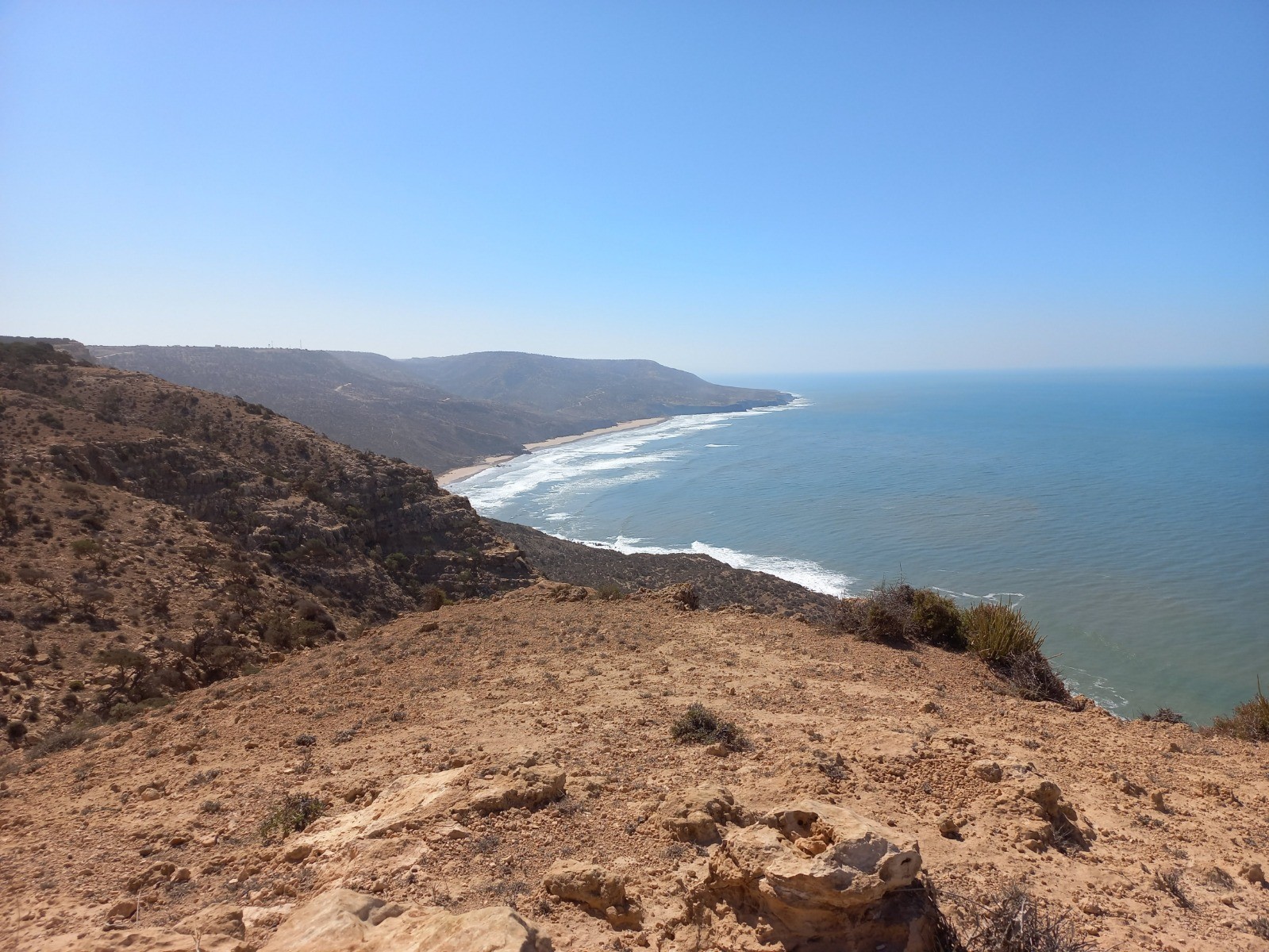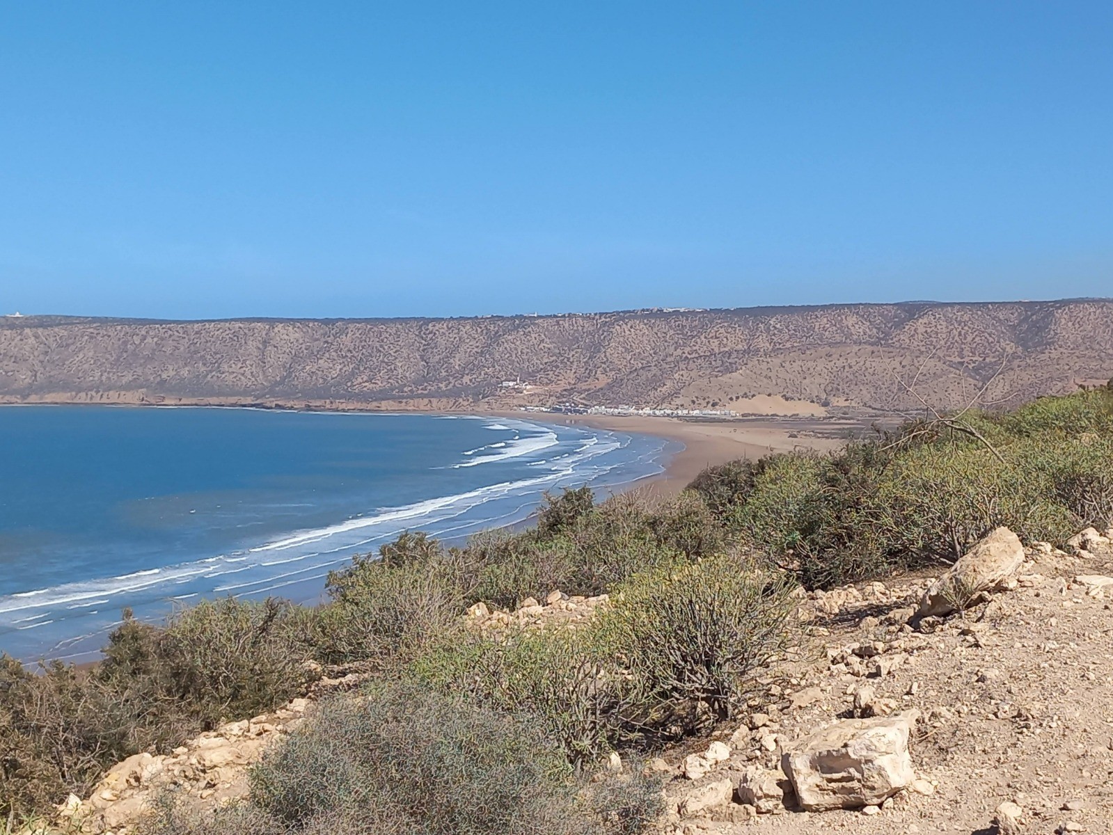 Points remarquables : L'arrivée sur Sidi Kaouki, avec sa très belle plage. Au loin, le phare et le village de Ouassane.