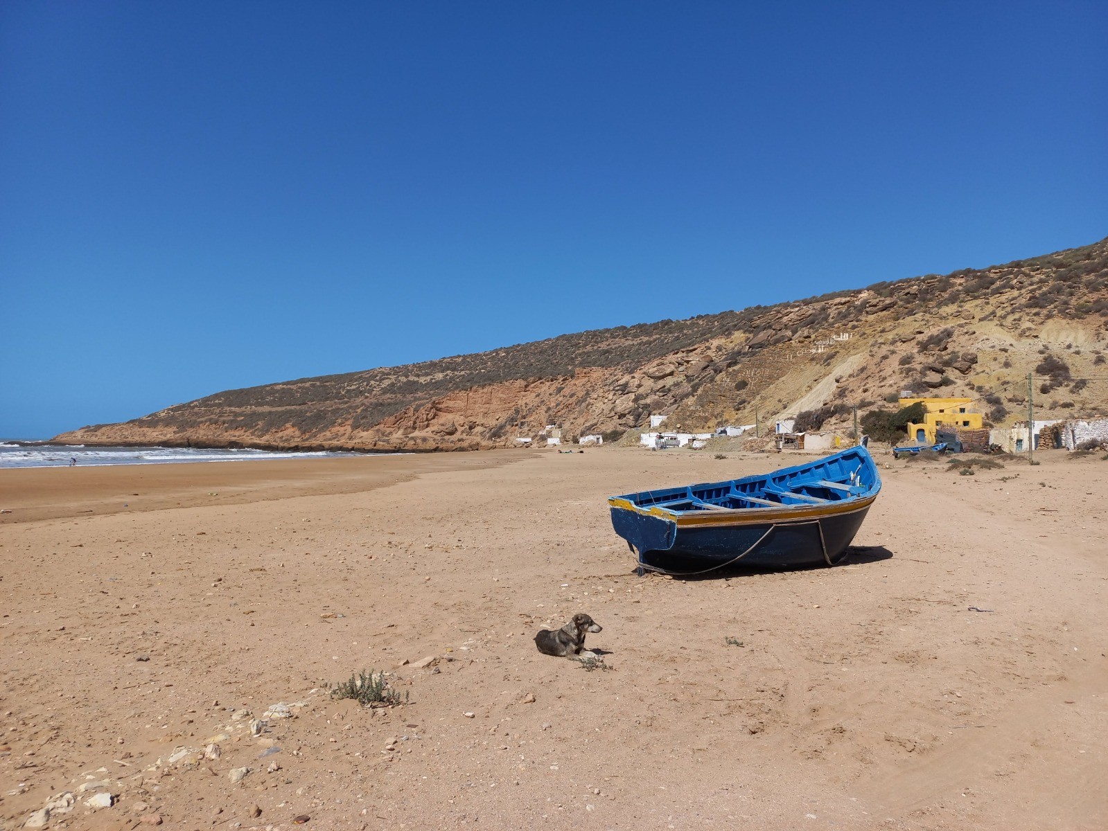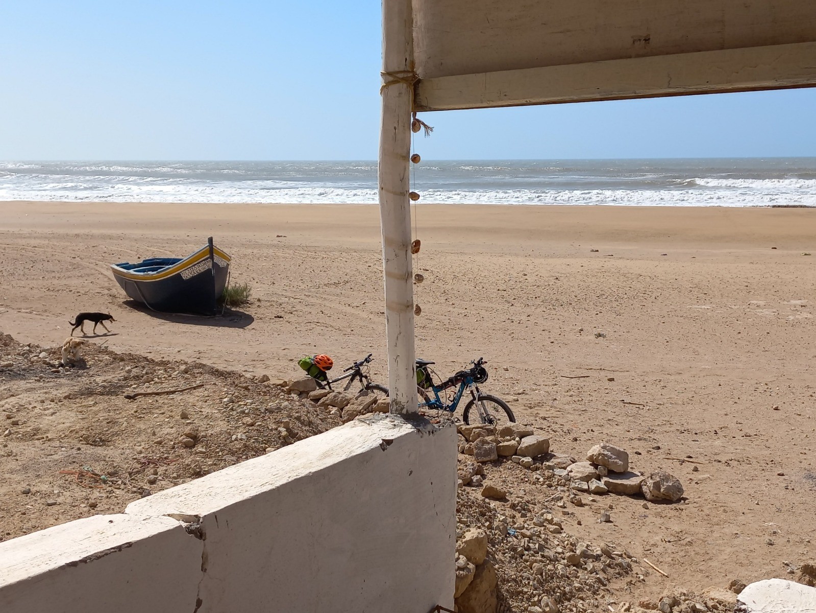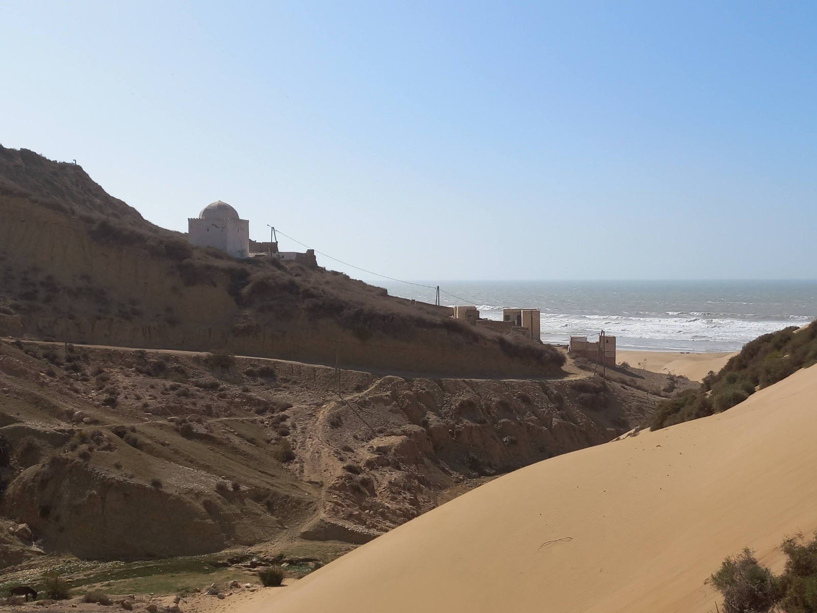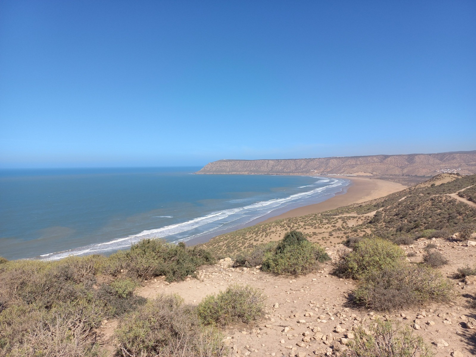 Points remarquables : L'arrivée sur Sidi Kaouki, avec sa très belle plage. Au loin, le phare et le village de Ouassane.
