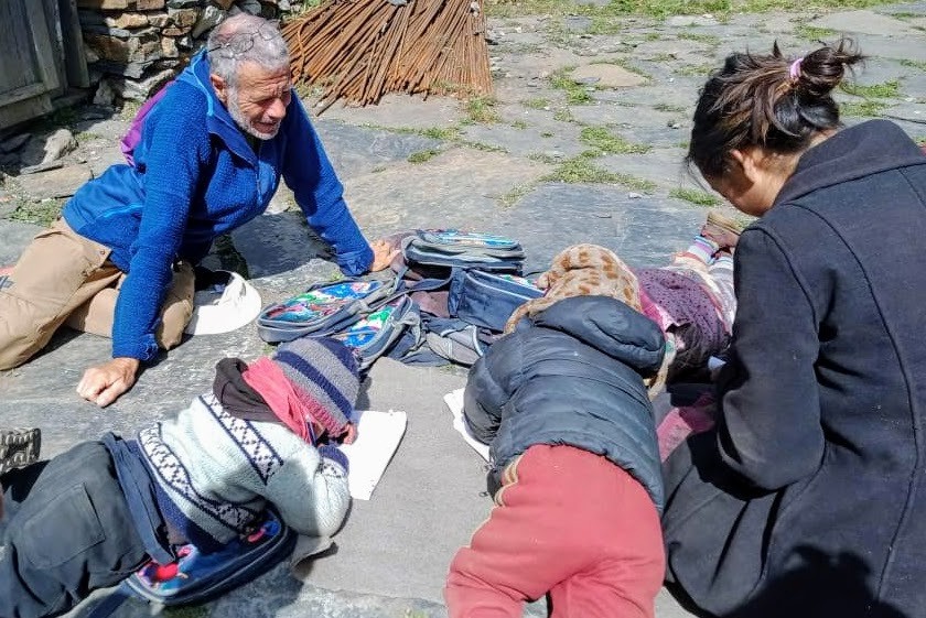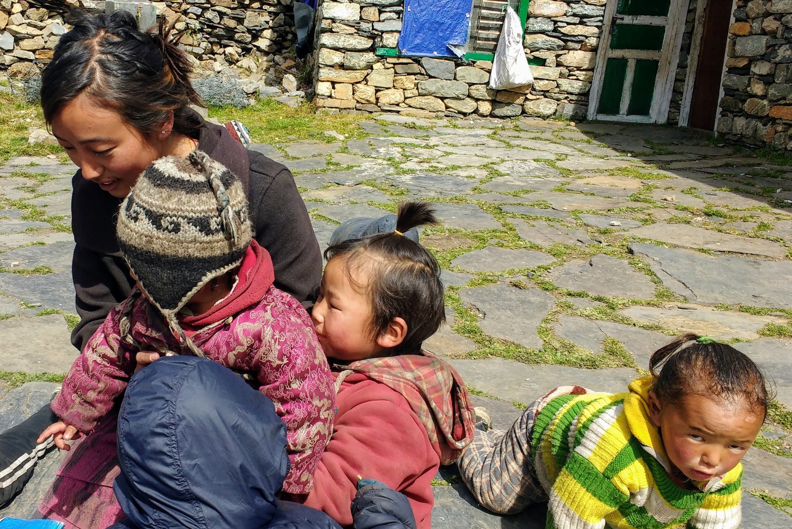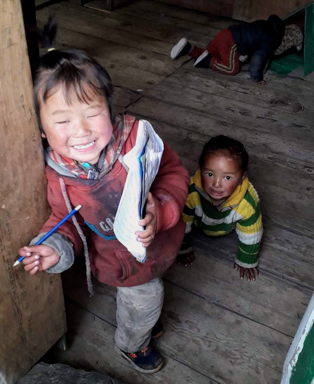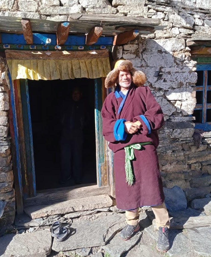 Aujourd'hui, ballade conduite par Tsiring en direction du Samdo peak. Il fait très beau, mais froid. Nous avons une vue superbe sur les sommets alentours (Ganesh himal, himal chauli, Manaslu et Nakya peak). Au retour visite de l'école de Samdo ou un dizaine de bambins de 3 à 5 ans apprennent le tibétain, l'anglais et le népalais avec une maitresse très patiente. En plein air, couchés par terre, ils sont adorables. C'est un apprentissage individualisé. Puis nous nous rendons à la gompa ou Nima (le responsable du village et de l'ONG) nous a dit qu'il y aurai une puja*. En attendant le début de la puja, Nima me déguise en moine, puis on assiste à une partie de la puja. Psalmodies, thé tibétain et tchang*. On s'en va avant les pâtes.